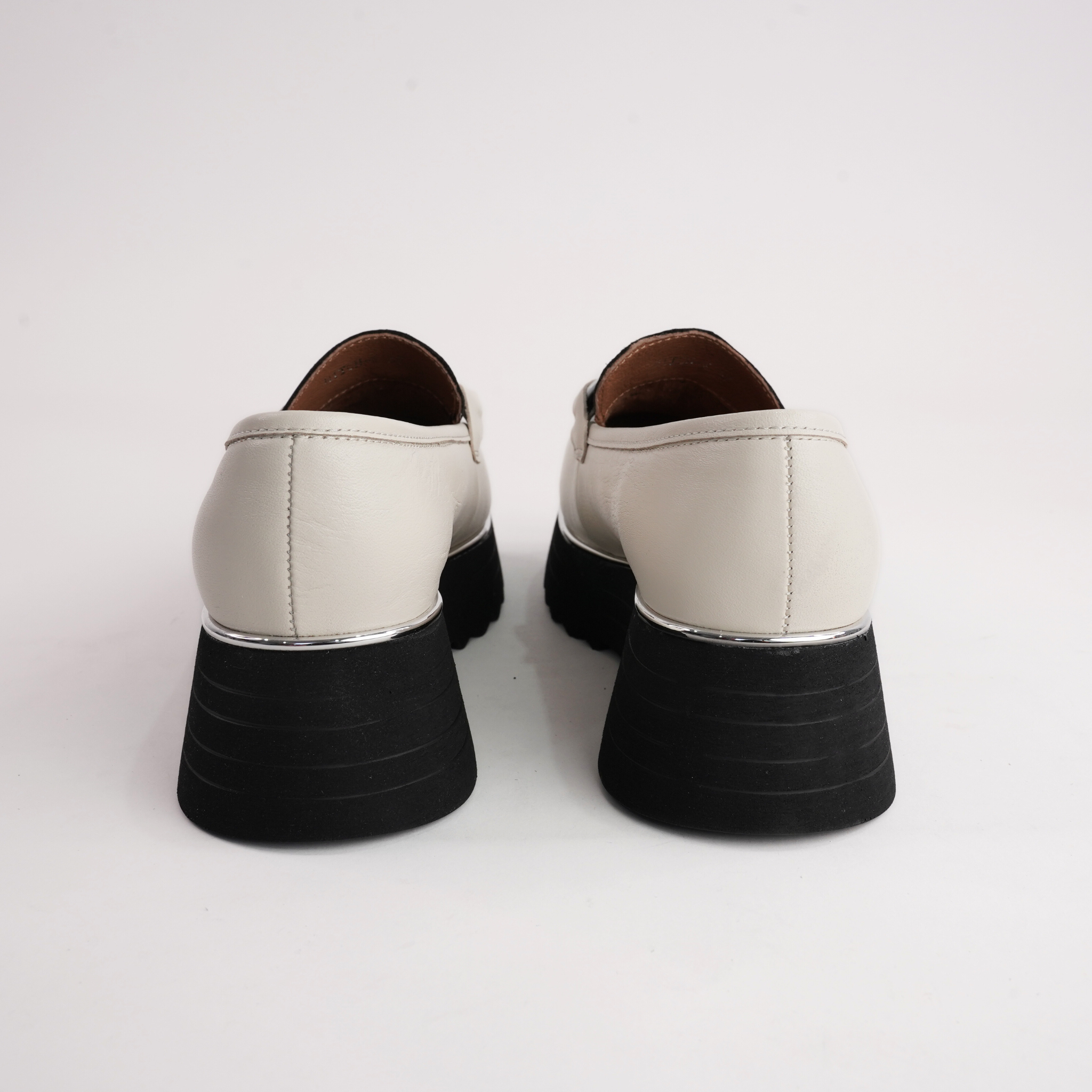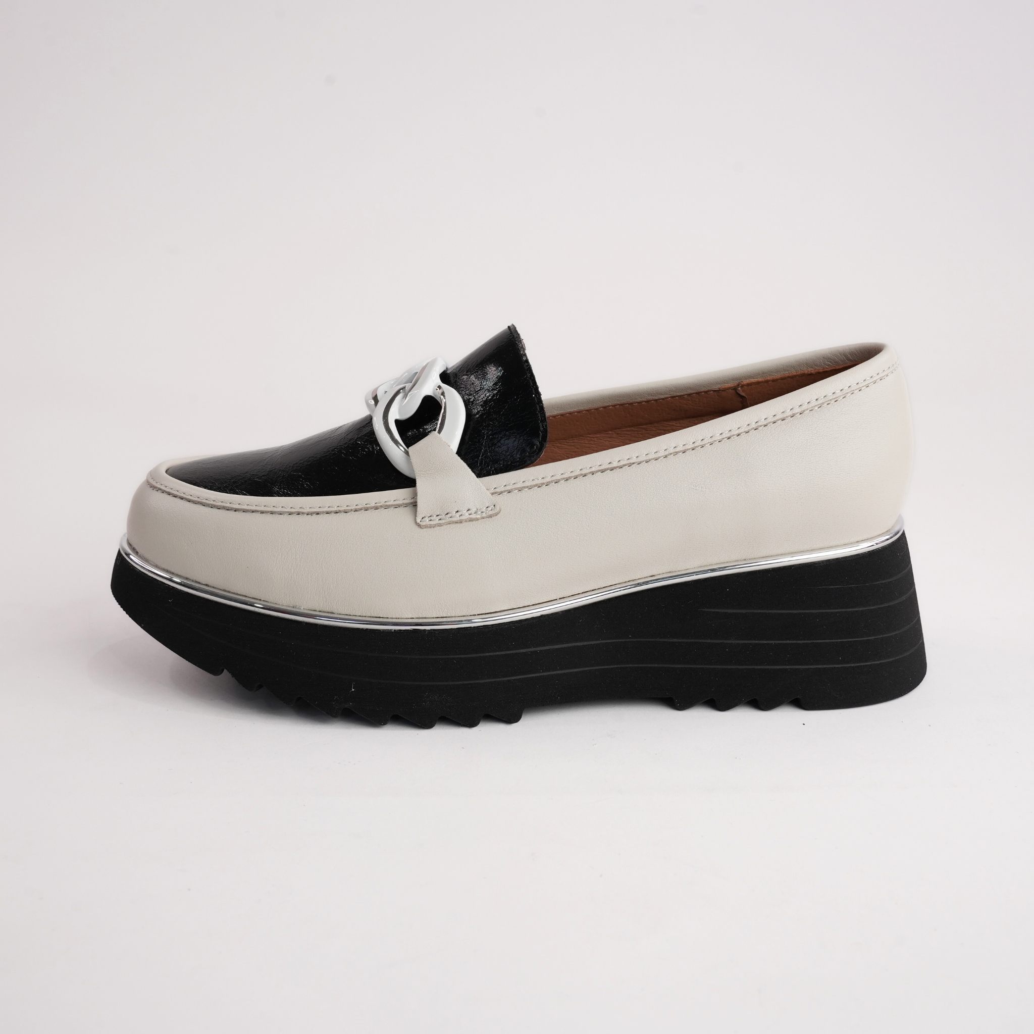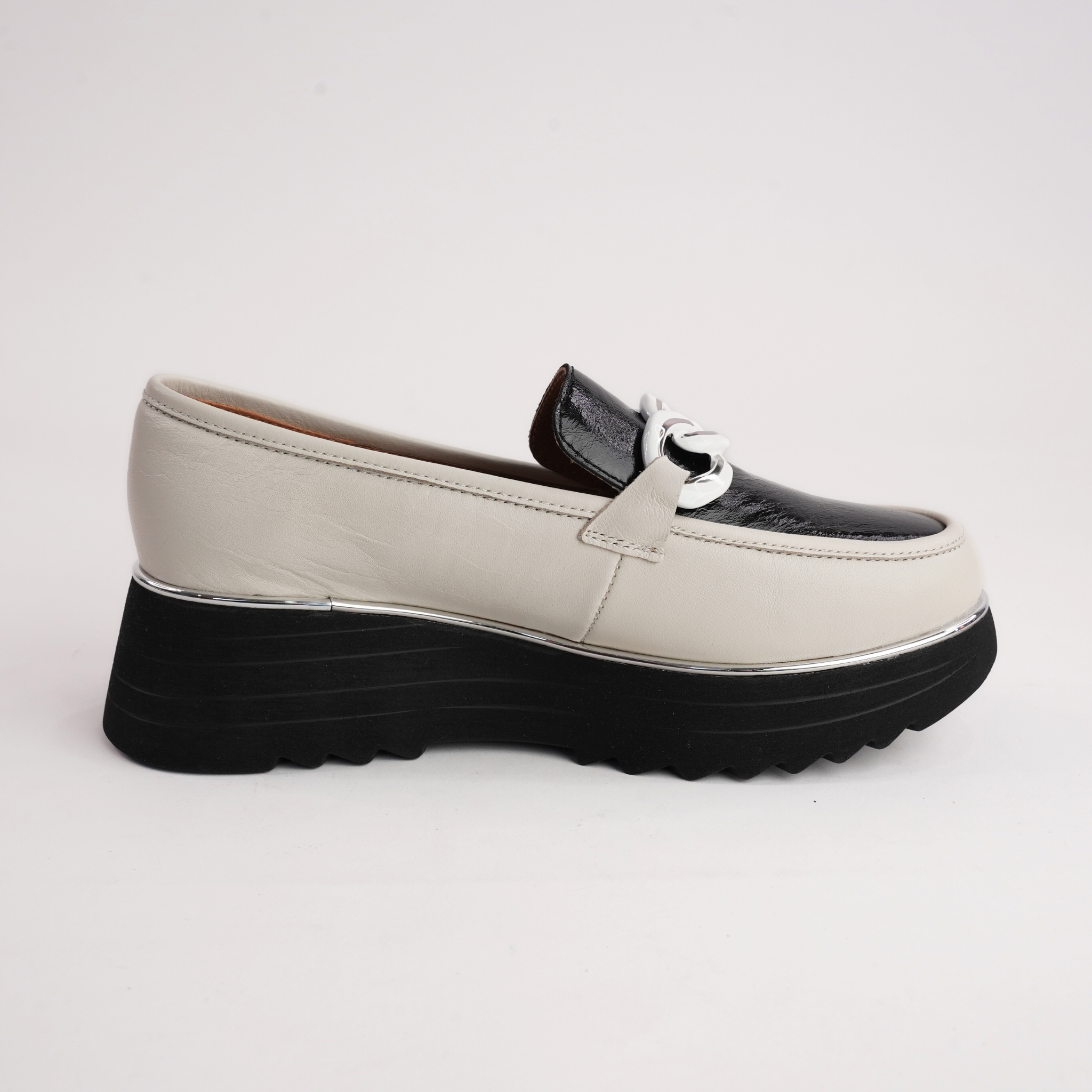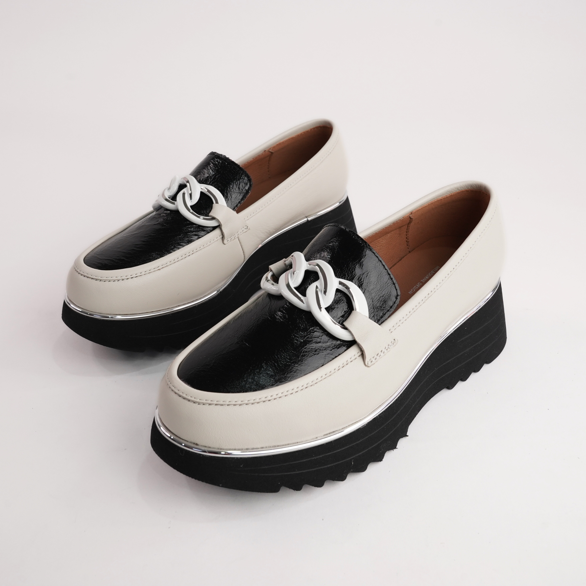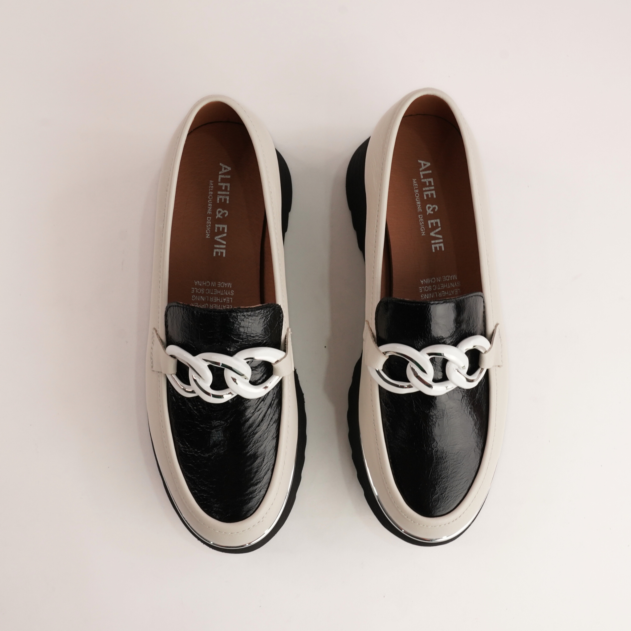 Add a pop of contrast to your everyday look with the Hitch loafers by Alfie & Evie. Featuring a striking mix of cream leather and black patent with a chunky white chain detail, these loafers are the perfect mix of polish and comfort. A soft platform sole adds just the right amount of lift, making them your new go-to for both work and weekends.