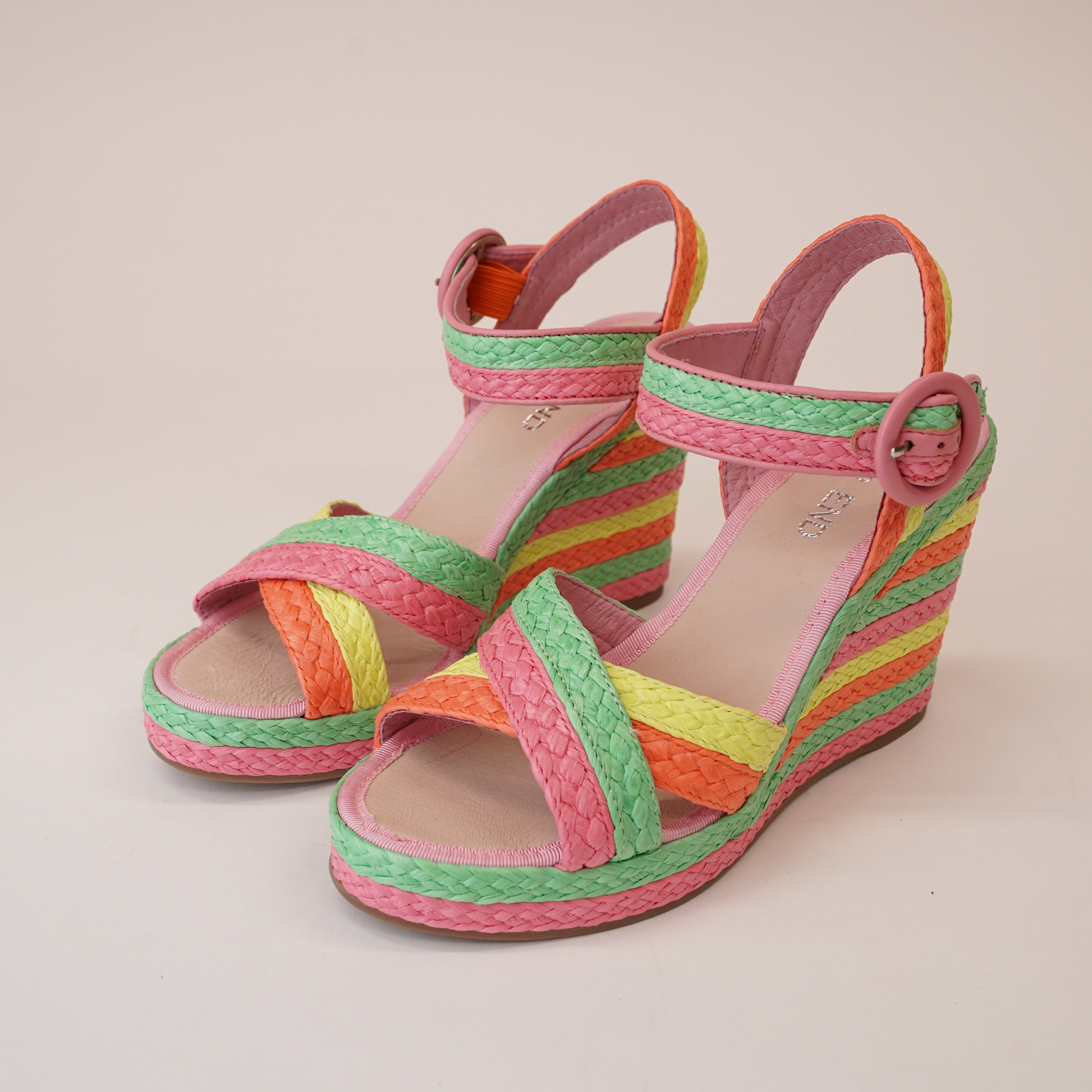 Step into summer with the Erinah Bright Multi Wedges by Top End, a vibrant and playful addition to your wardrobe. These wedges feature bold rainbow-coloured braided straps, adding a fun pop of color to your outfit. The comfortable wedge heel provides height without sacrificing comfort, while the adjustable ankle strap ensures a secure fit. Perfect for beach days, brunch outings, or any occasion that calls for a burst of colour, these wedges will make you stand out in style. Pair them with a flowy dress or jeans for an effortlessly chic look.