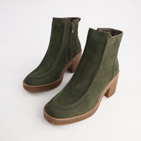Step up your winter style with the Gem boots by Sala. Crafted in soft khaki nubuck leather with contrast stitching and a block heel, they feature an inside zip for easy on-off and a grippy sole for all-day comfort.