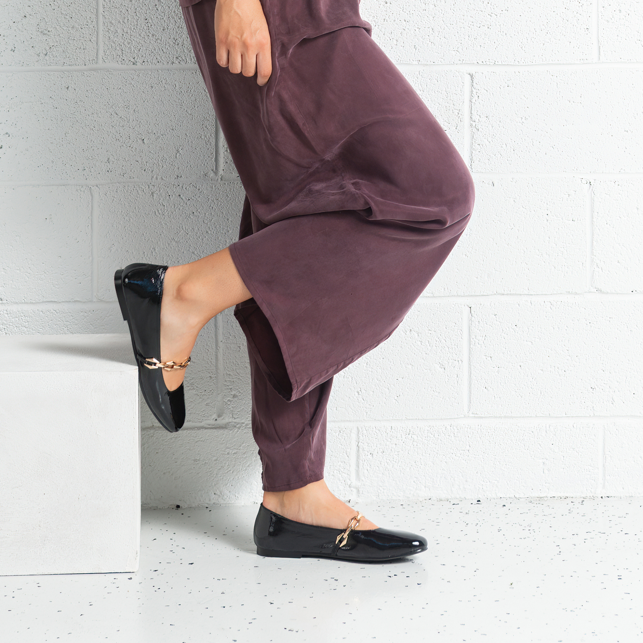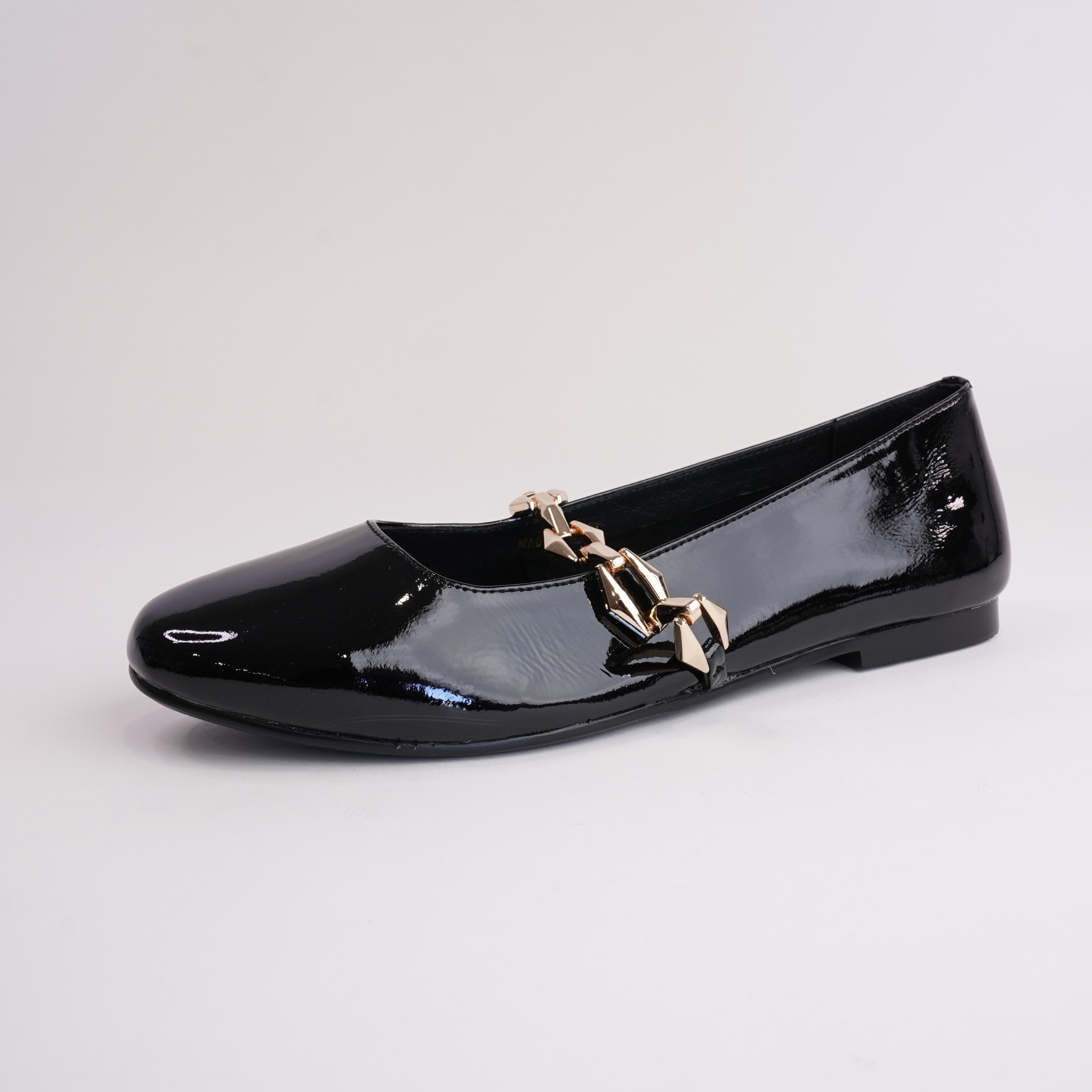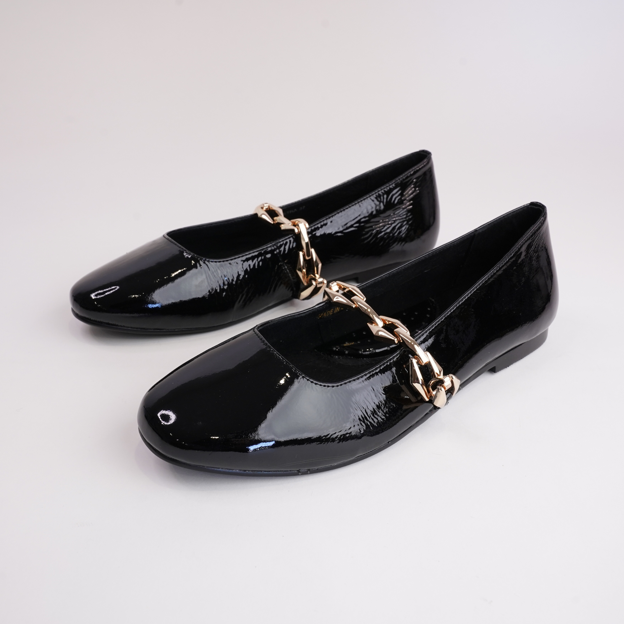 Step into elegance with the Petra Ballet Flats by Bresley. Featuring a sleek black patent leather finish and a bold gold chain detail, these flats bring effortless sophistication to any outfit.