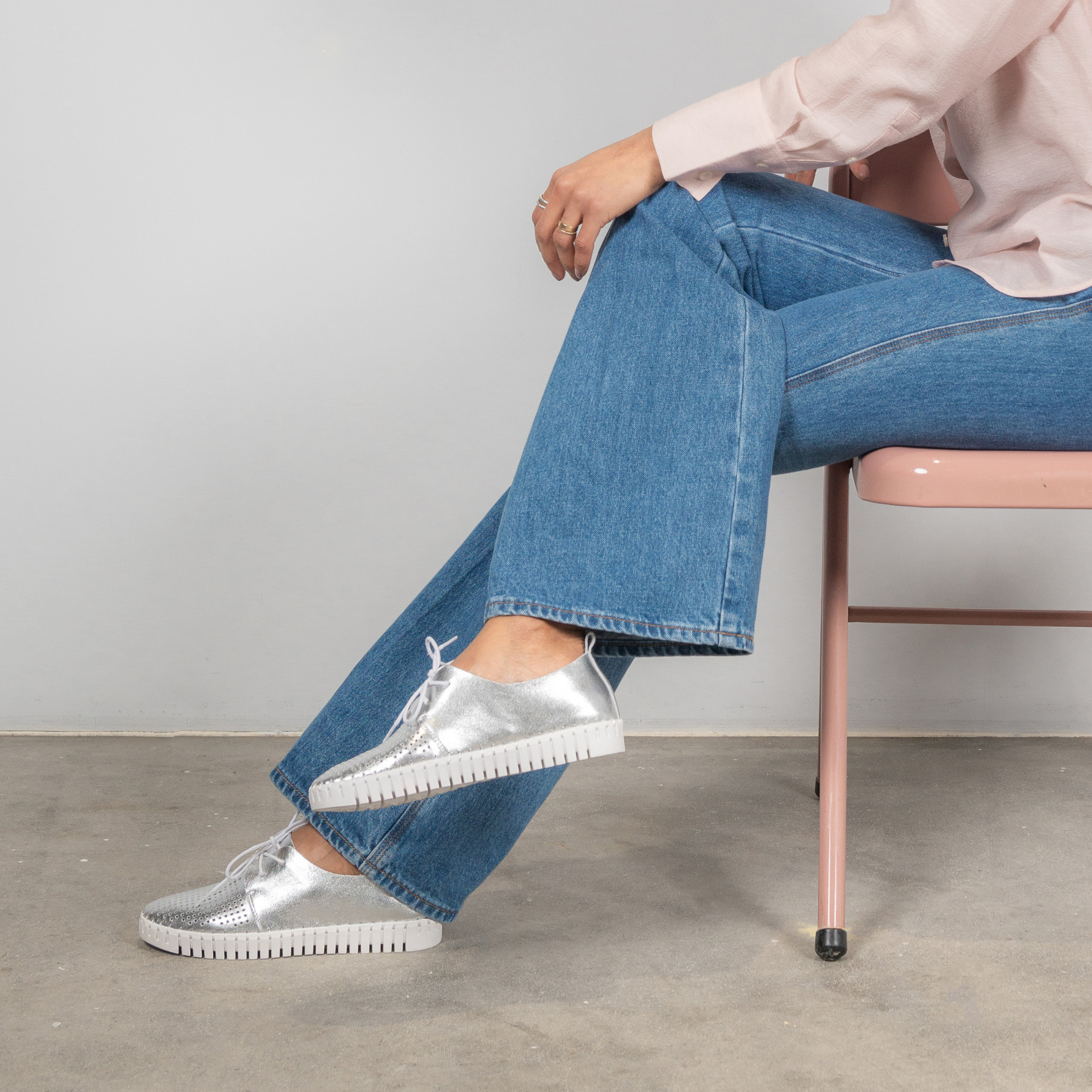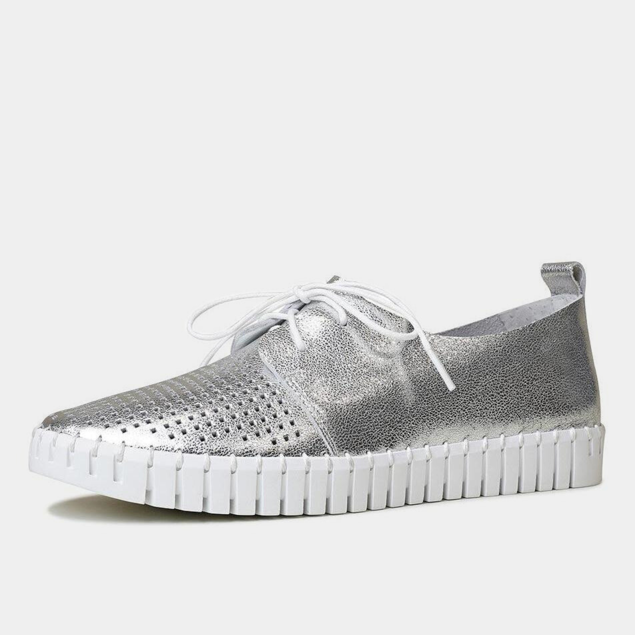 Slip into ultimate comfort and style with Huston Silver Leather Sneakers by Django & Juliette. The luxurious leather upper and lining provide a sleek, premium feel. With a soft and flexible synthetic sole and padded orthotic-friendly insoles, every step is a breeze. Stay grounded and confident with the cleated sneaker sole and breathable, perforated toe. Elevate your footwear game today!