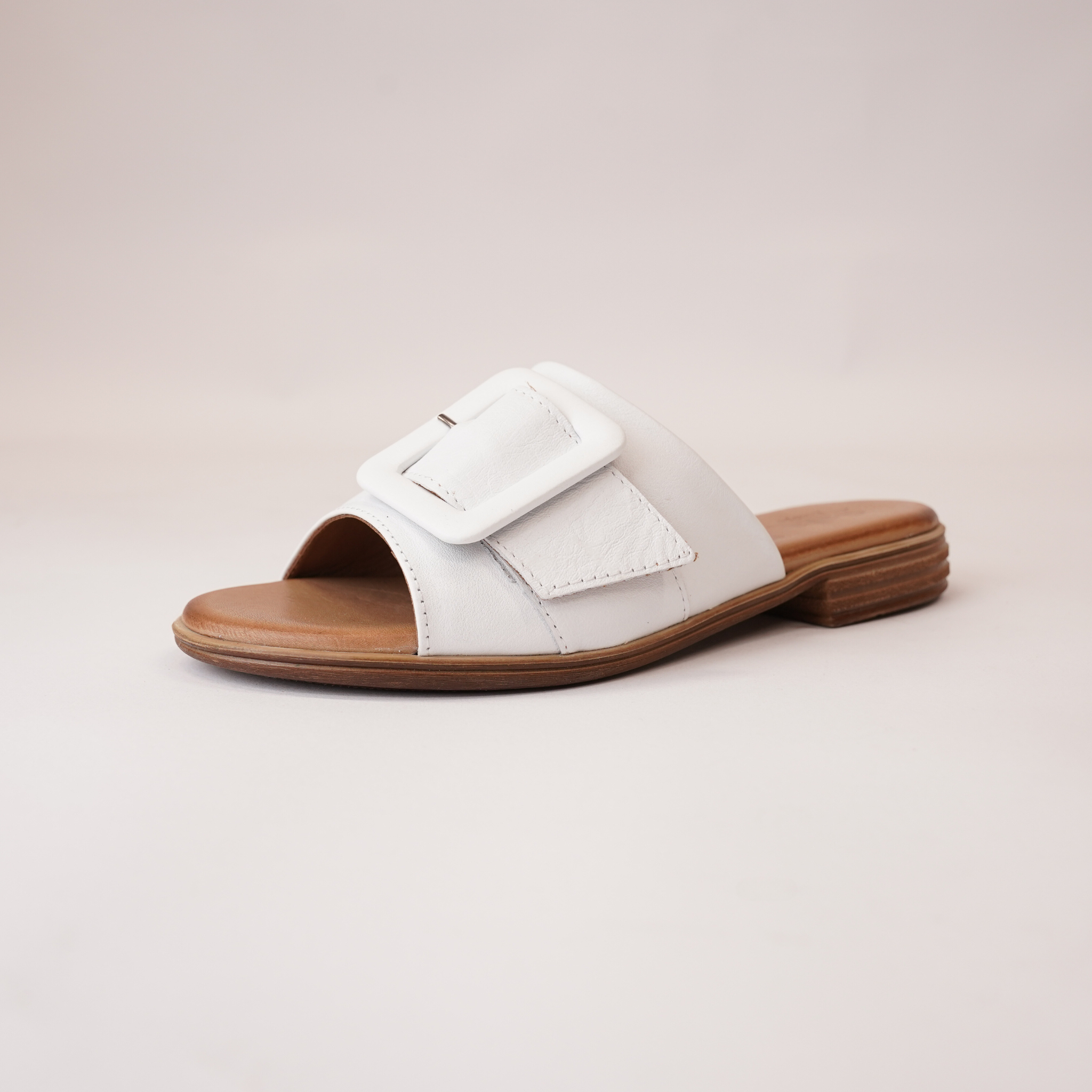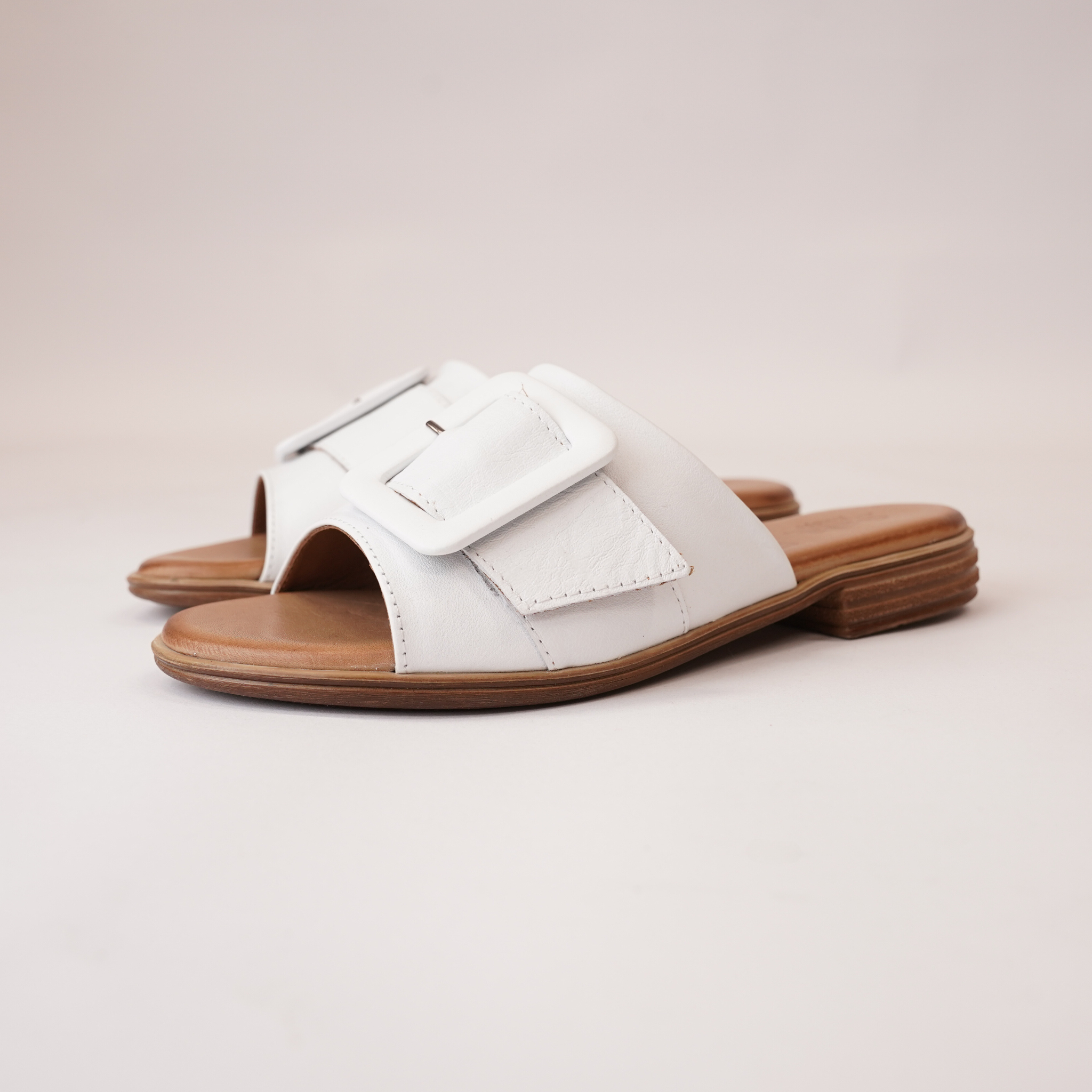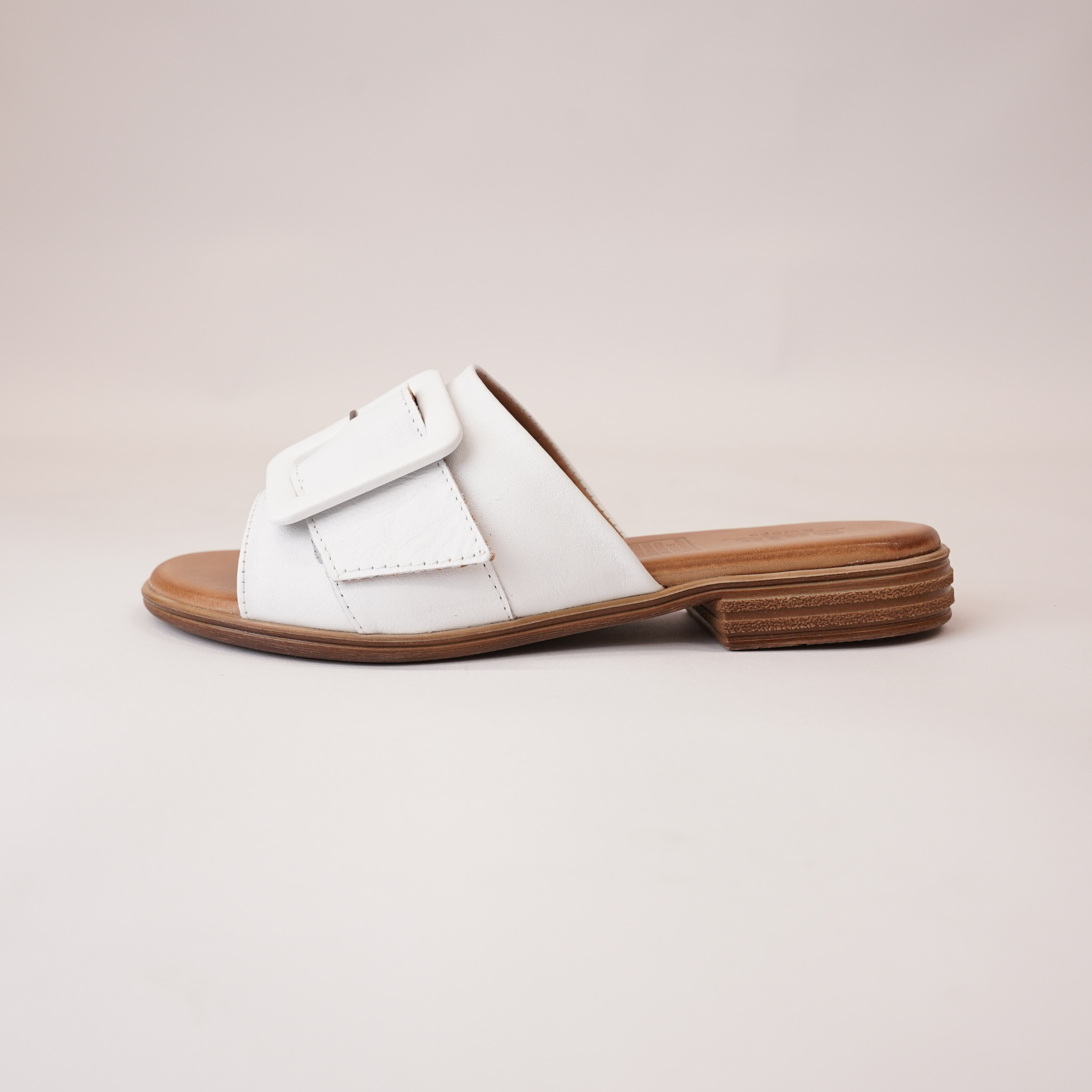 Be effortlessly stylish and comfortable in these Miley White Leather Slides by Sala. Handcrafted in Turkey, the leather upper and lining provide luxurious quality while the non-leather outsole and decorative buckle add a touch of elegance. With a 2cm heel, these slides are perfect for any occasion.