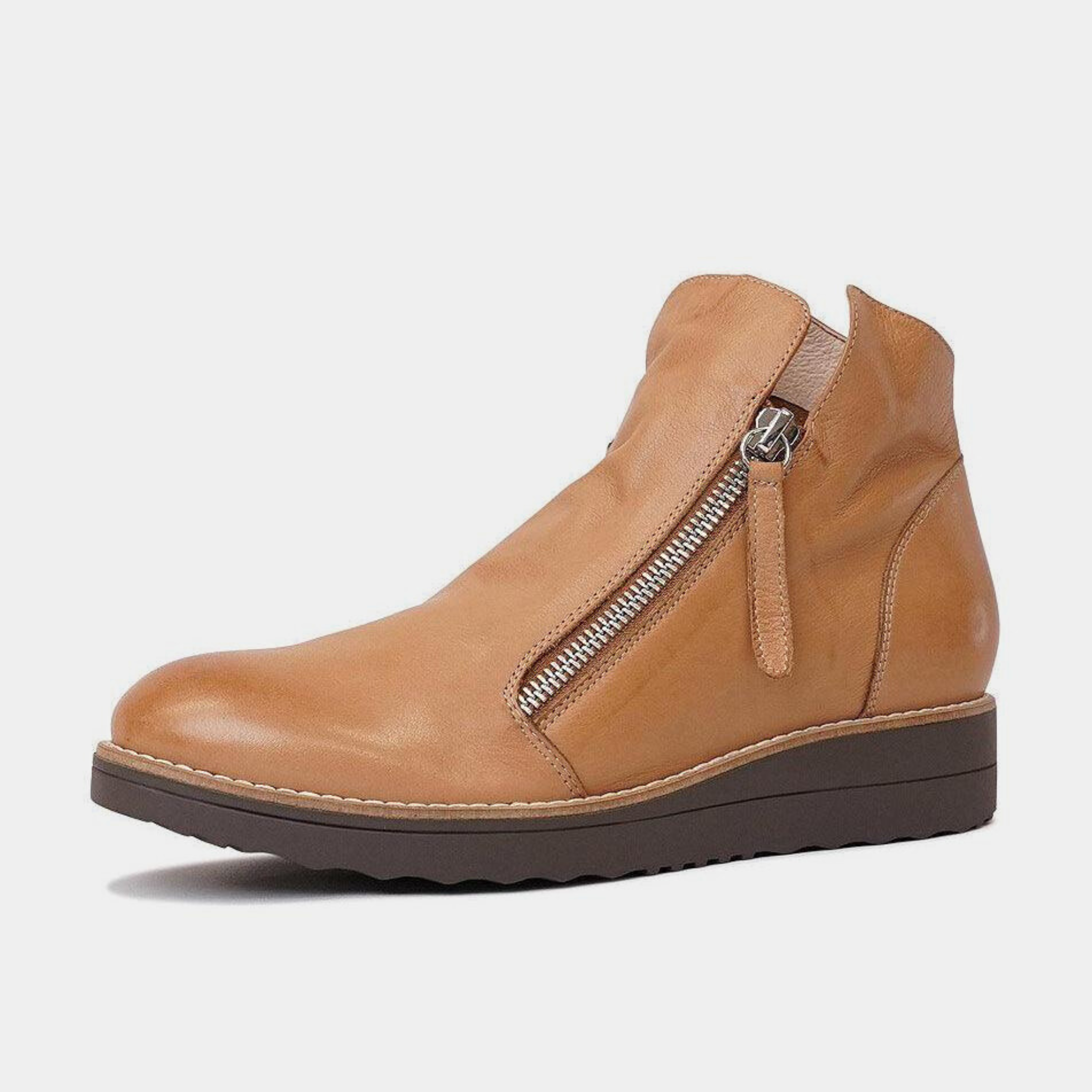 Ohmy Dark Tan/Choc Sole Leather Ankle Boots by Top End are stylish and comfortable designed with a leather upper and lining. The synthetic sole features a 4.5cm inbuilt wedge heel and 1.5cm platform for added height and a padded insole for all-day comfort. The functioning twin zippers add convenience to this fashionable shoe. Expertly crafted to elevate any outfit.