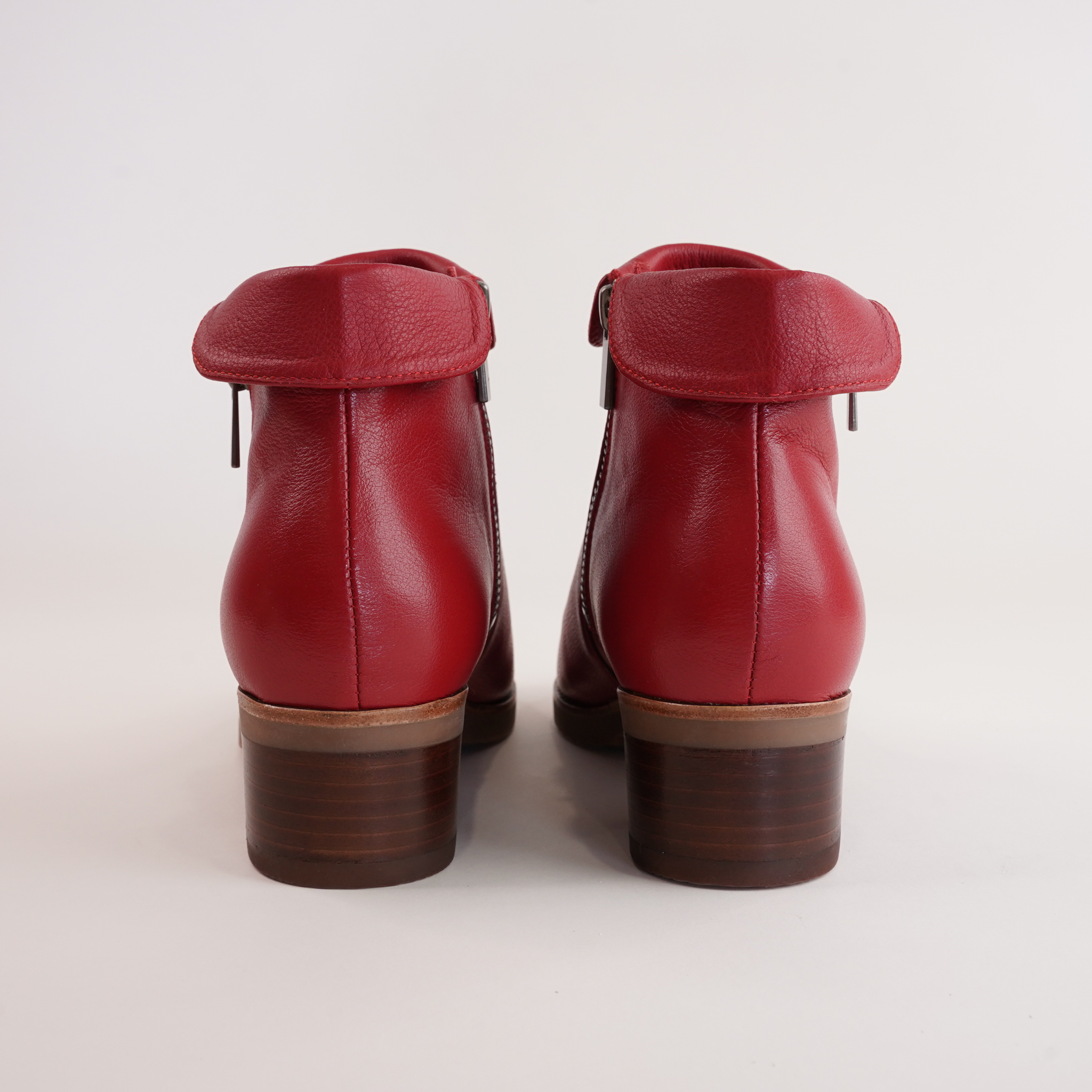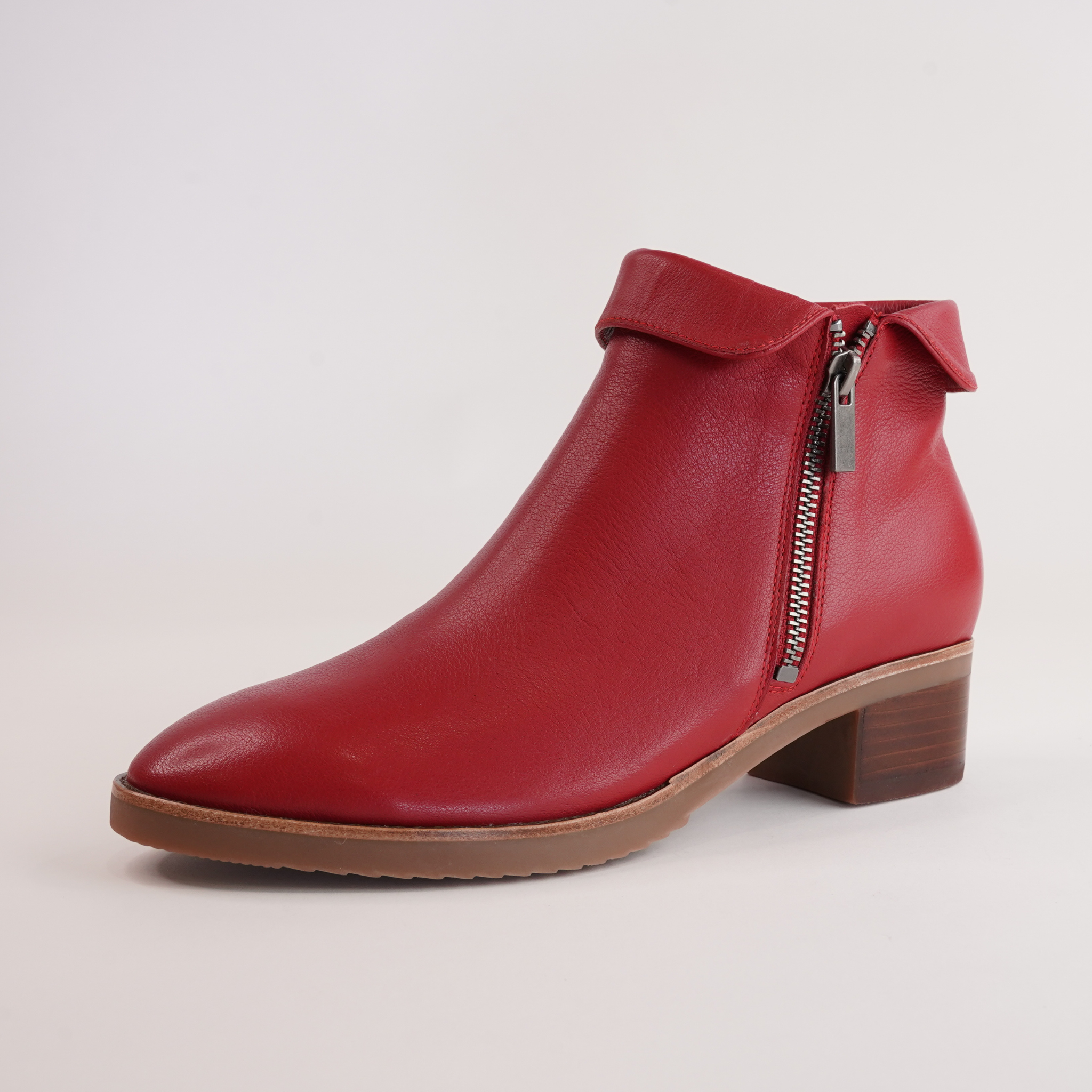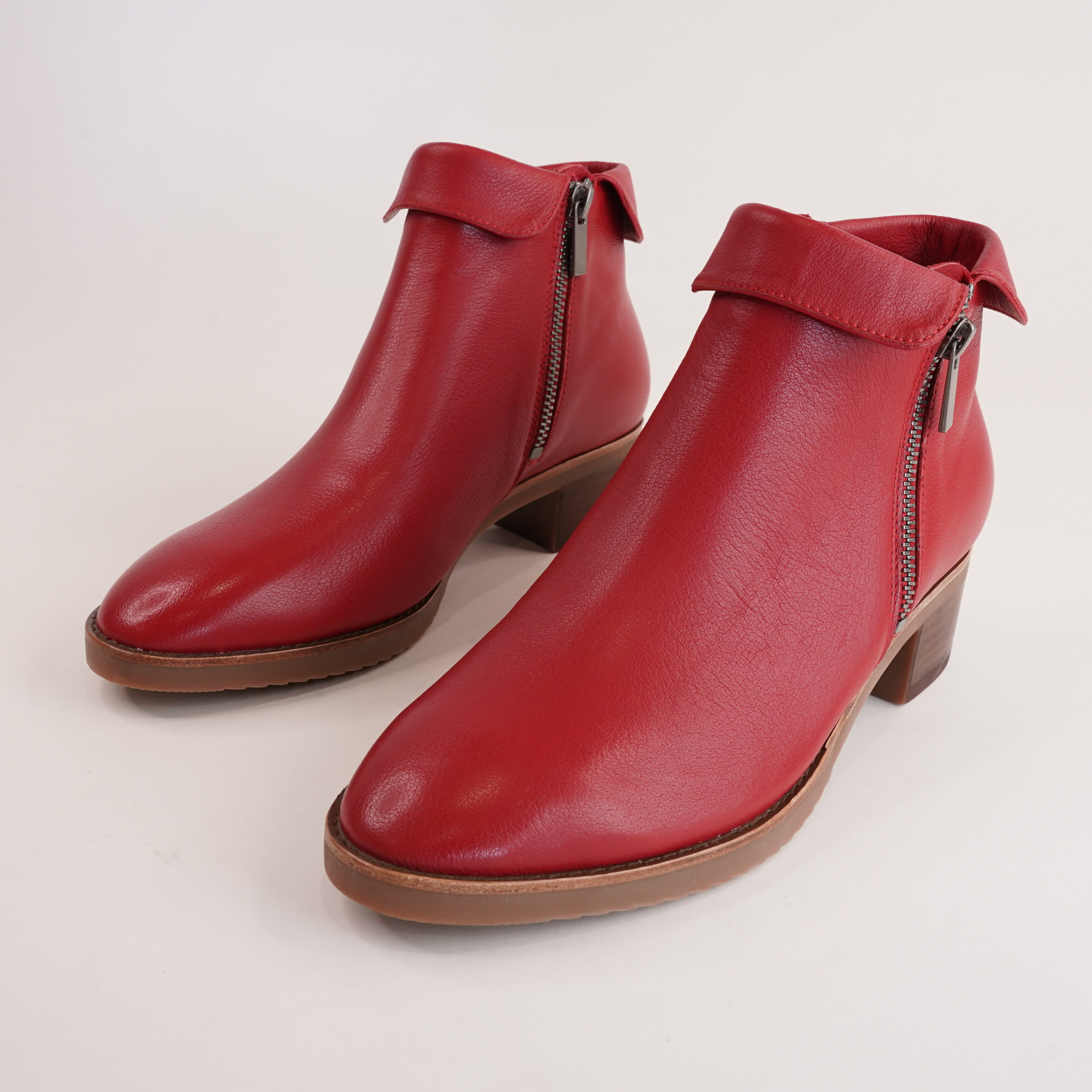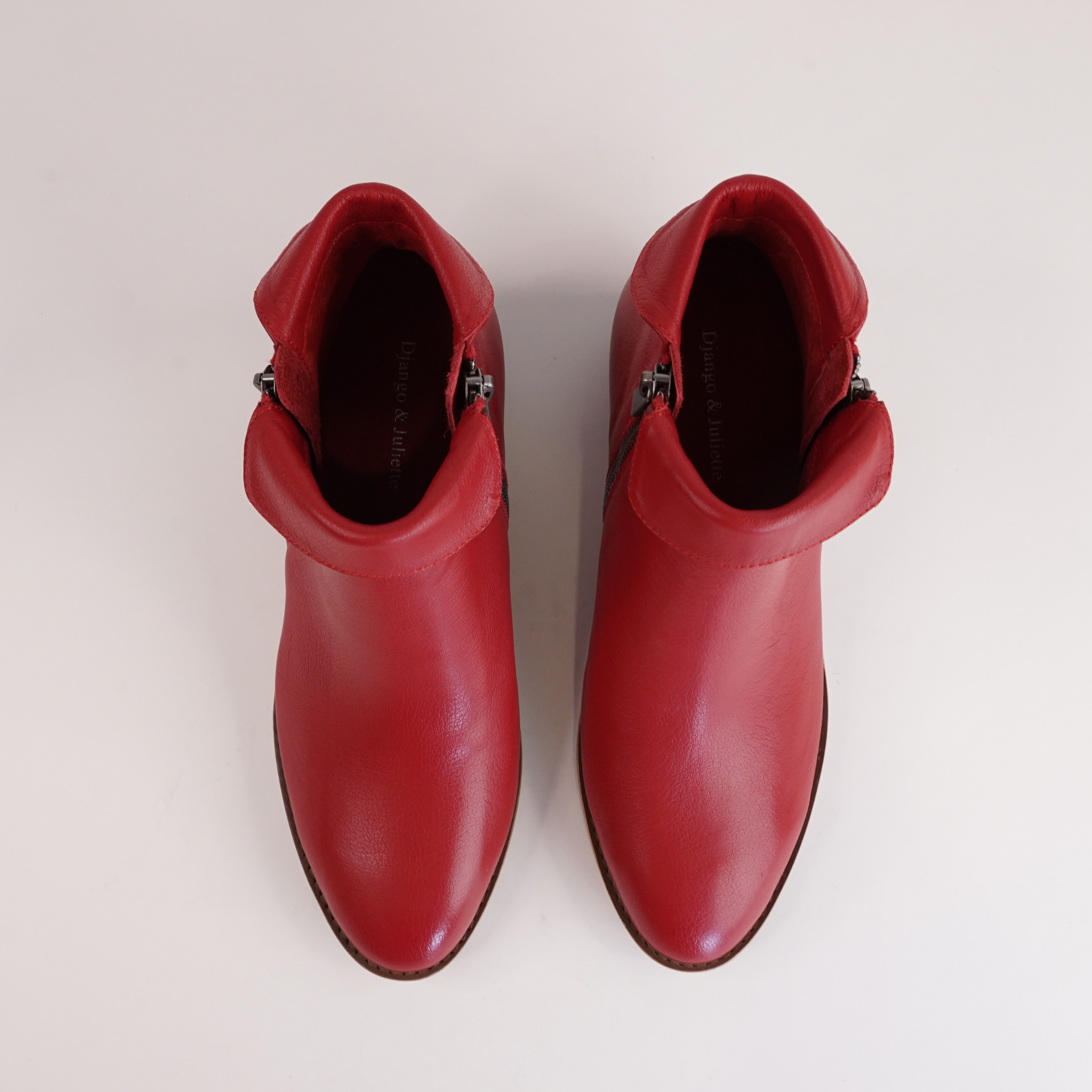 Turn heads with the Two Times Dark Red Leather Ankle Boots by Django & Juliette. Crafted from premium leather, these boots feature a stylish fold-over cuff and a convenient side zip for easy wear. A sturdy mid-block heel offers comfort and stability, while the orthotic-friendly design ensures all-day support. The perfect blend of fashion and function!