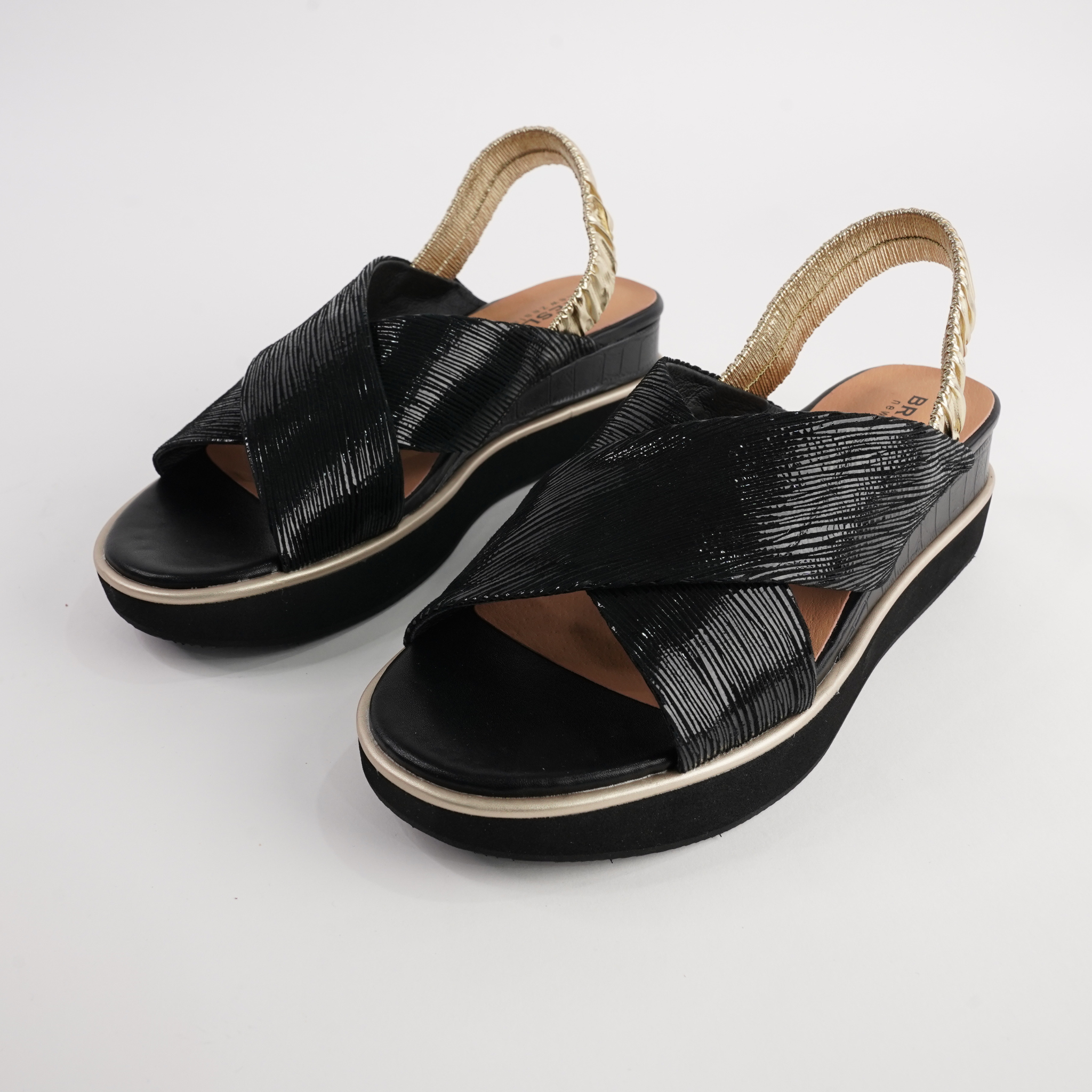 Step into effortless elegance with the Debacle Sandals by Bresley. Featuring criss-cross black leather straps with a subtle textured finish and a striking gold elasticated slingback, this style balances everyday comfort with standout appeal. The cushioned footbed and supportive flatform sole make them a versatile option for both casual and dressy summer looks.