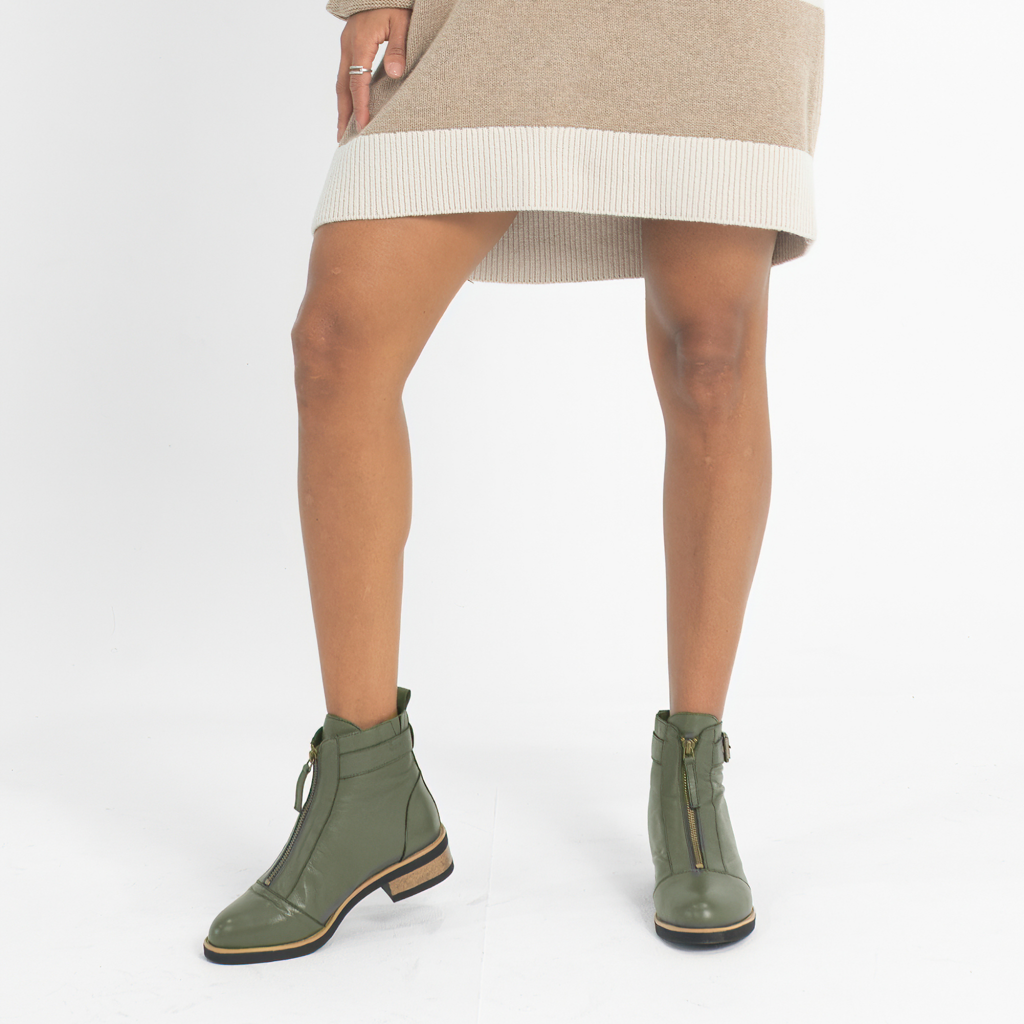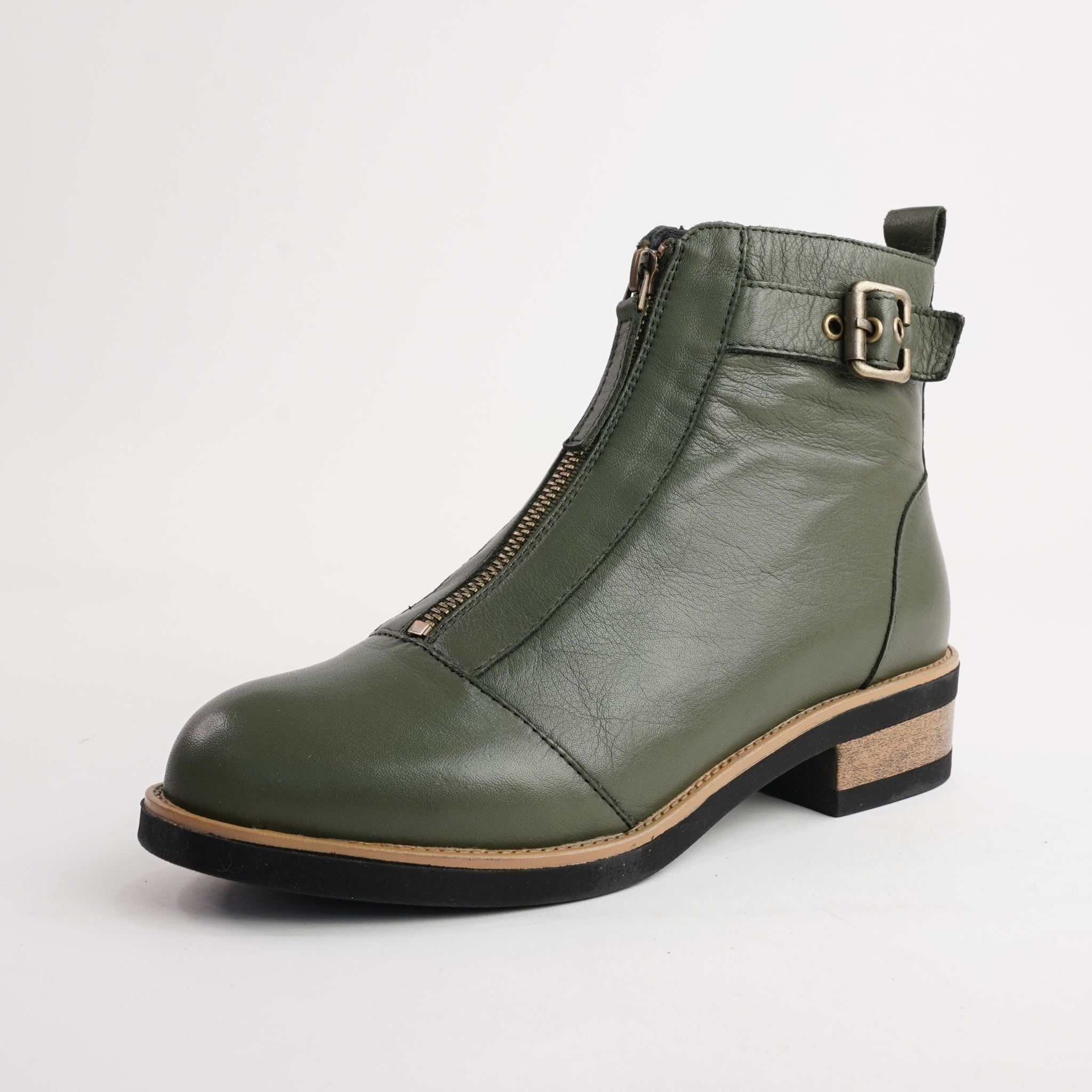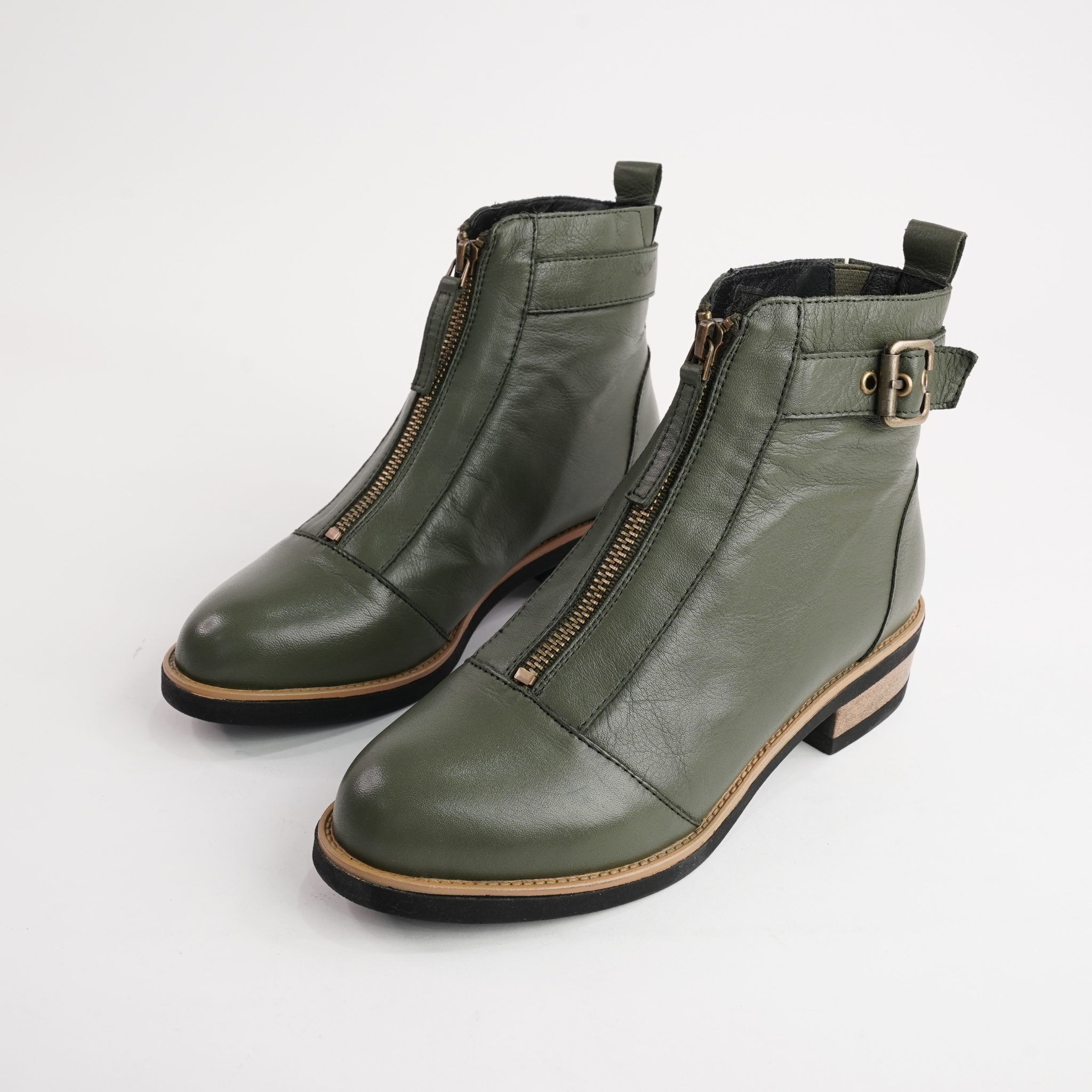 Sleek, sophisticated, and effortlessly wearable—the Dooley Olive Leather Ankle Boots by Bresley are a must-have. Designed with a front zip for convenience, a statement buckle, and a sturdy low heel, these boots offer both style and function. The cushioned insole ensures comfort, making them perfect for day-to-night wear.