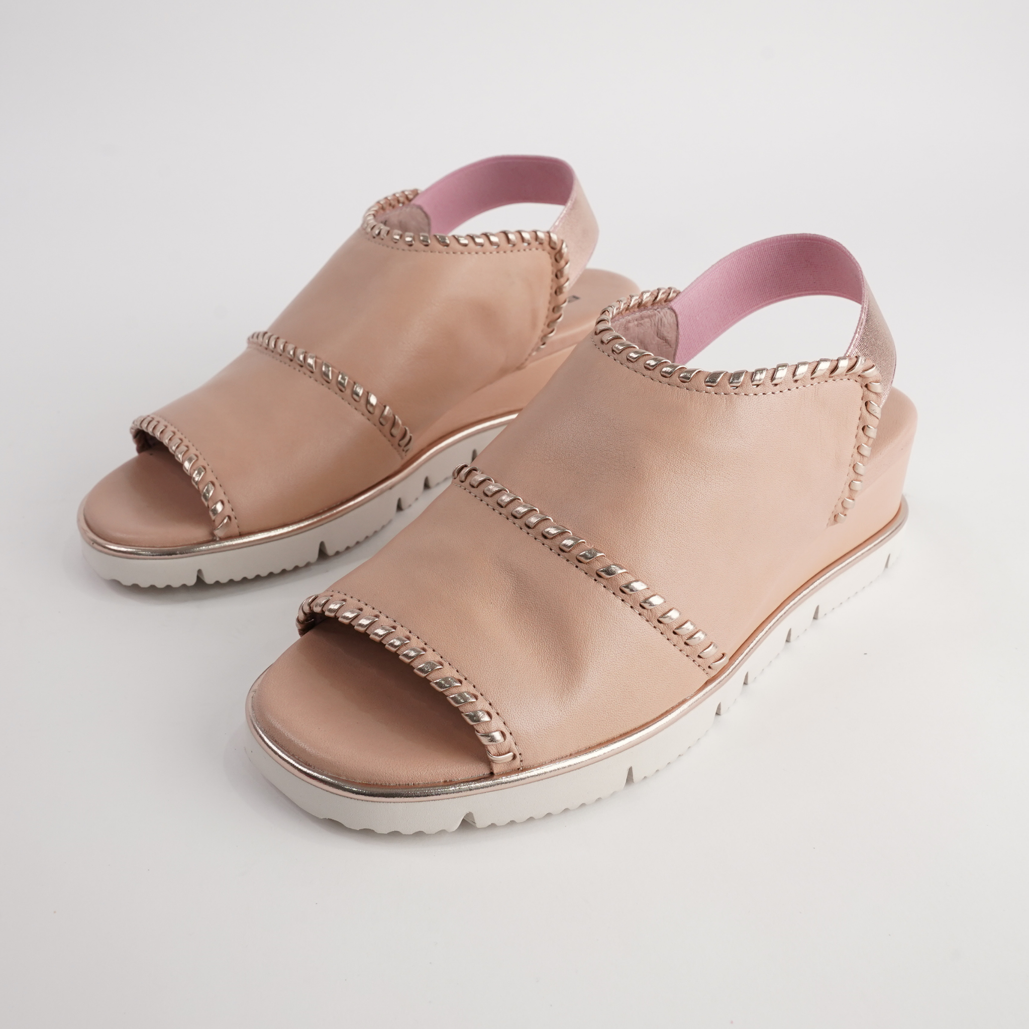 Add effortless elegance to your wardrobe with the Sigma Sandals by Bresley. Crafted in a soft powder pink leather with rose gold accents, these sandals feature chic whipstitch detailing for a touch of sophistication. The elasticated slingback offers a secure fit, while the cushioned insole and lightweight wedge sole deliver all-day comfort. A versatile style that easily transitions from day to night.