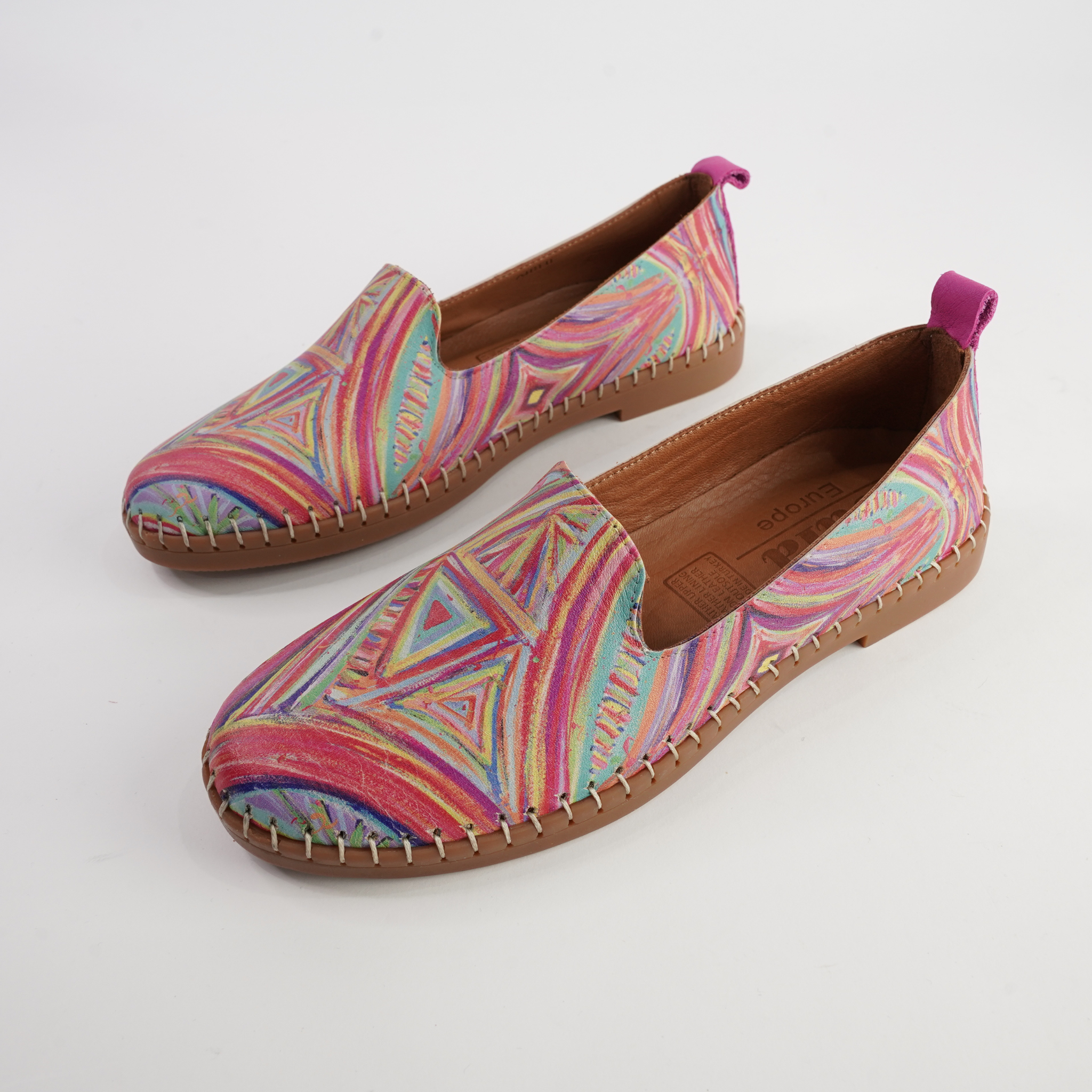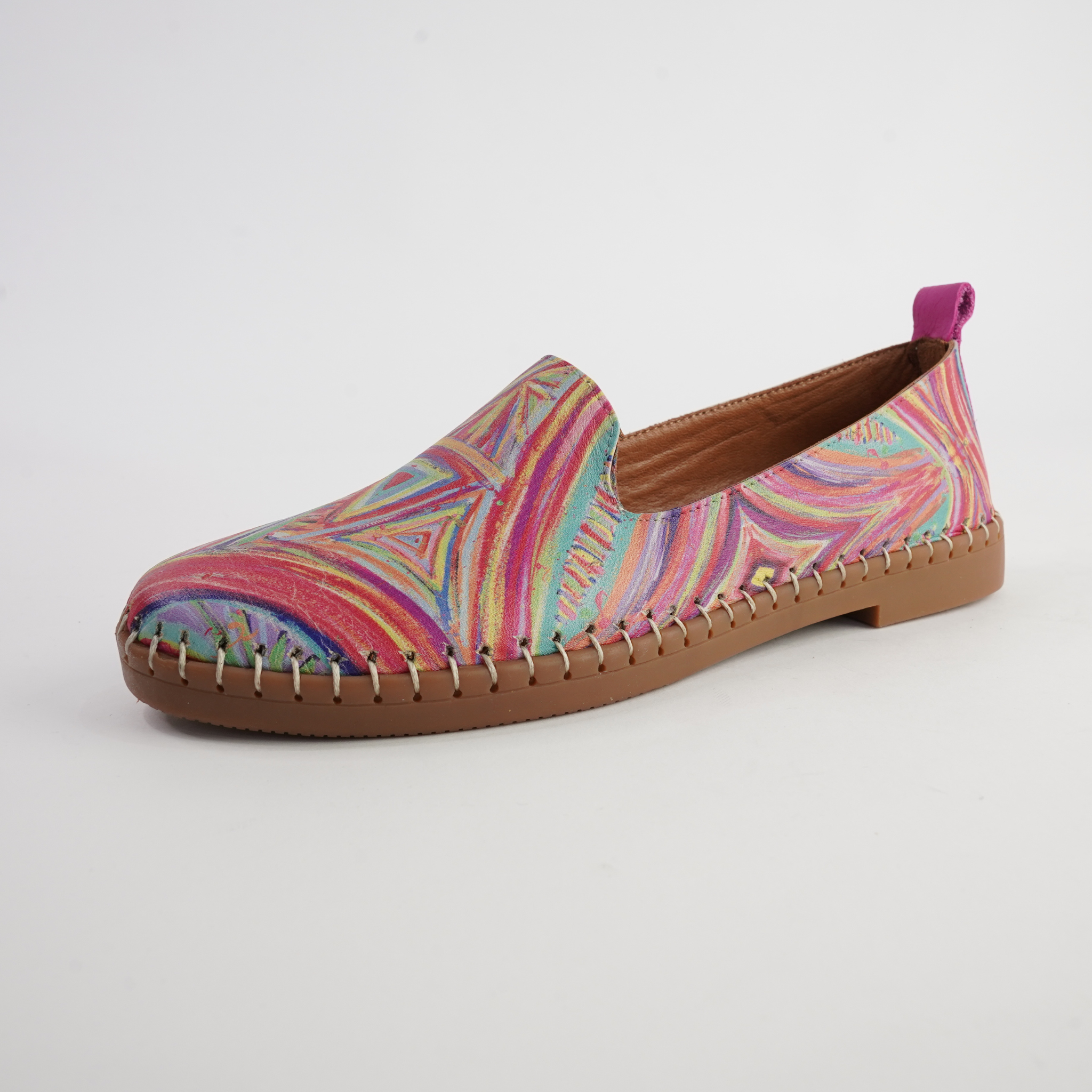 Add a playful pop of colour to your everyday wardrobe with the Airlie Kaleidoscope Multi Leather Flats by Sala. Designed with vibrant geometric swirls in rainbow hues, these flats are the perfect statement shoe for those who love comfort with personality. Crafted from premium leather with a soft lining and flexible sole, Airlie ensures easy all-day wear while keeping your style effortlessly unique. Whether paired with denim, linen, or a casual summer dress, these flats bring an instant touch of colour and fun to any outfit.