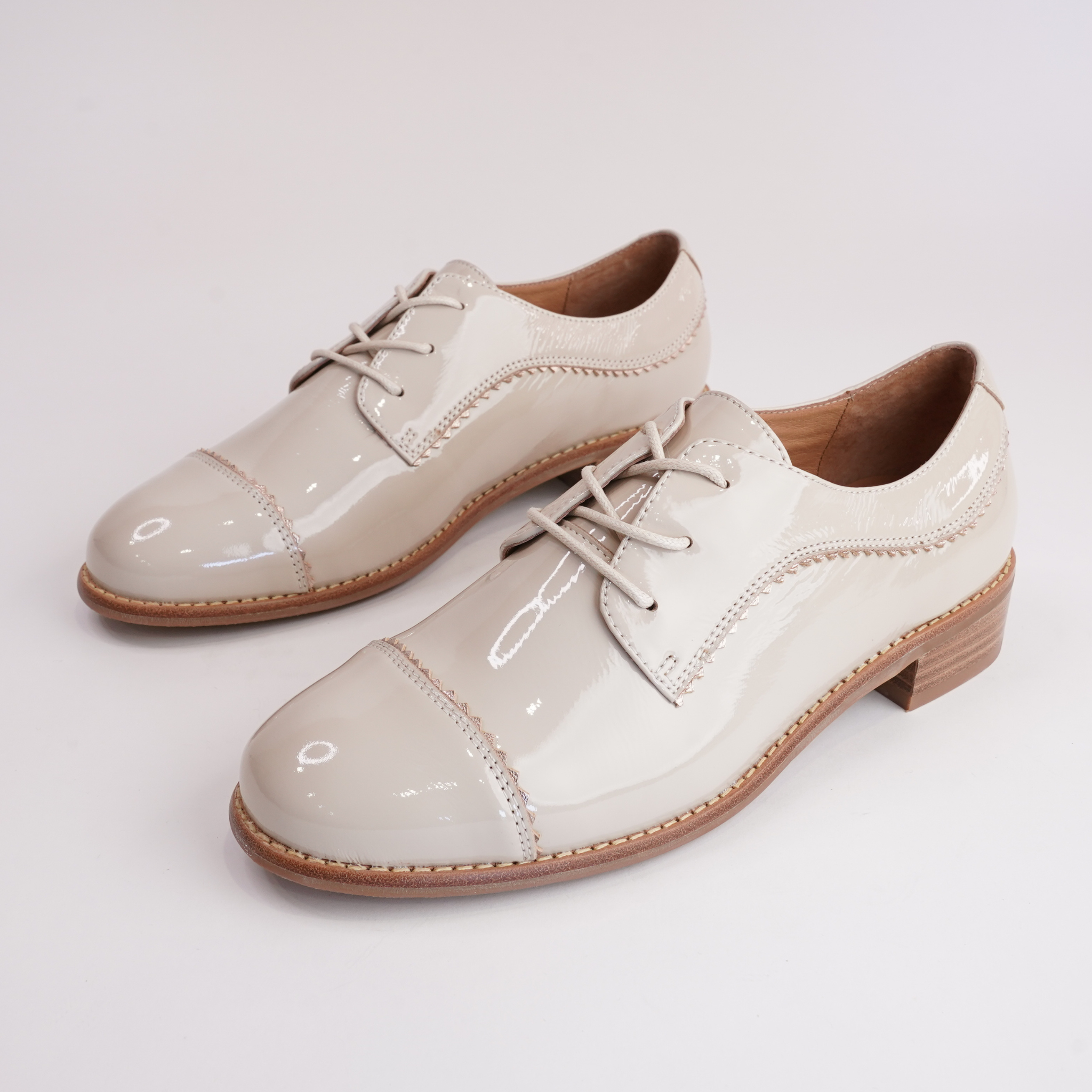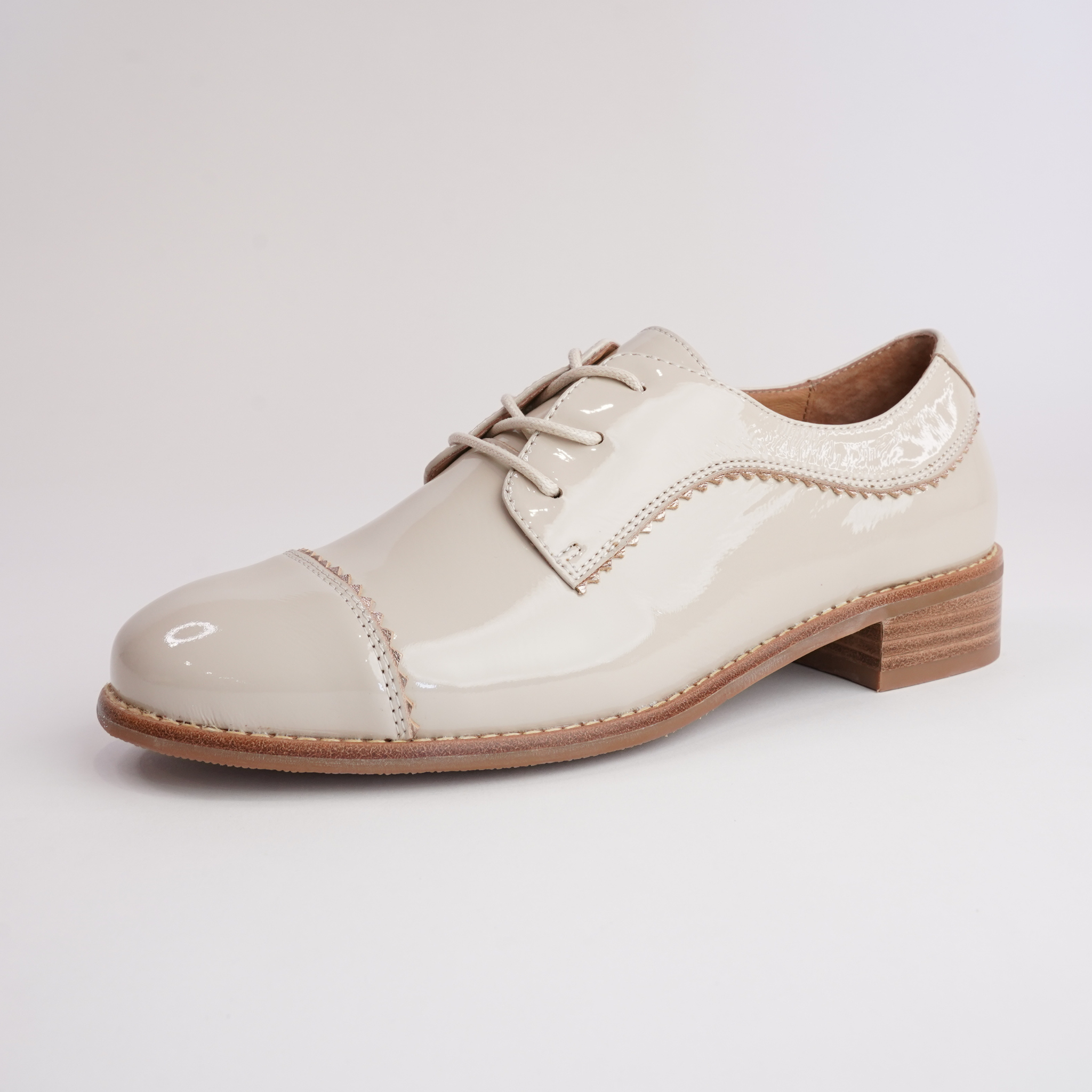Timeless and refined, the Alpopo Lace-up Flats by Bresley bring a polished touch to your wardrobe. Featuring a glossy nude patent leather upper with brogue-inspired detailing and a cap toe, these shoes blend classic sophistication with modern versatility. The stacked block heel and cushioned insole ensure comfort for all-day wear.