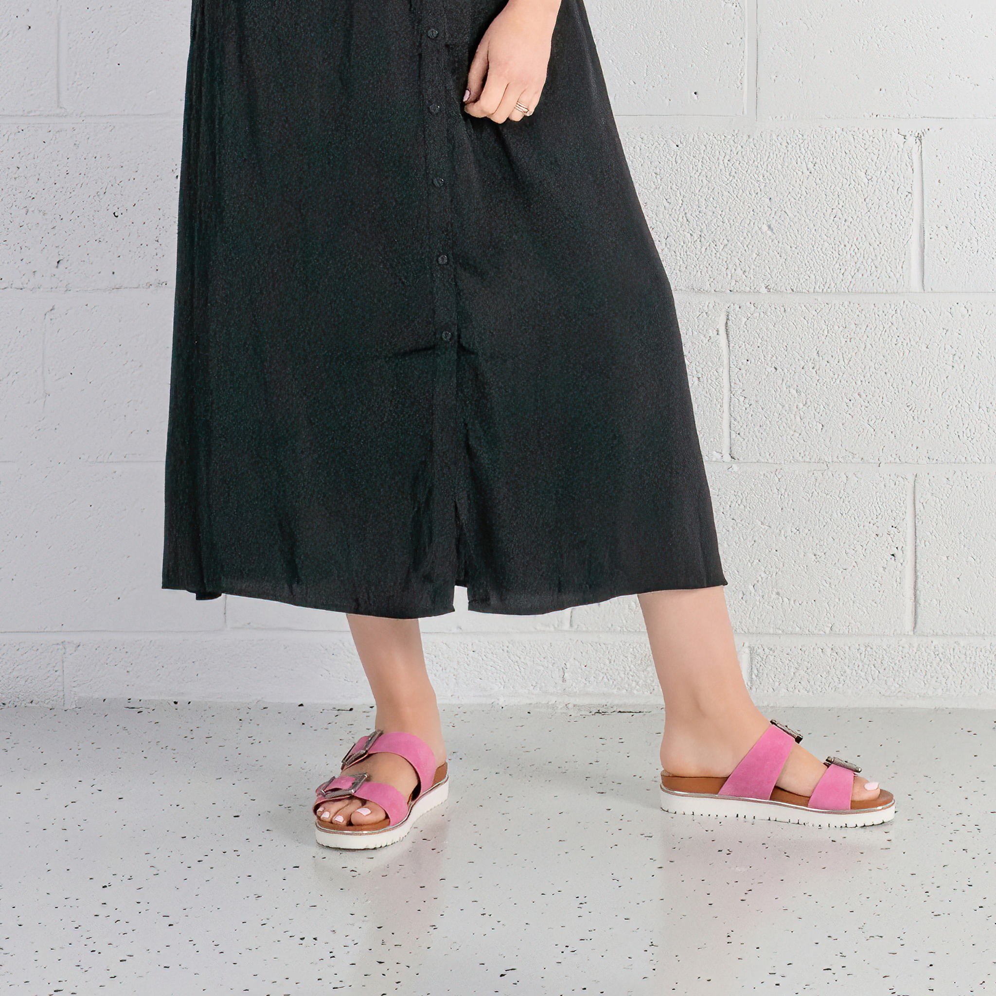 A touch of pink is just what every fashion expert is recommending you add to your wardrobe this season. These Carter Pink slides by Los Cabos are here to bring a touch of whimsical, Barbie-inspired fun to your casual summer wardrobe. They're the perfect blend of comfort and style thanks to their contoured footbed.