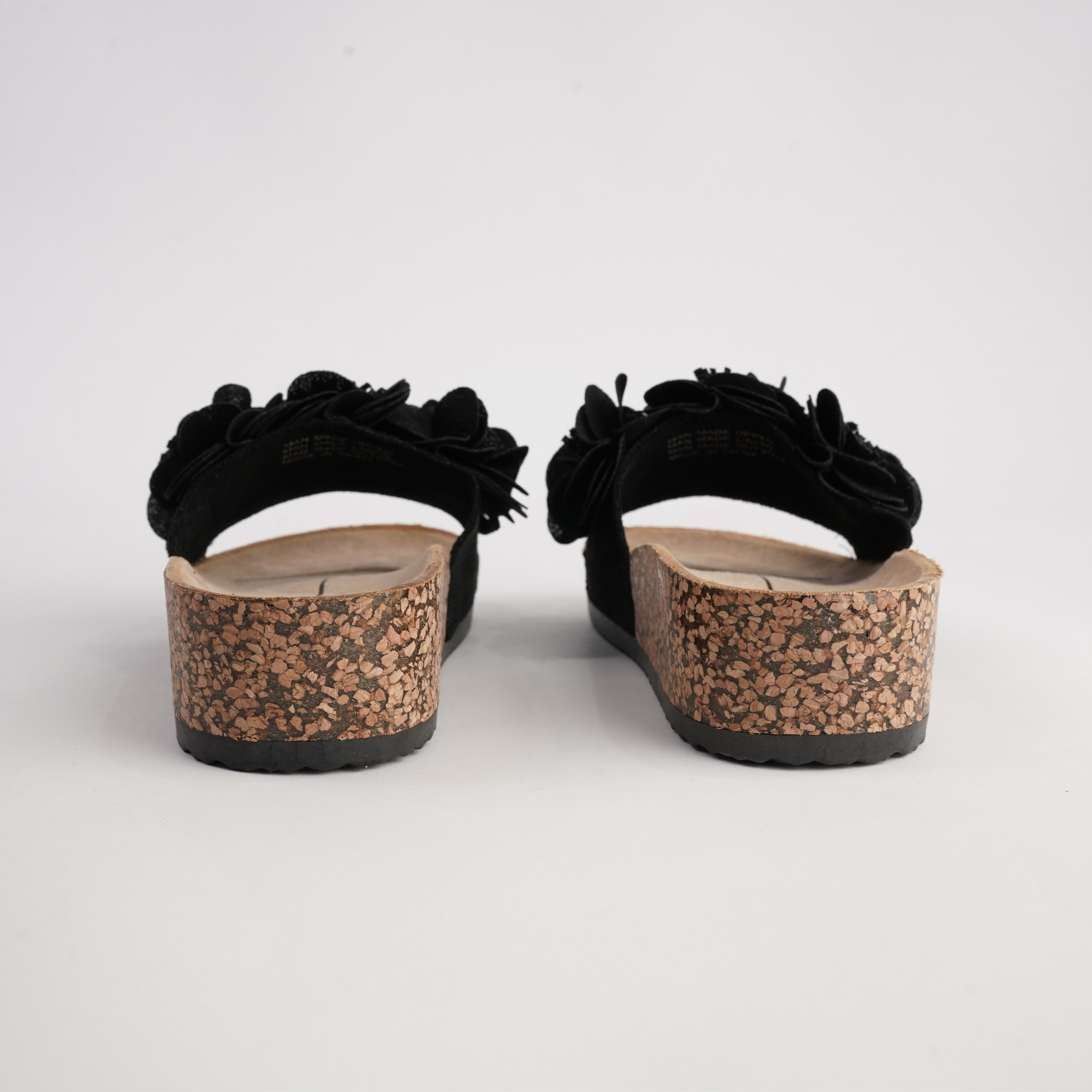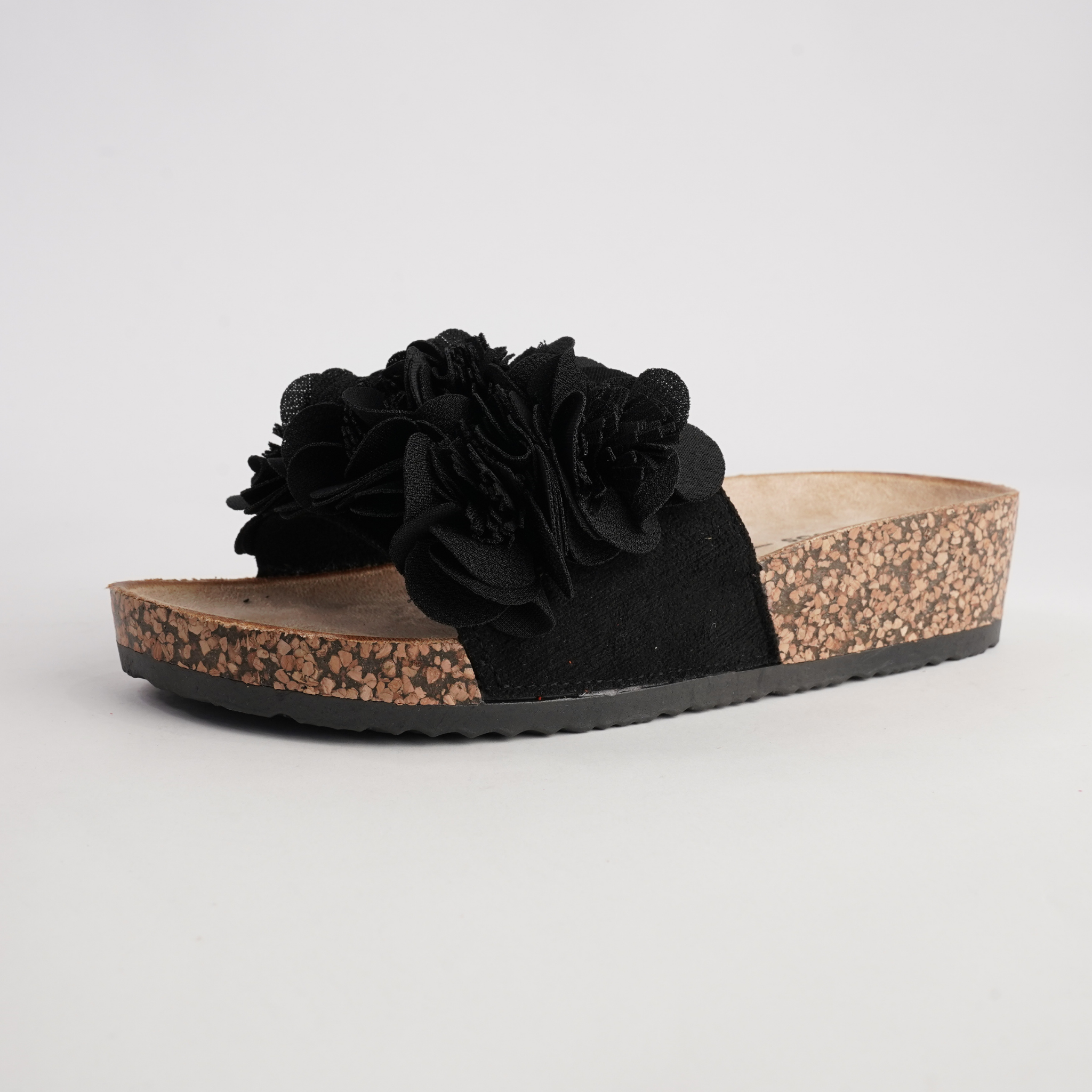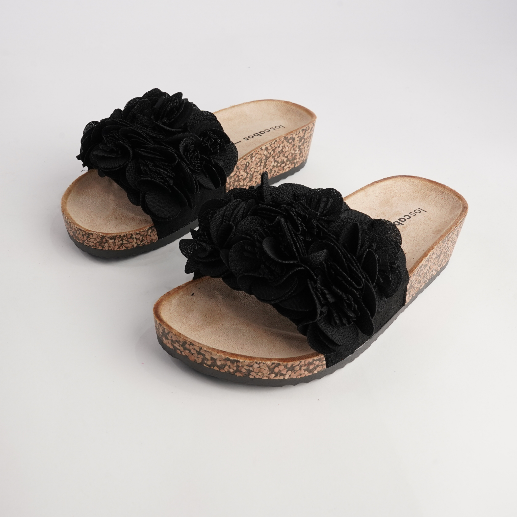 Make a statement in comfort with the Corsage Slides in black by Los Cabos. Featuring a floral-detailed strap, contoured footbed, and cork-look wedge sole, these slides bring colour and style to your summer look.