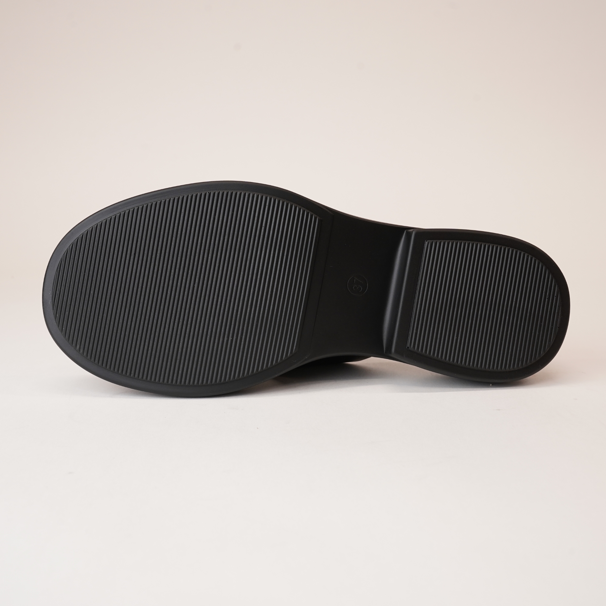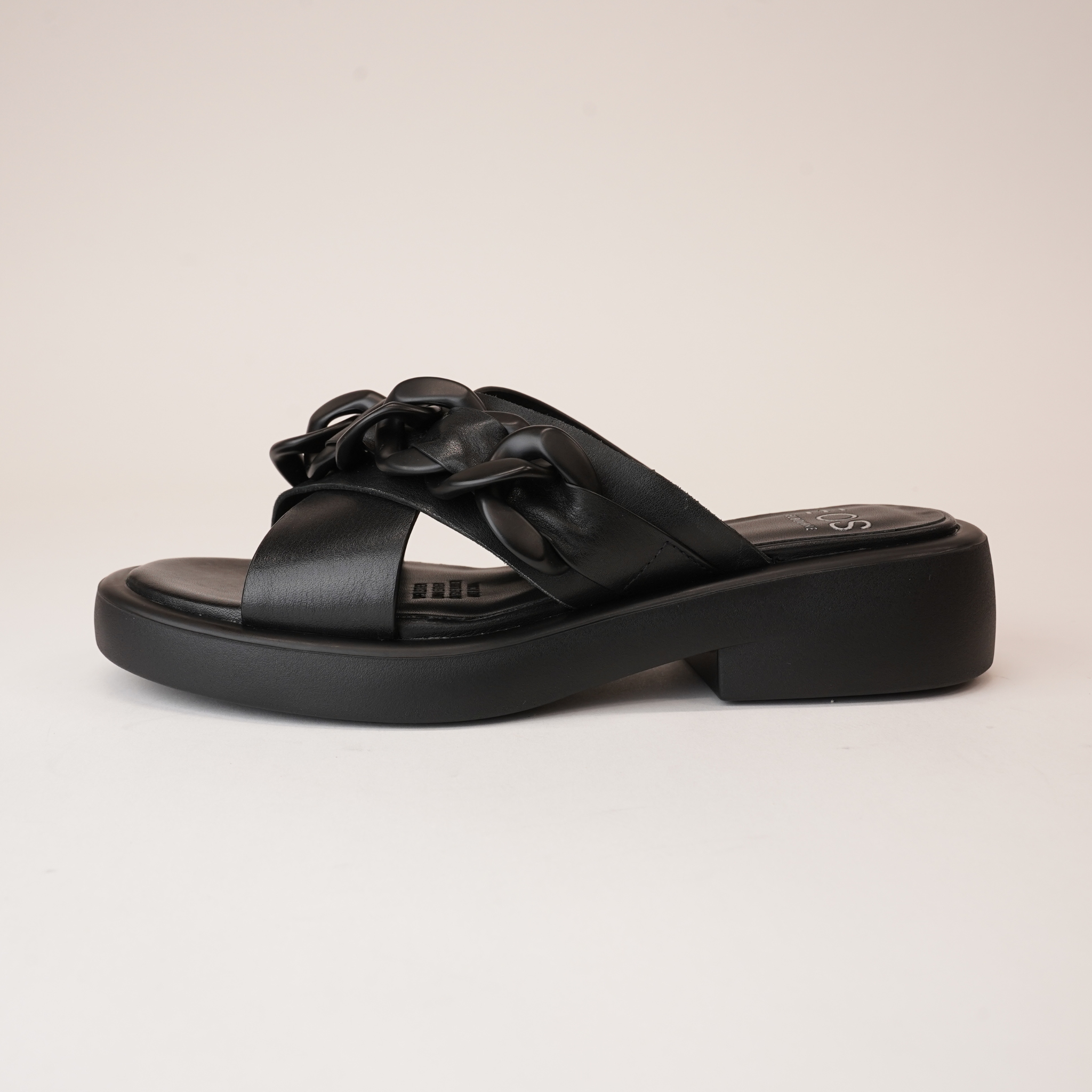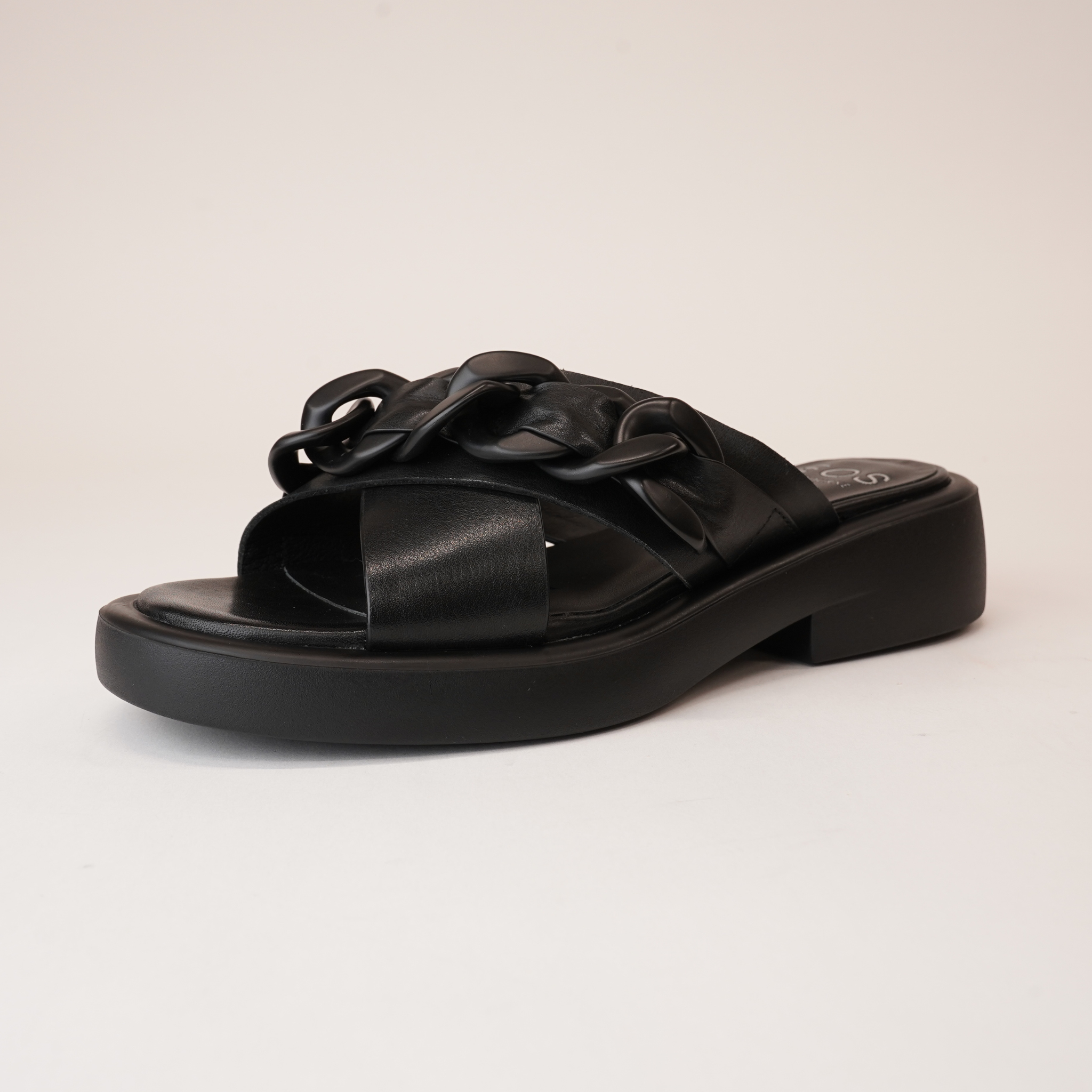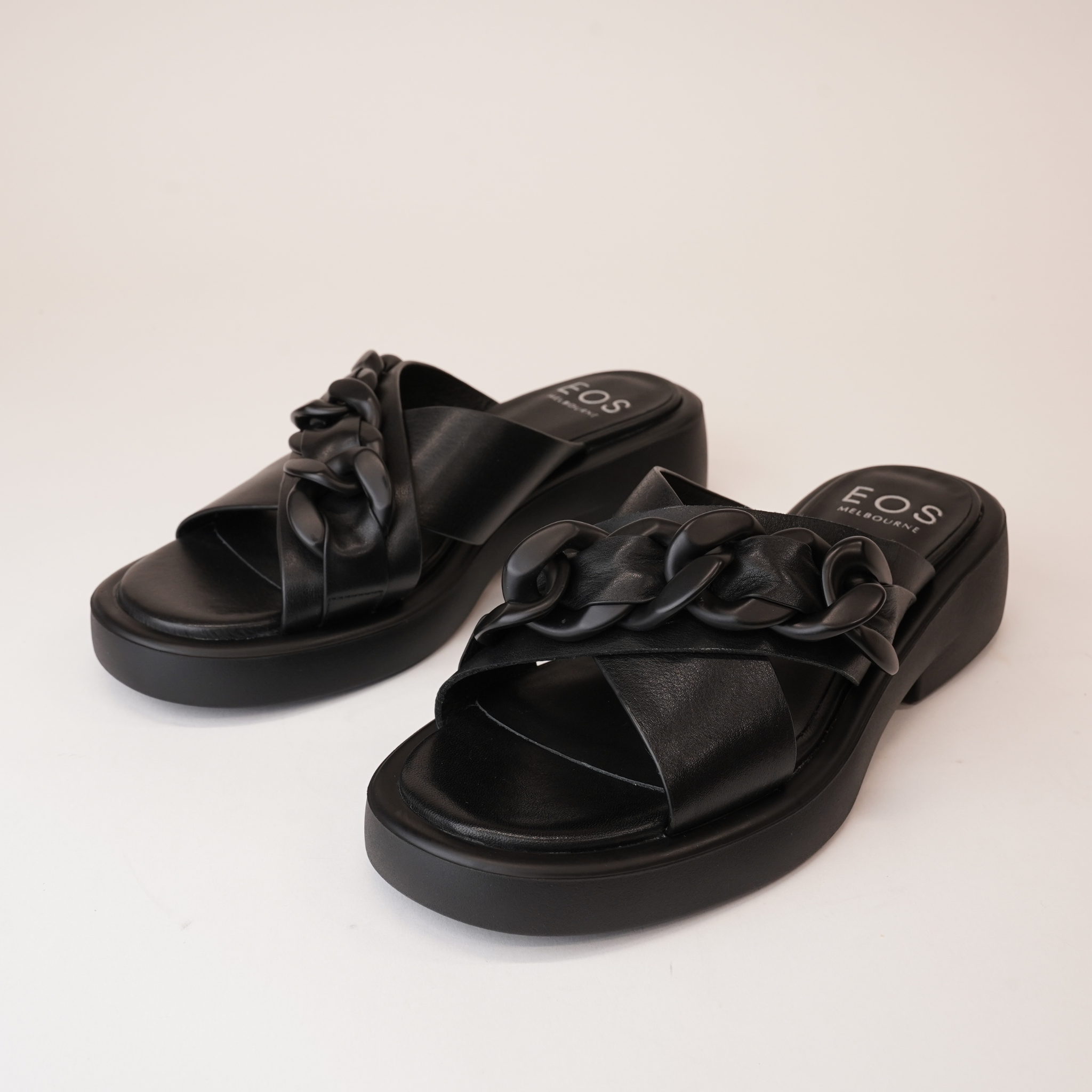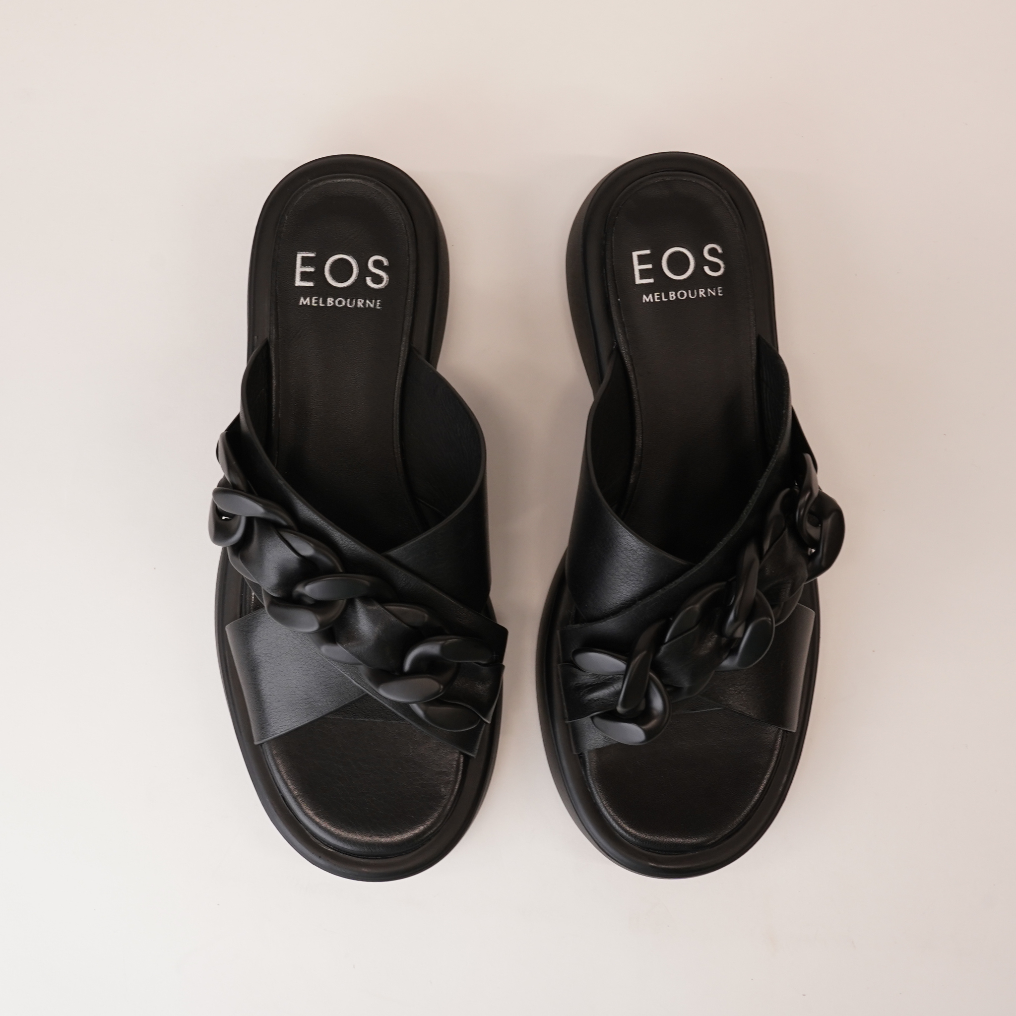 Make a bold statement with the Elease Black Leather Slides by EOS Footwear. These contemporary slides combine sleek black leather with an oversized matte chain detail, delivering a sophisticated edge to your casual footwear collection. The padded footbed ensures lasting comfort, while the low block sole offers subtle elevation and a modern silhouette. Perfect for pairing with dresses or jeans, these slides blend comfort with standout style for all-day wear.