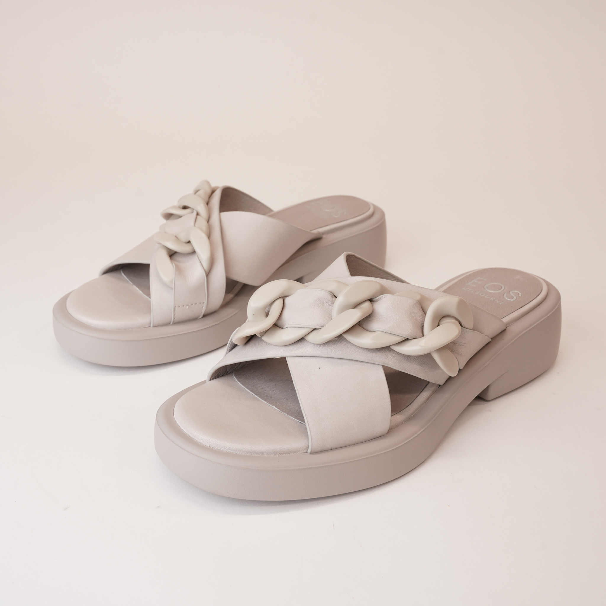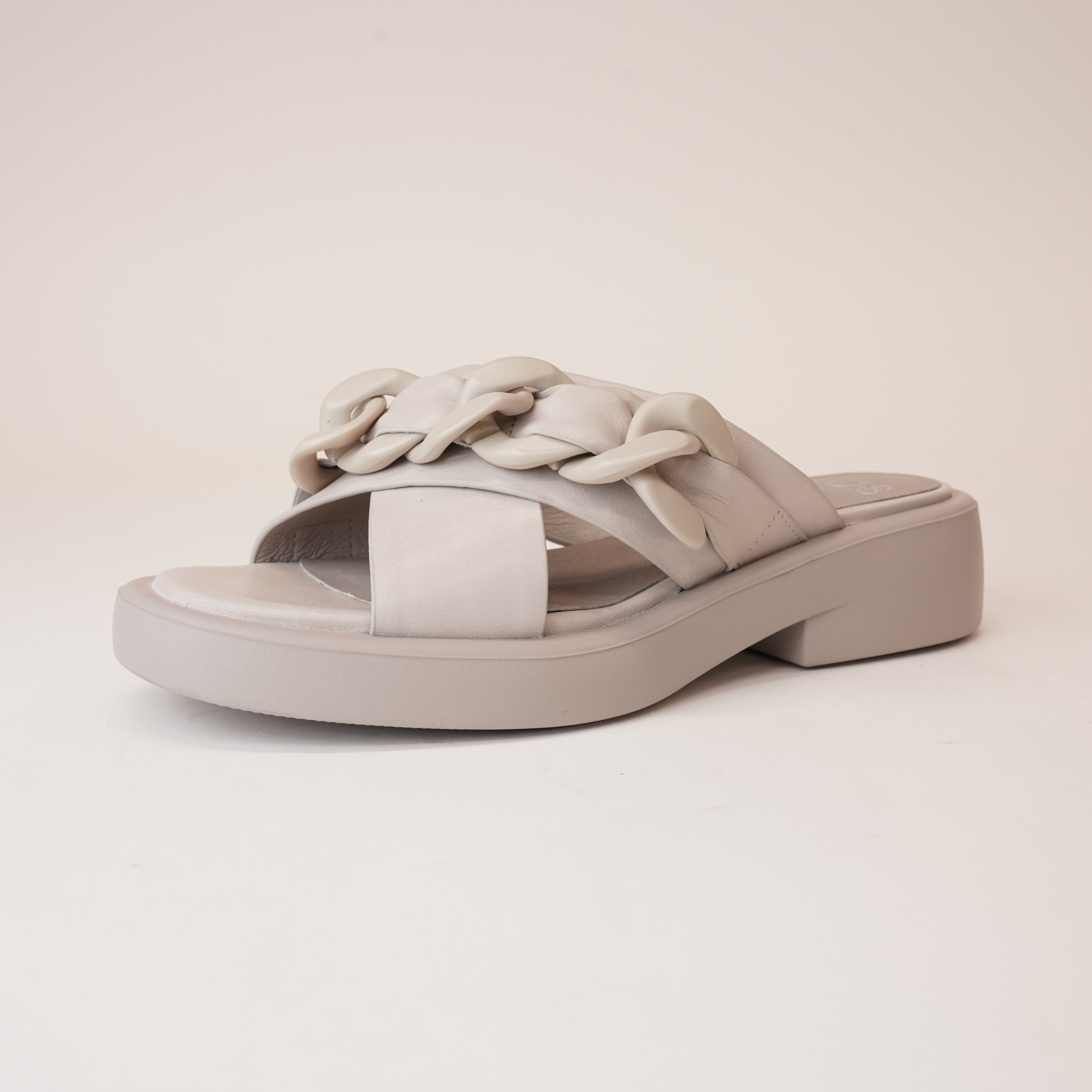 Make a bold statement with the Elease Pebble Leather Slides by EOS Footwear. These contemporary slides combine sleek grey leather with an oversized matte chain detail, delivering a sophisticated edge to your casual footwear collection. The padded footbed ensures lasting comfort, while the low block sole offers subtle elevation and a modern silhouette. Perfect for pairing with dresses or jeans, these slides blend comfort with a standout style for all-day wear.