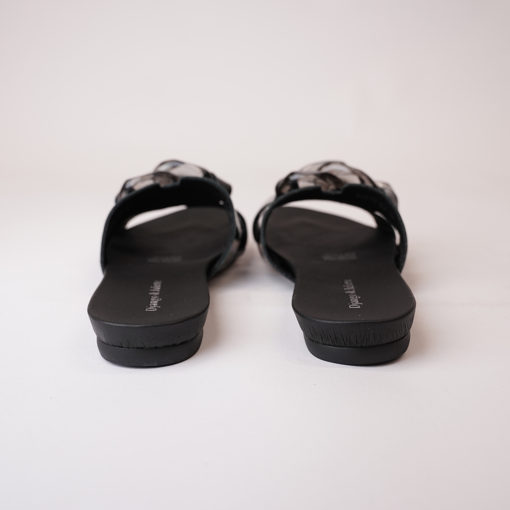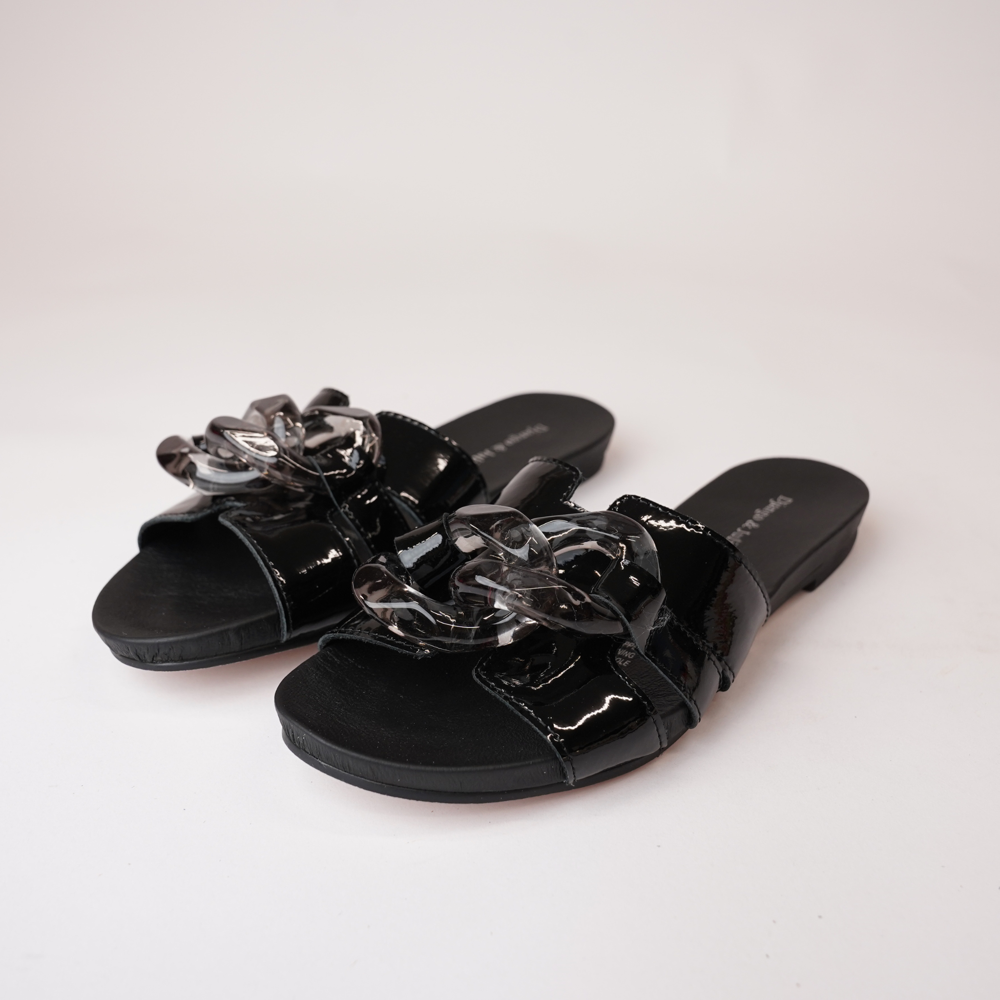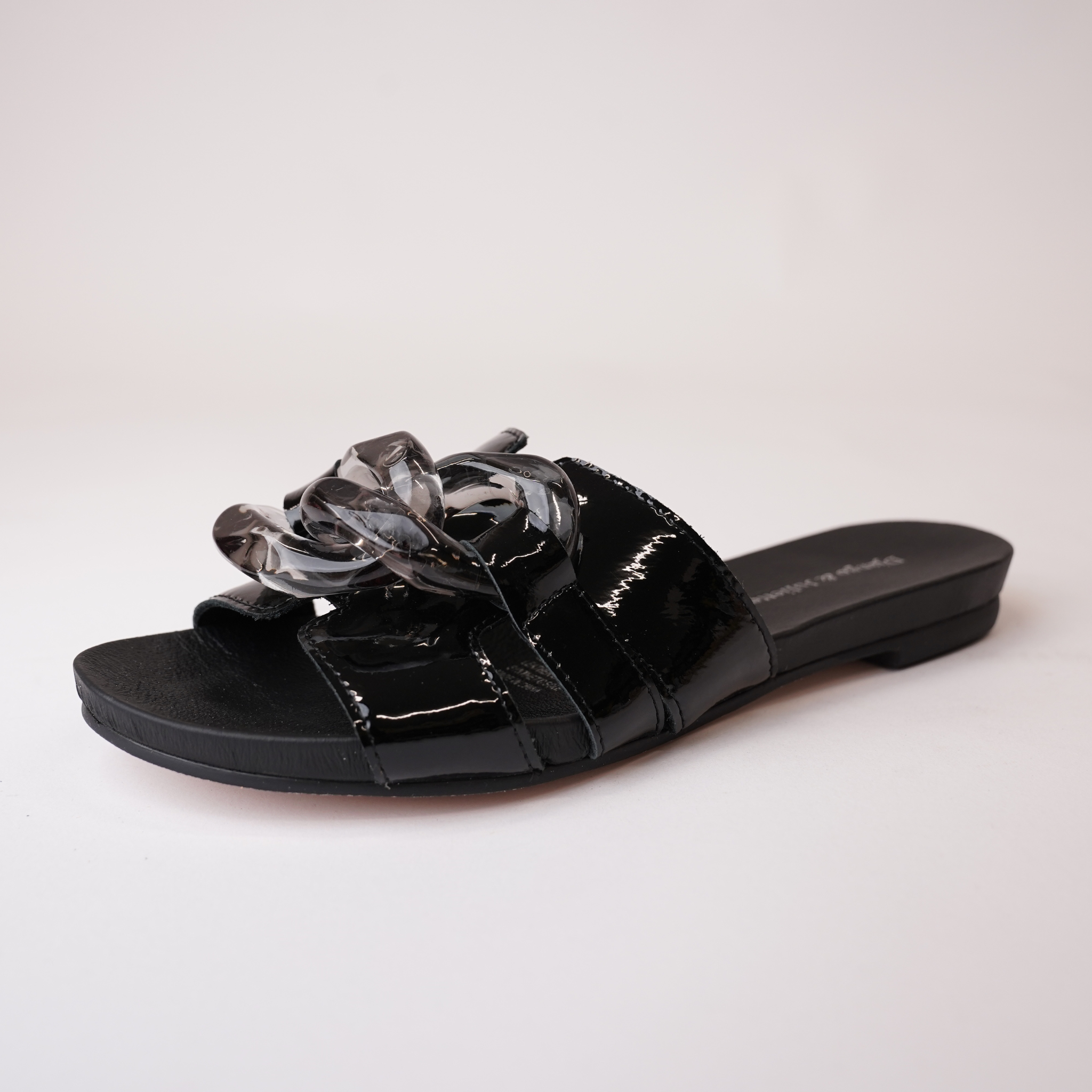 Experience effortless glamour with the Jovie Black Patent Leather Slides by Django & Juliette. Crafted with a leather upper and lining, these slides offer both style and comfort. The synthetic sole ensures durability while the decorative chain adds a chic touch. Perfect for any occasion, these slides are a must-have for any fashion-forward individual.