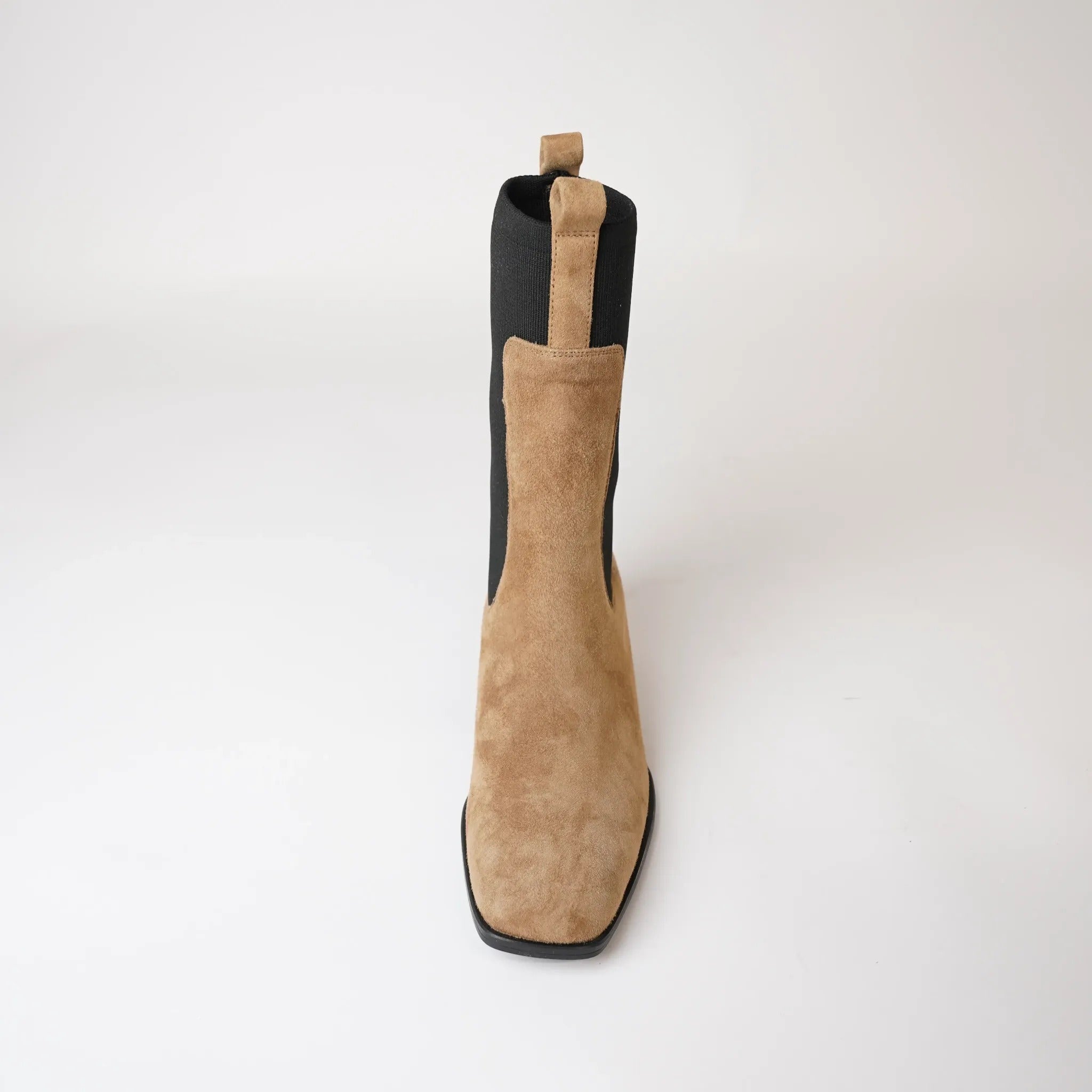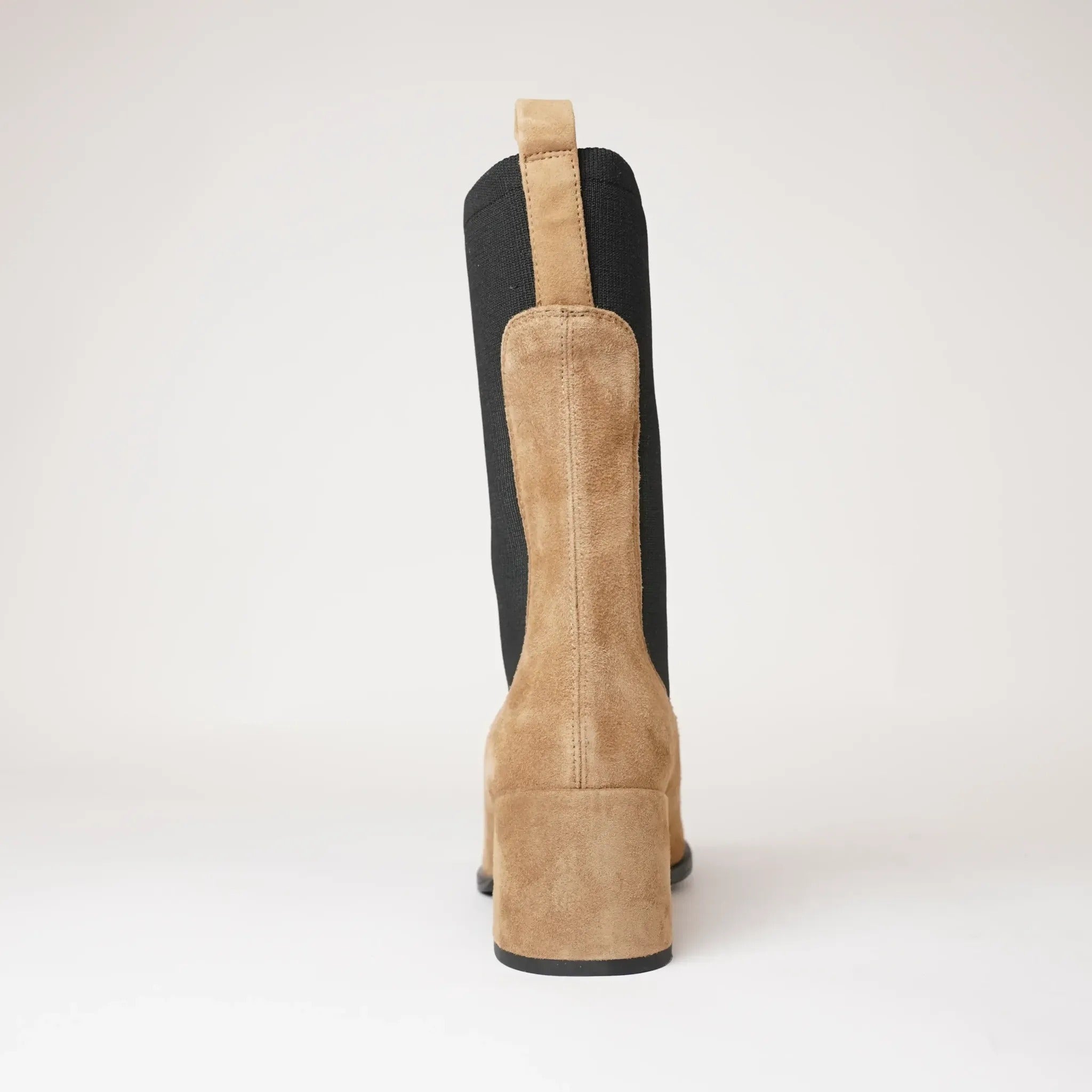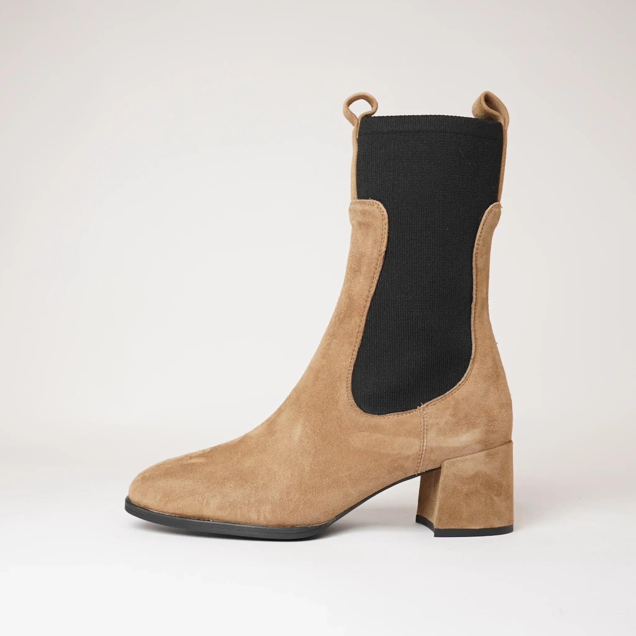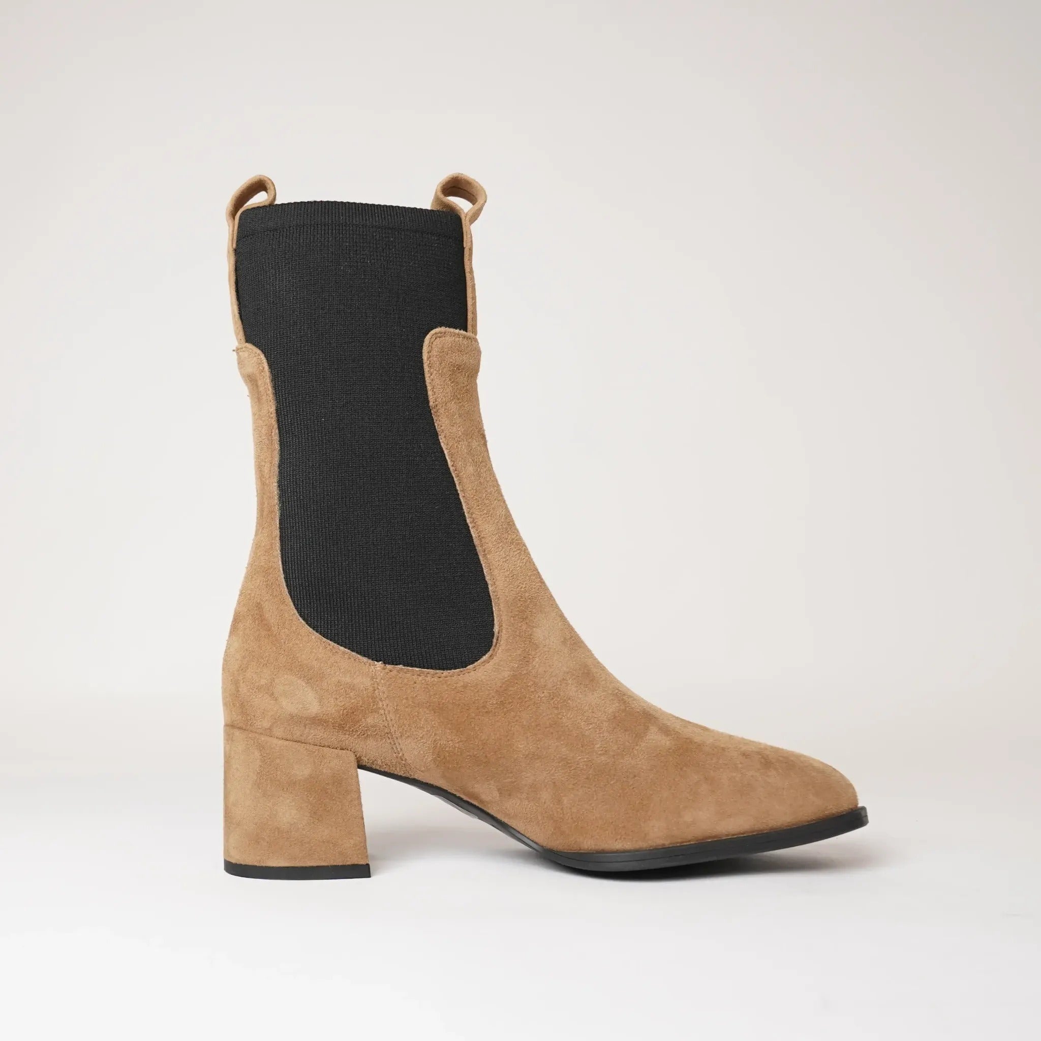 Discover the perfect blend of style and comfort with our Mieres Dark Camel Suede Boots by Unisa. Crafted with a leather and textile upper and lining, these boots feature a 5.5cm heel for added height, elasticated panels for a snug fit, and pull tabs for easy slip on. The squared toe and padded inner sole add the perfect finishing touch. Made in Spain.