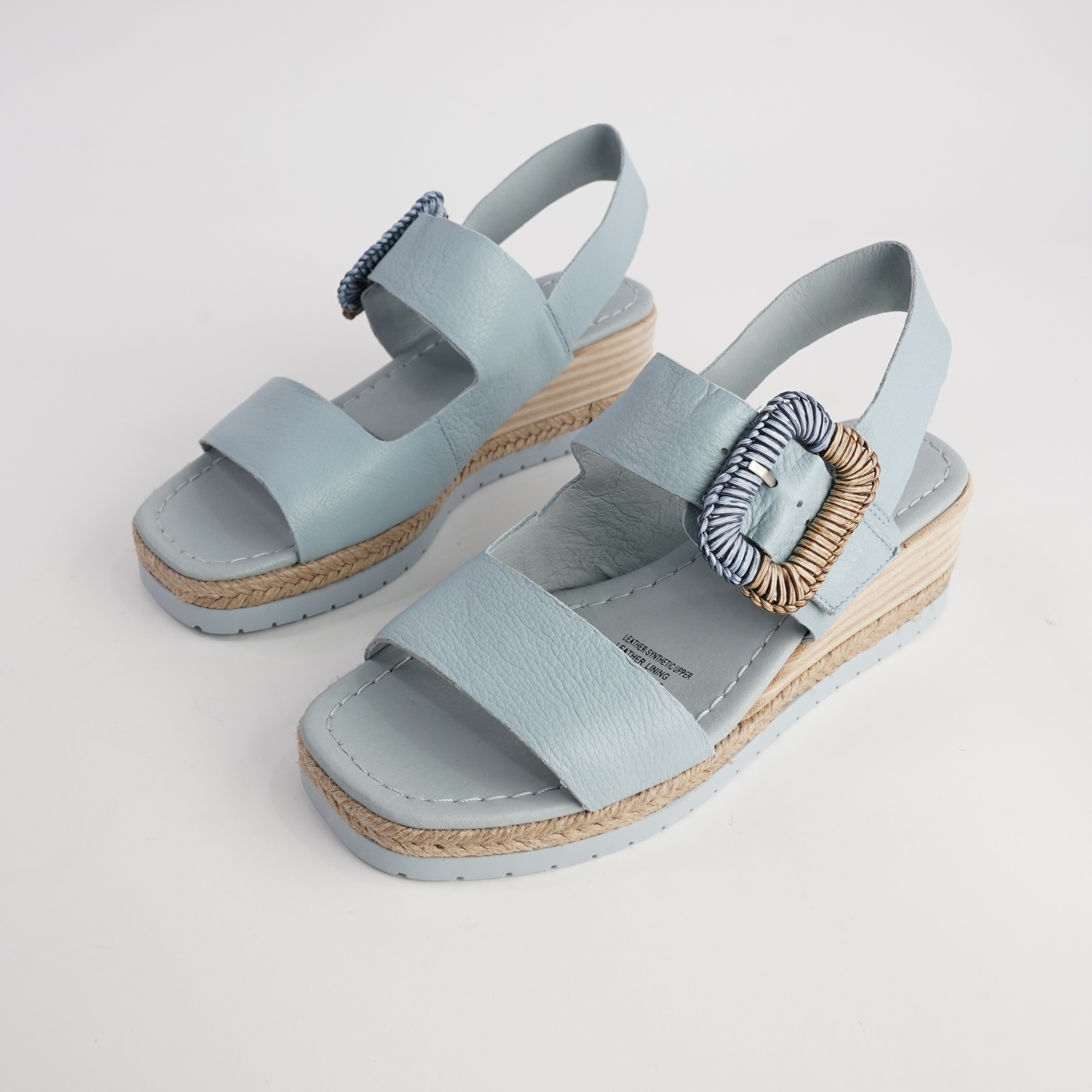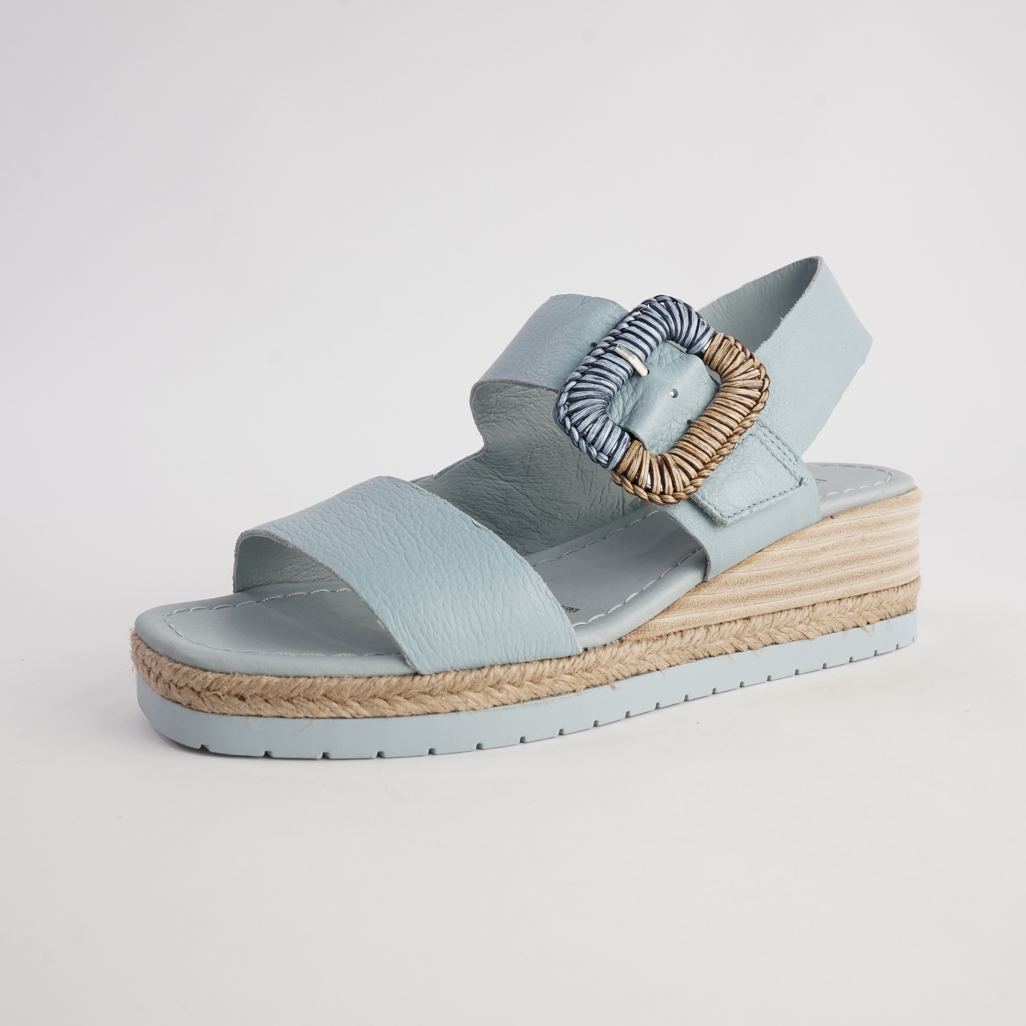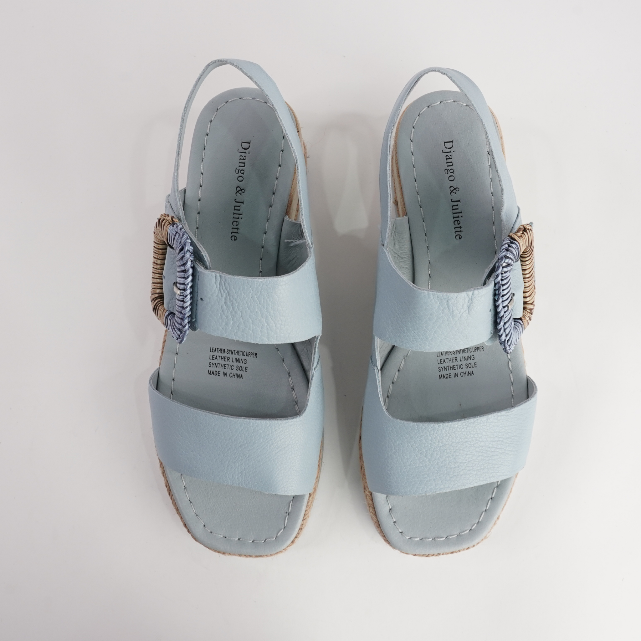 The Innes Sandals by Django & Juliette combine timeless design with everyday comfort. Crafted in rich denim leather, they feature a wide strap across the foot and a bold woven buckle detail for a touch of natural charm. The mid-height wedge sole is wrapped with braided jute for an espadrille-inspired finish, while the cushioned footbed ensures effortless all-day wear. Perfect for pairing with summer dresses, skirts, or cropped trousers.