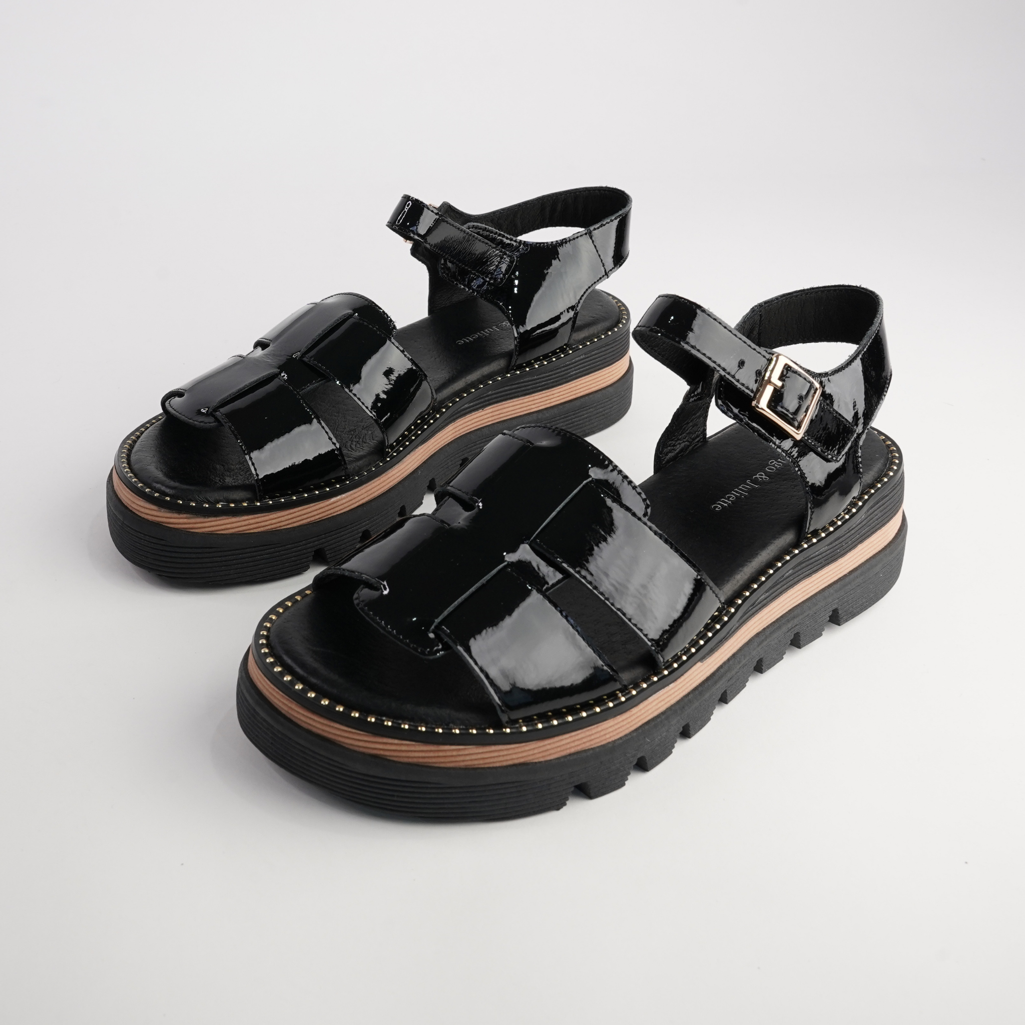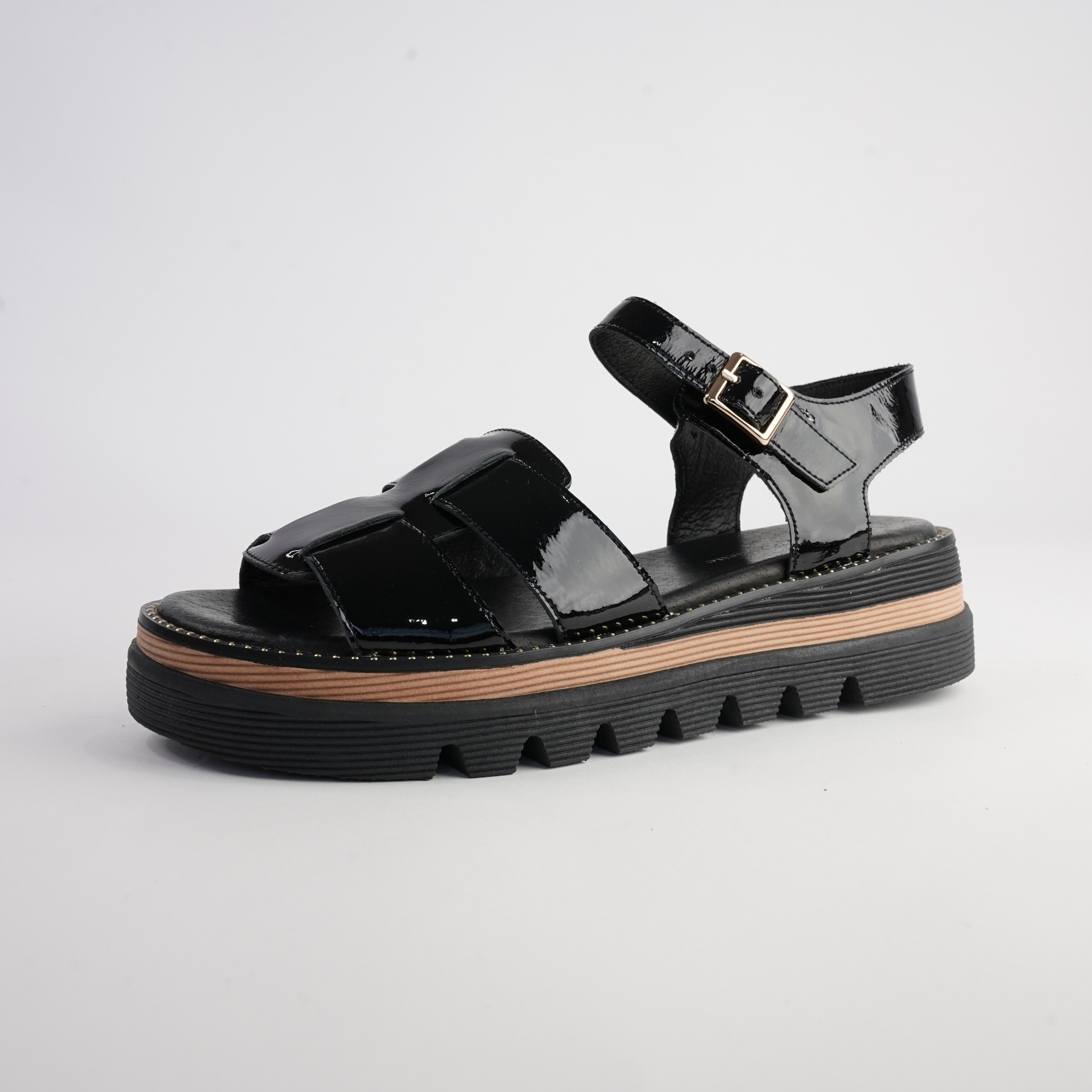 Add a bold edge to your warm-weather looks with the Simm Black Patent Sandals by Django & Juliette. Featuring a glossy patent leather finish, chunky platform sole, and secure ankle strap, these sandals balance statement style with everyday comfort. The cushioned footbed and lightweight sole make them ideal for both day-to-day wear and dressing up your casual outfits.