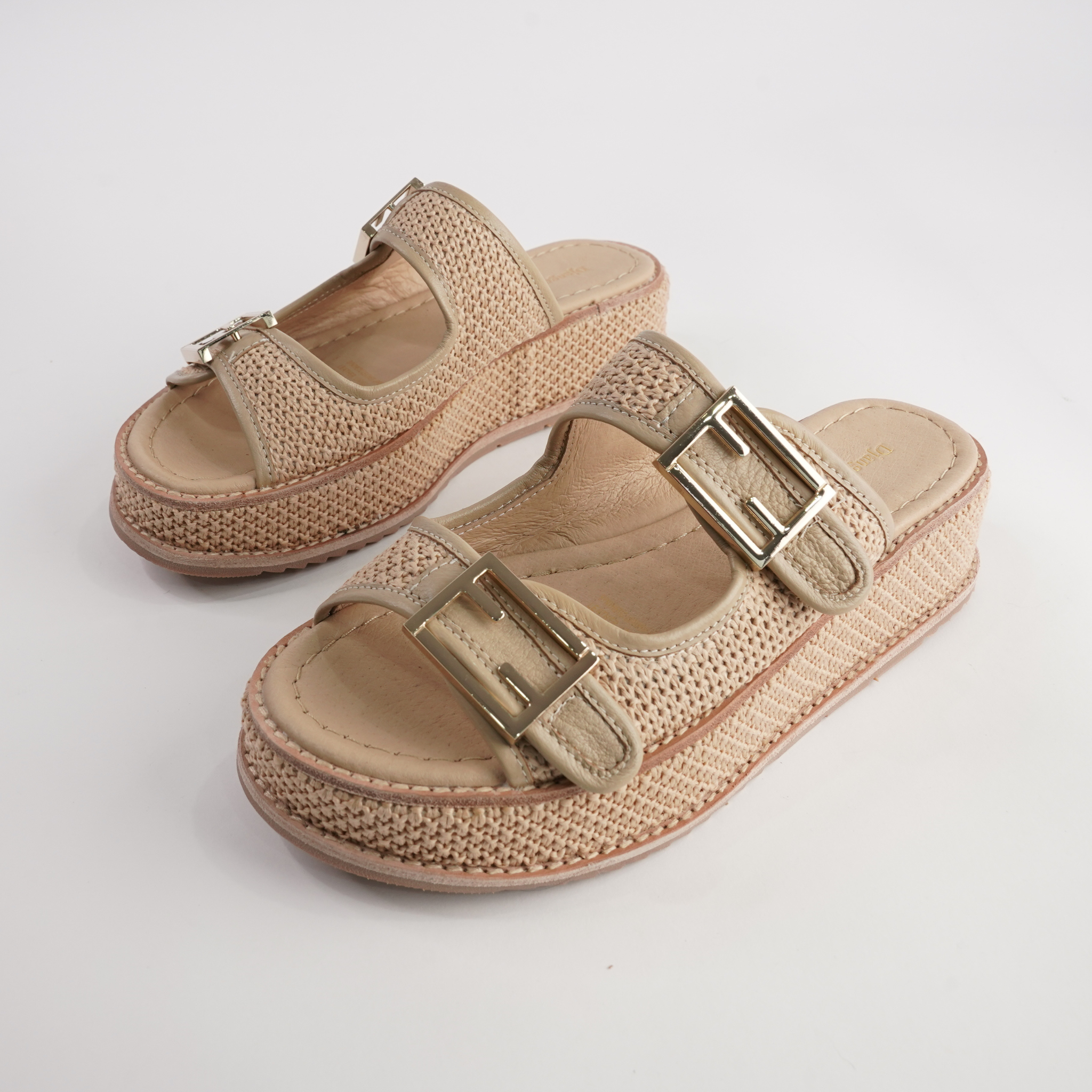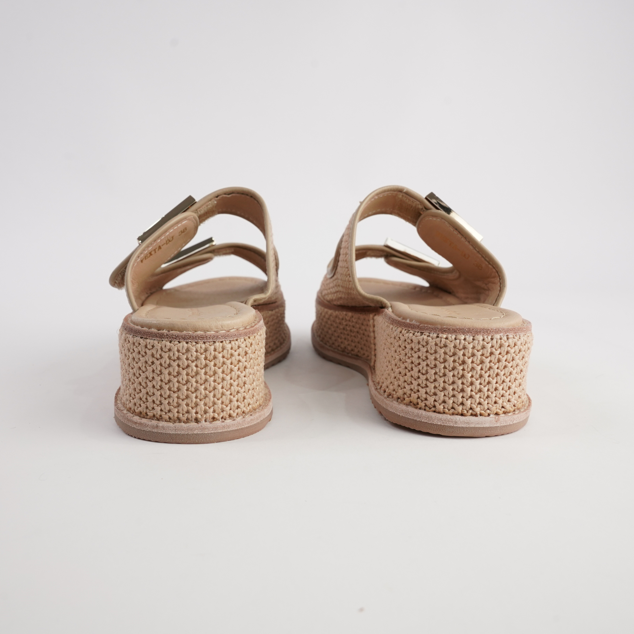 The Vexta Slides by Django & Juliette bring effortless summer style with a luxe edge. Designed with wide raffia-textured straps trimmed in camel leather and finished with oversized gold buckles, they strike the perfect balance between casual comfort and modern sophistication. The elevated raffia-wrapped platform sole adds both height and resort-inspired charm, making them a go-to for relaxed days, beach escapes, or city strolls.