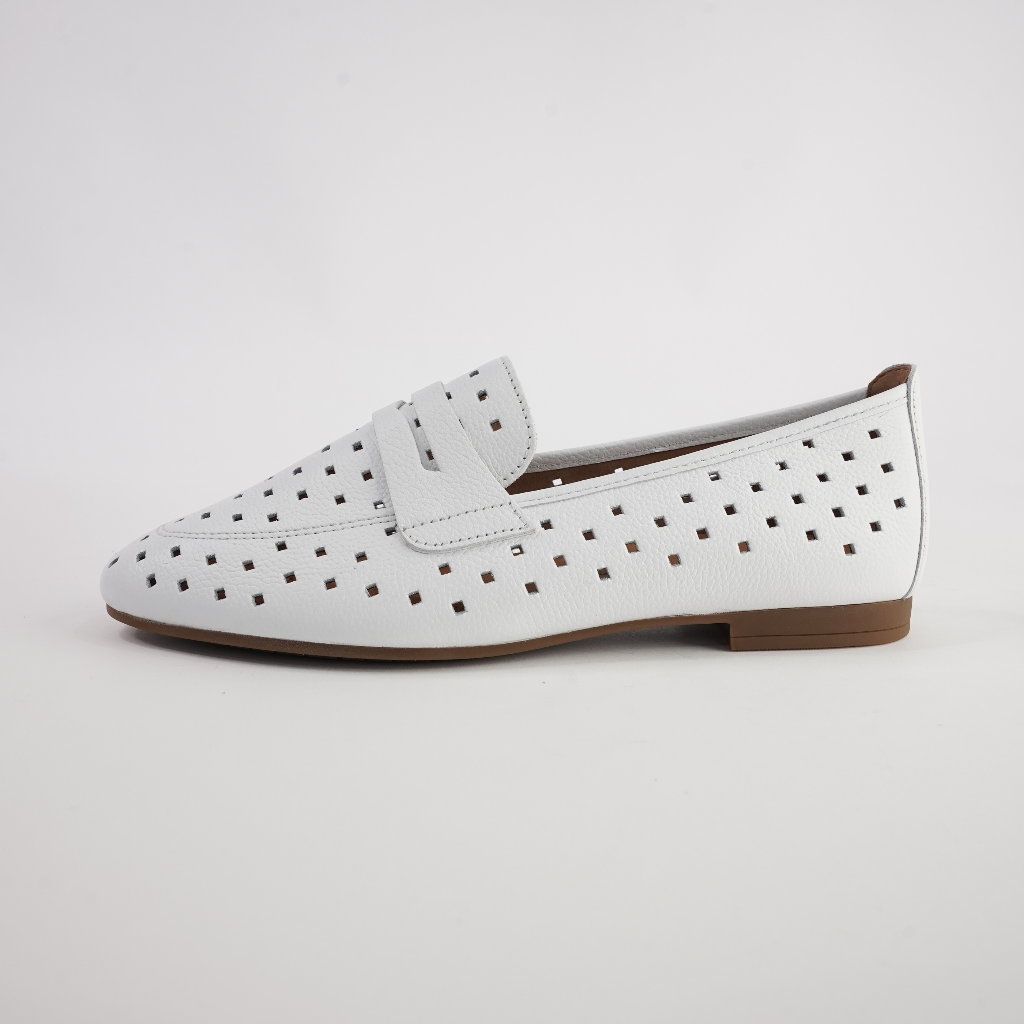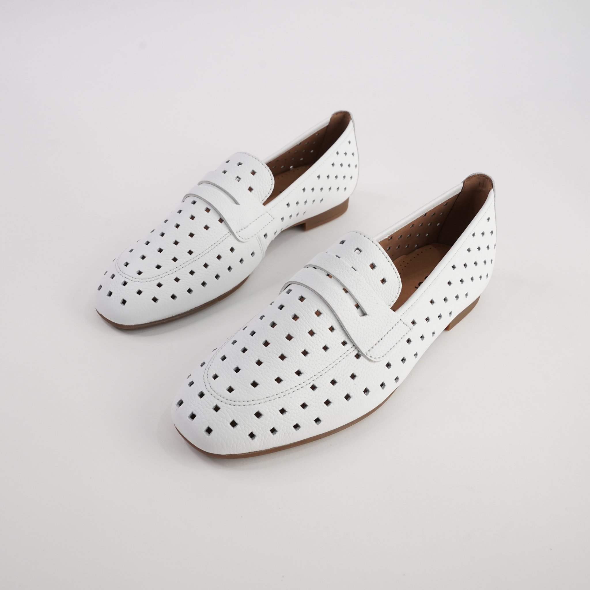 Sophisticated and breathable, the Dorothy White Leather Loafers by Gabor bring modern elegance to everyday wear. Crafted from premium white leather with square-cut perforations, these loafers offer a stylish twist on a classic silhouette. The sleek penny strap detail adds refinement, while the soft leather lining and flexible sole provide comfort with every step. Perfect for warm-weather dressing, they balance timeless design with functional ease.
