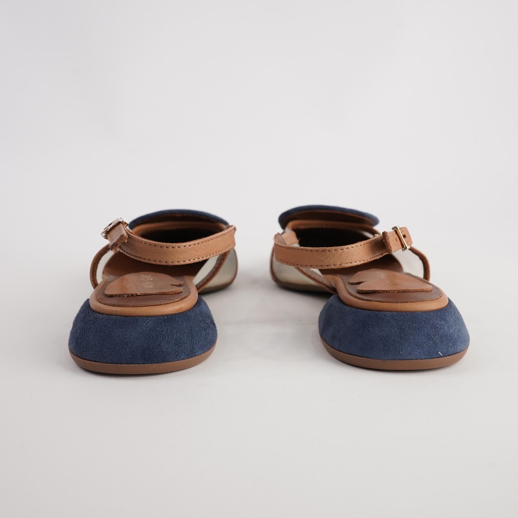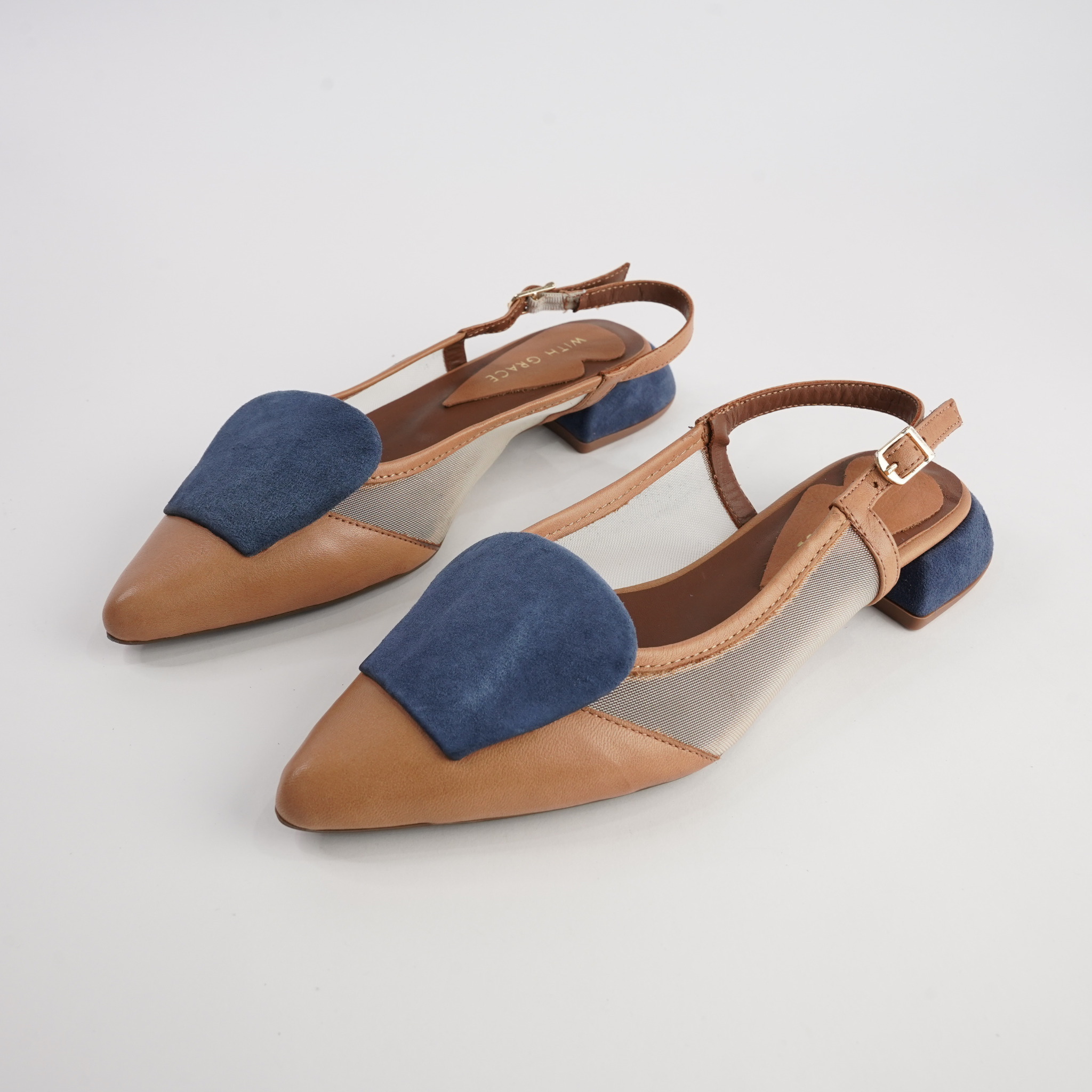 Chic and distinctive, the Vivienne Flats by With Grace are designed to elevate your everyday look with a playful twist. Crafted in smooth tan leather and airy mesh panels, they feature a striking jeans-blue suede accent on the toe and matching heel detail. With a pointed silhouette and a low block heel, these slingback flats bring both polish and comfort to your wardrobe.
