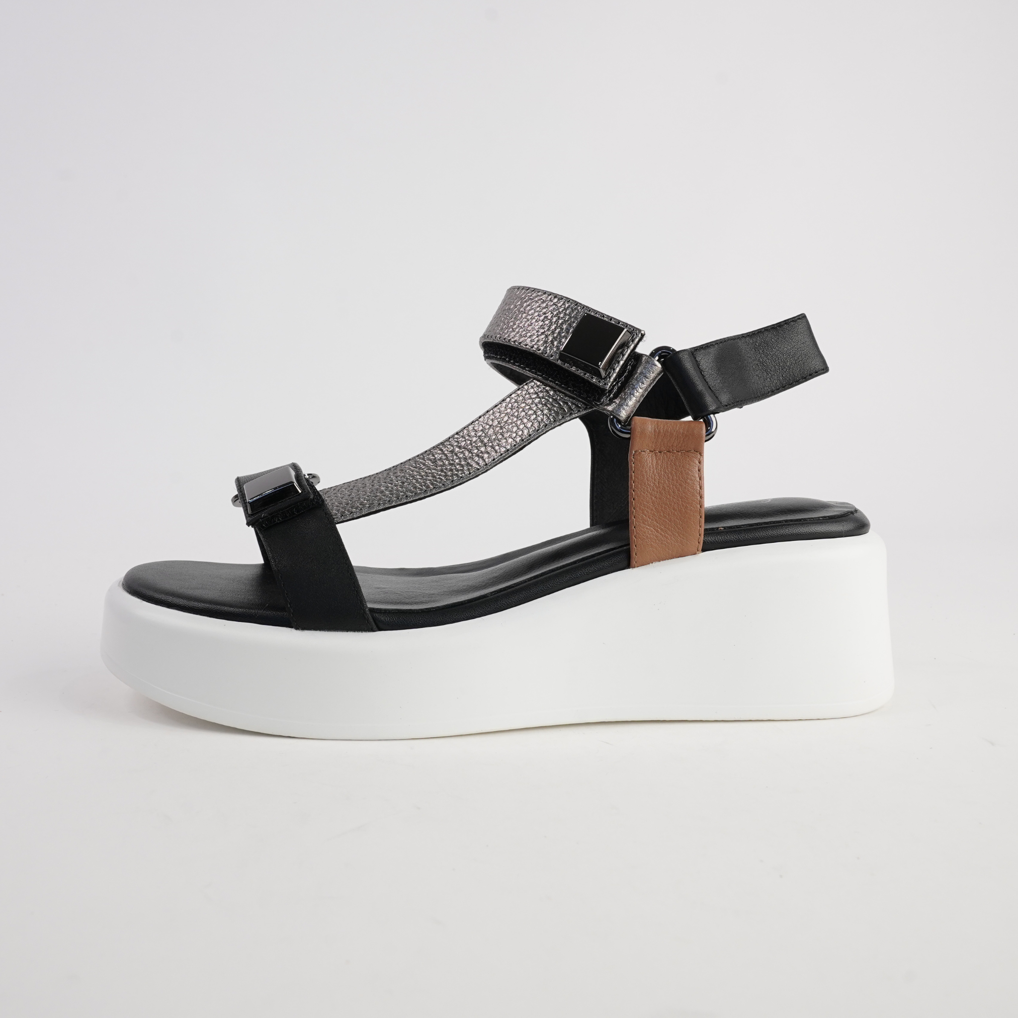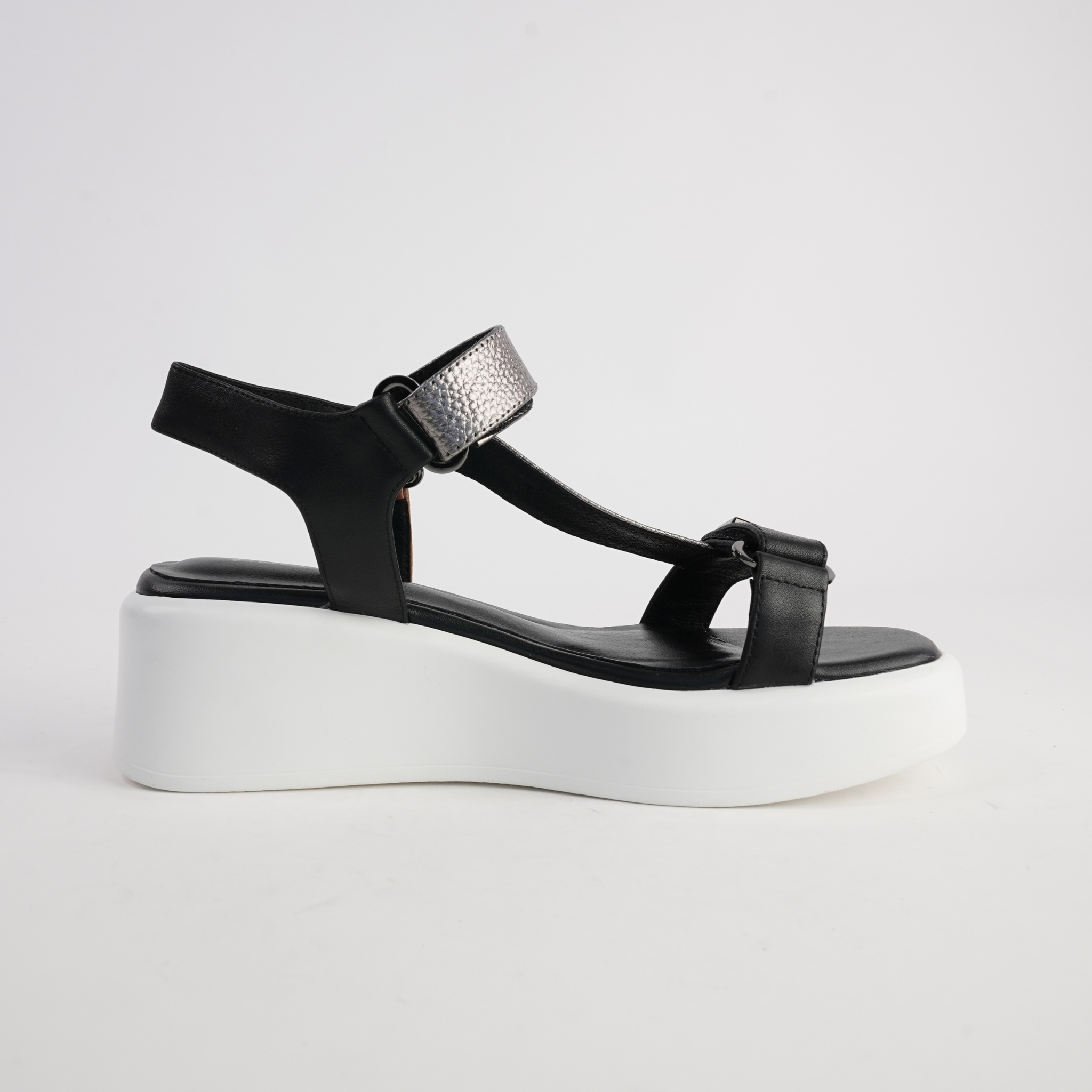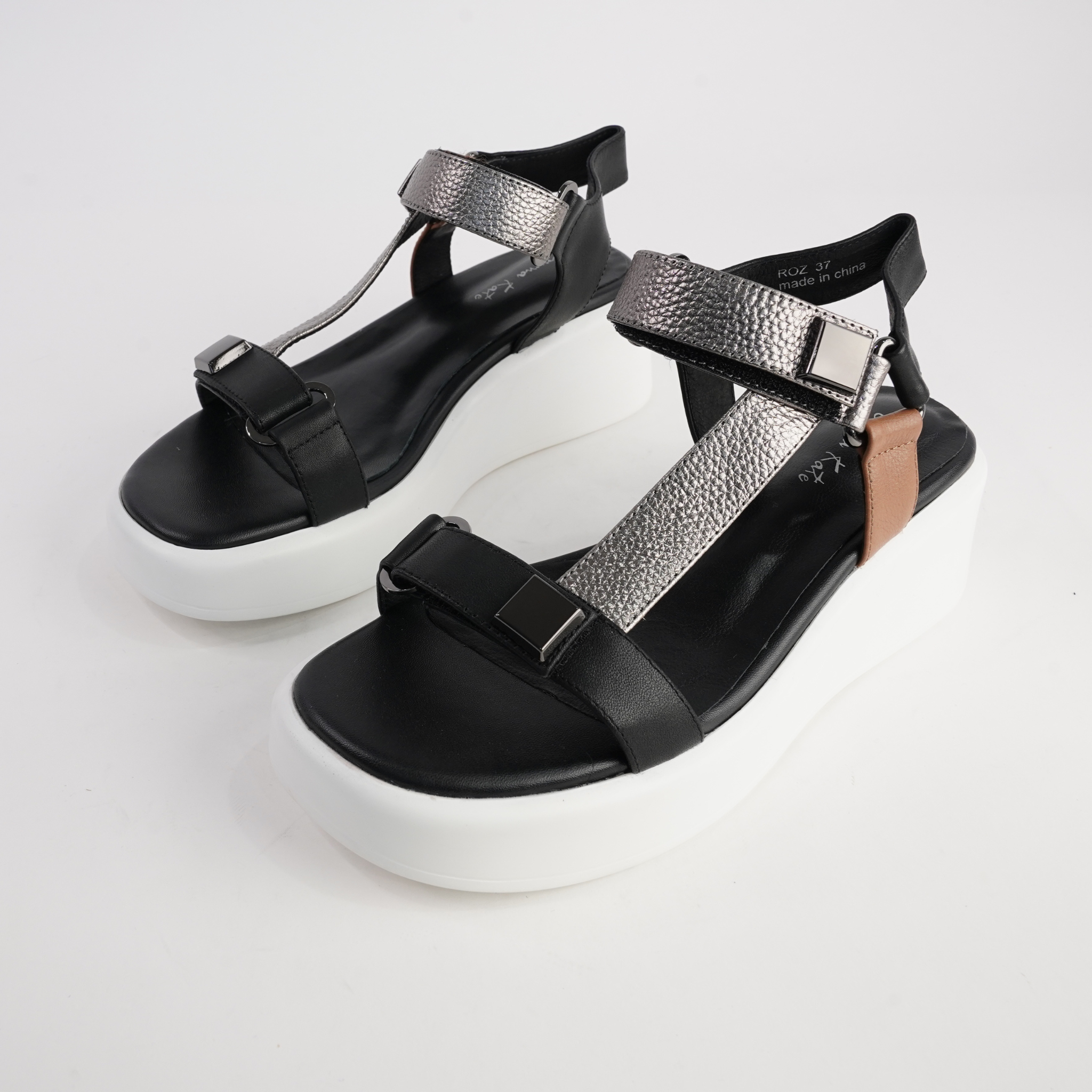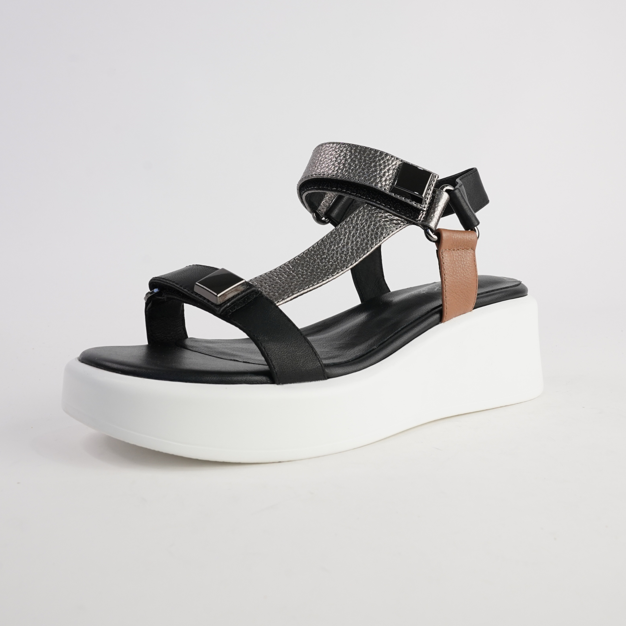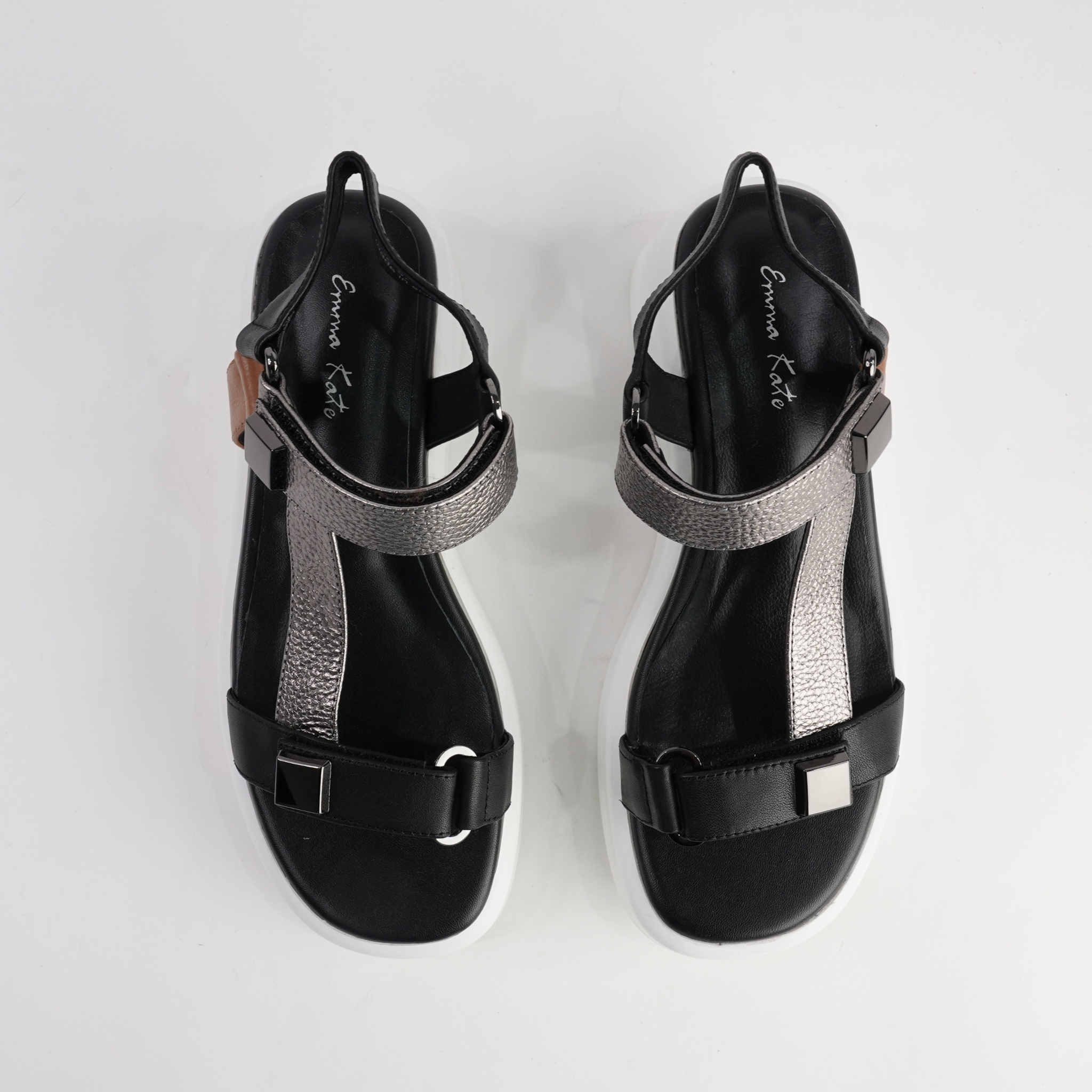 Modern, sleek, and effortlessly cool the Roz Sandals by Emma Kate are designed to make a statement while keeping comfort front of mind. Featuring a striking mix of black and silver leather straps with a tan accent at the heel, these sandals sit on a bold white wedge sole for a contemporary edge. The cushioned footbed ensures all-day wearability, while the adjustable straps provide a secure and tailored fit. Perfect for styling with summer dresses, linen pants, or casual denim, Roz adds an urban-chic finish to your everyday wardrobe.