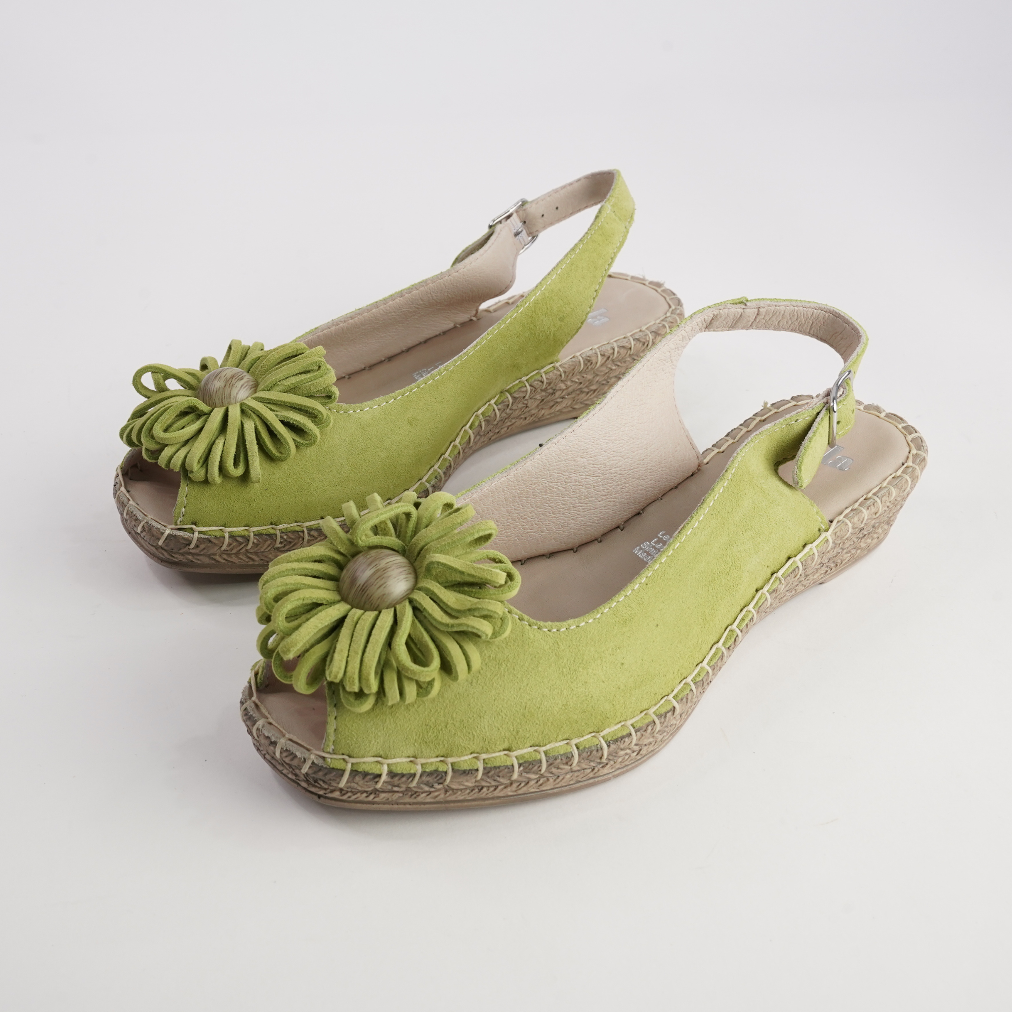 The Erica Suede Espadrille Wedges by Sala bring a refined twist to warm-weather dressing. Crafted from soft suede, this slingback style features a handcrafted floral embellishment with a textured centre for an artisanal touch. Set on a braided jute wedge with a cushioned leather footbed, these sandals offer all-day comfort with timeless European flair.