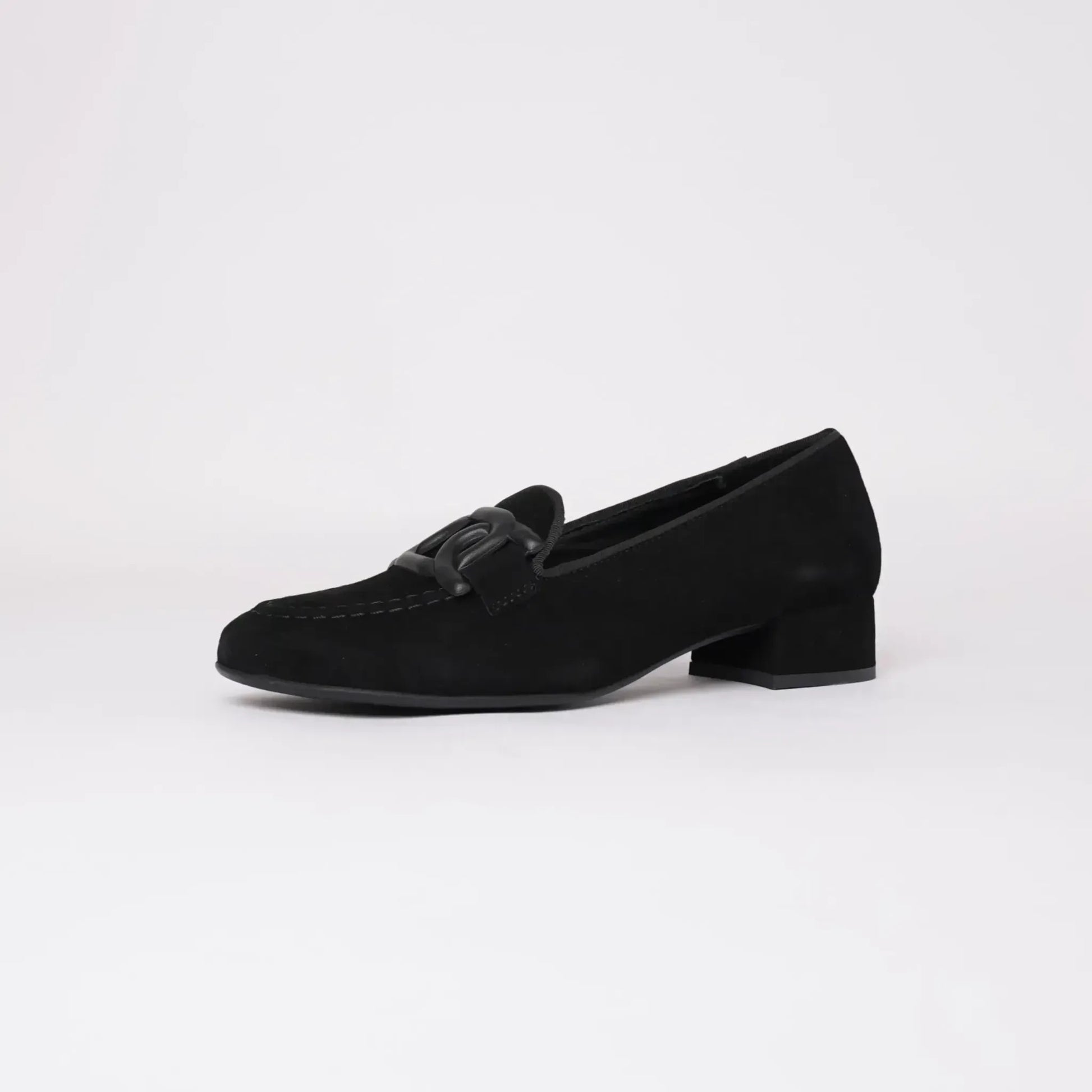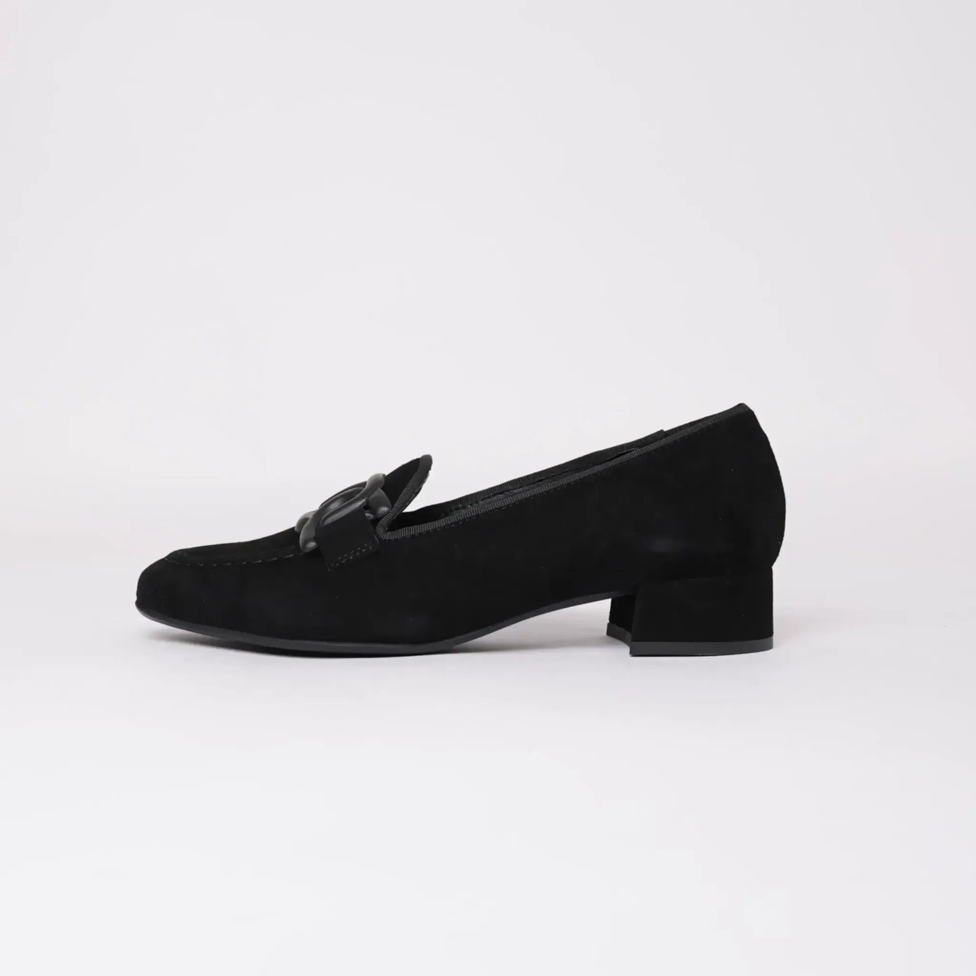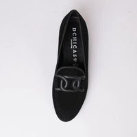 Dress to impress with our 1405 Black Suede Loafers by D'Chicas! Made in Spain, these leather loafers feature a padded inner sole for all-day comfort. The sophisticated chain detail at the toe adds a touch of flair, while the 3cm heel provides a subtle lift. Perfect for any occasion, these loafers will elevate your style game.