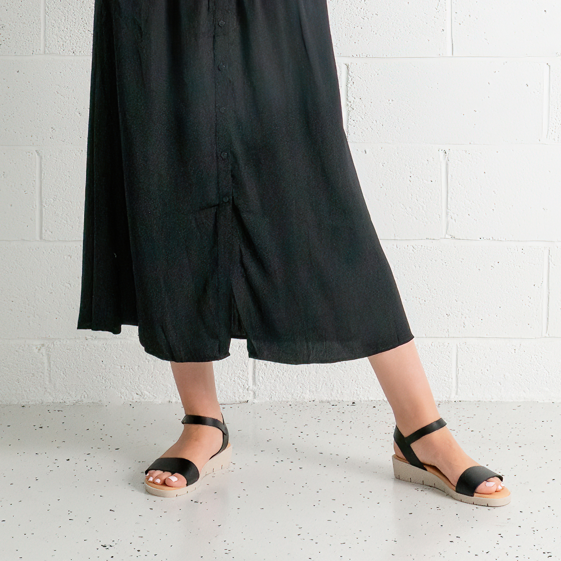 The Bella Black Leather Sandals by Nu by Neo are a versatile and comfortable option for everyday wear. Featuring a sleek black leather upper with a secure ankle strap, these sandals offer both style and stability. The cushioned insole ensures comfort, while the lightweight wedge sole adds subtle height and support. Perfect for pairing with casual outfits or for a relaxed day out.