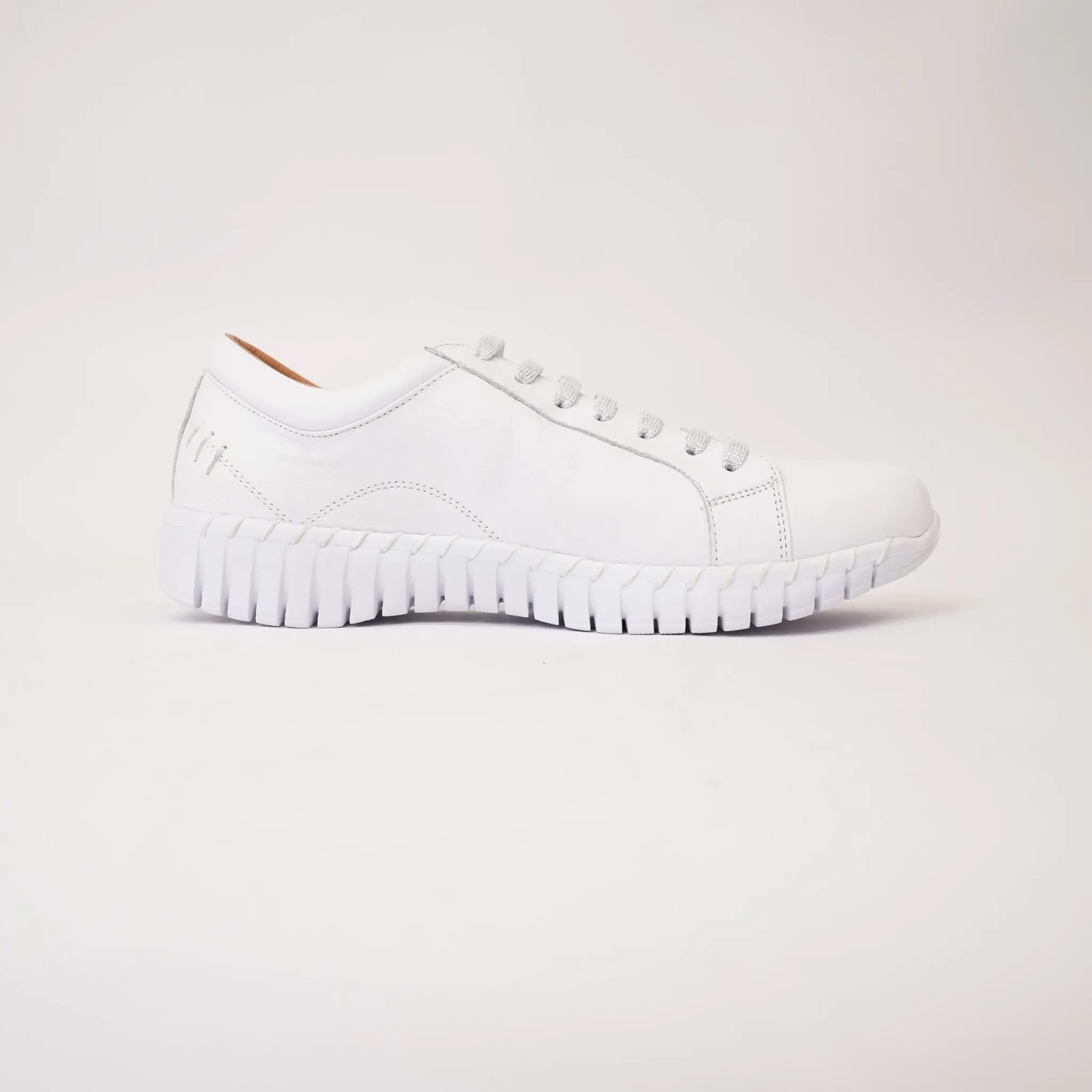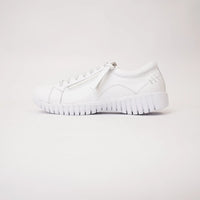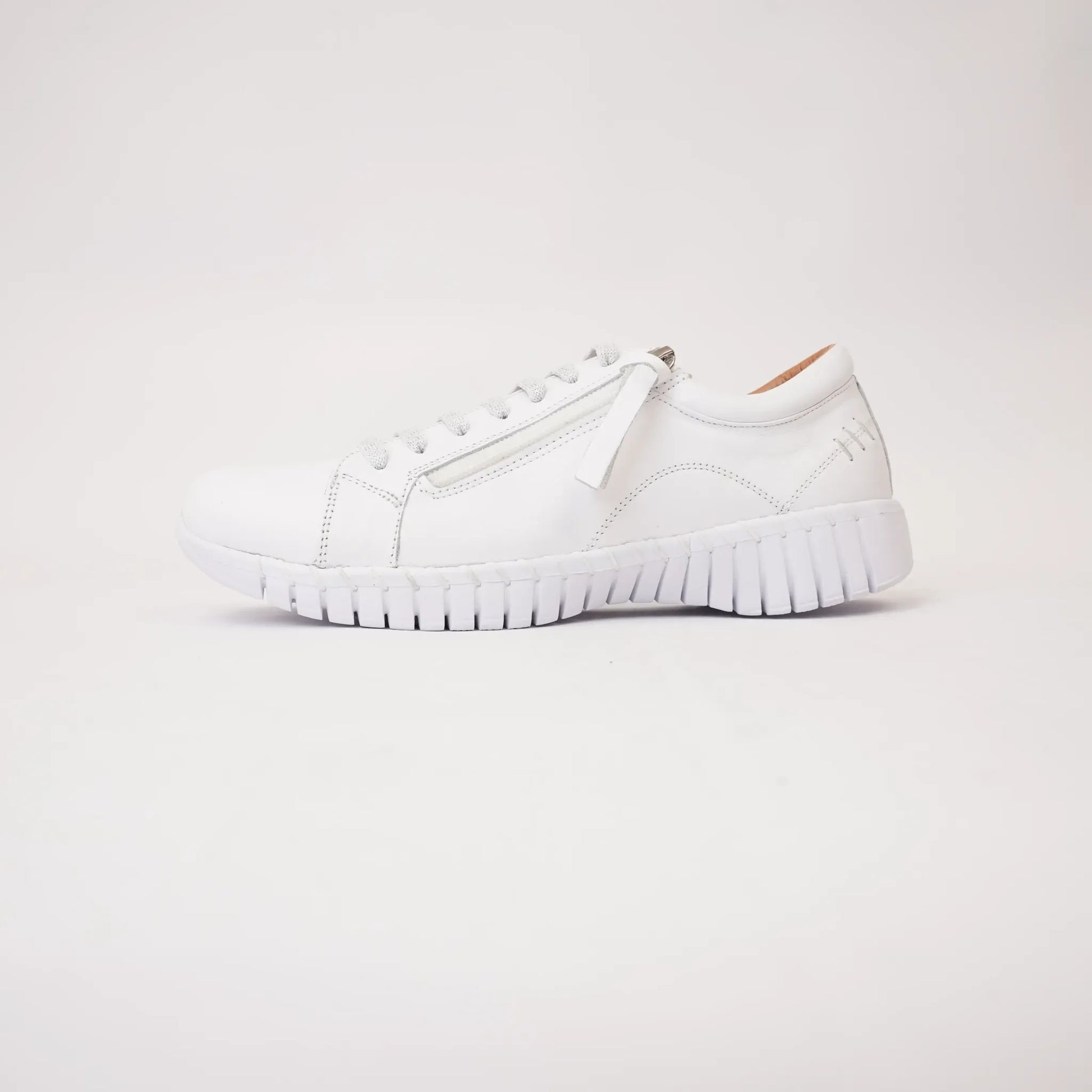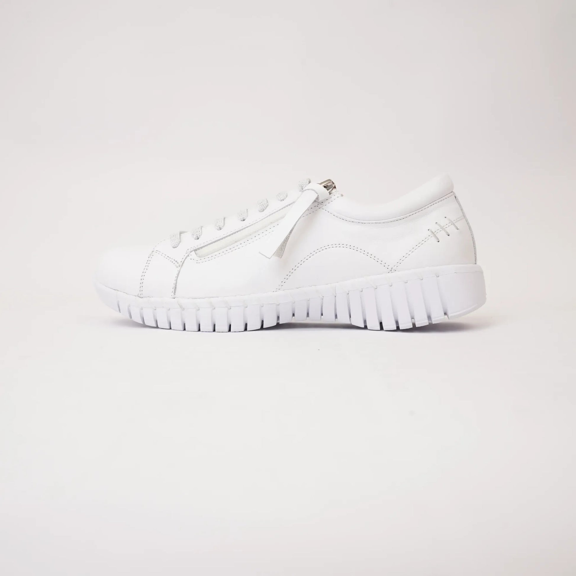 Elevate your style with our Bibi White Leather Sneakers by Sala. Crafted with a leather upper and lining, these shoes offer durability and a touch of luxury. The non-leather outsole and 3cm heel provide comfort and support for all-day wear. Plus, the lace-up design and outer foot side zipper add style and convenience. Made in Turkey, these sneakers are also orthotic-friendly.