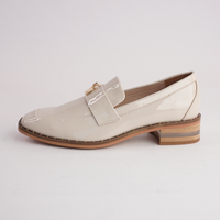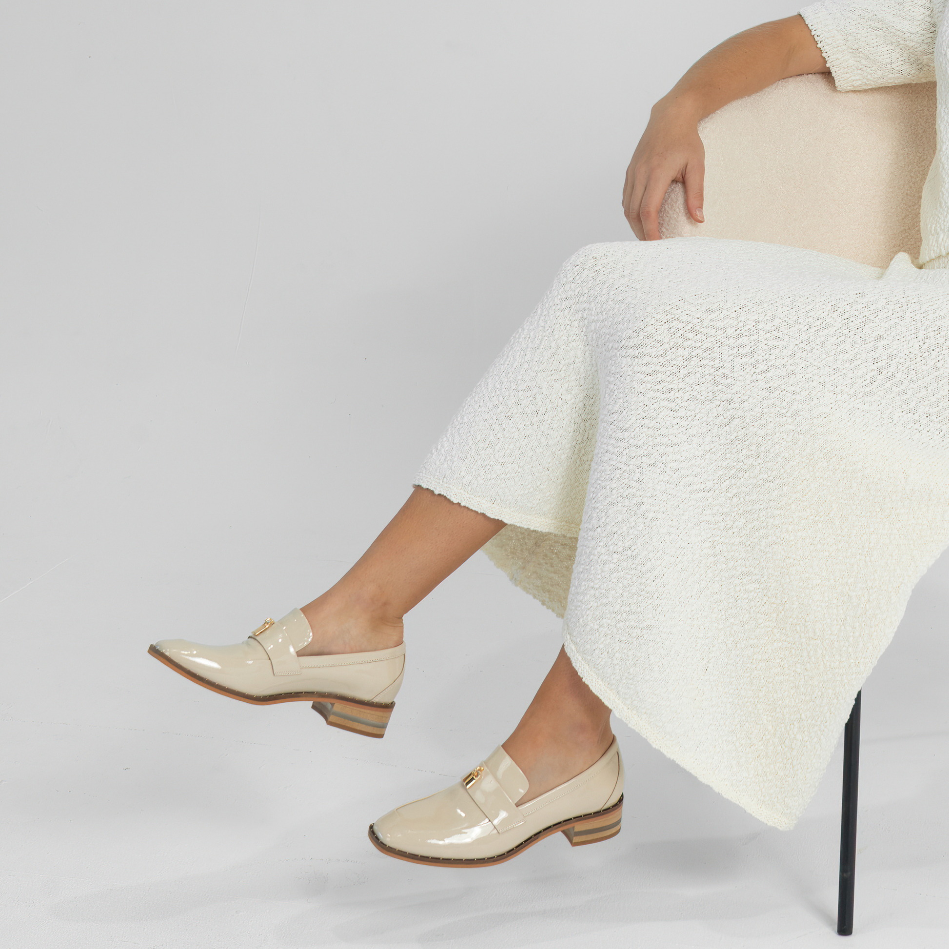 Step into sleek sophistication with the Fillipia loafers by Django & Juliette. Crafted in glossy vanilla patent leather, these loafers make a bold statement with a chic gold padlock detail and edgy studded welt. The low block heel adds just the right amount of lift, making them perfect for both workwear polish and weekend edge.