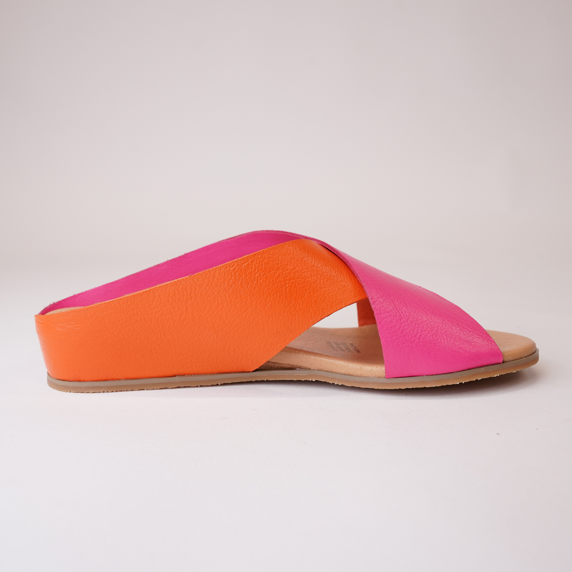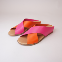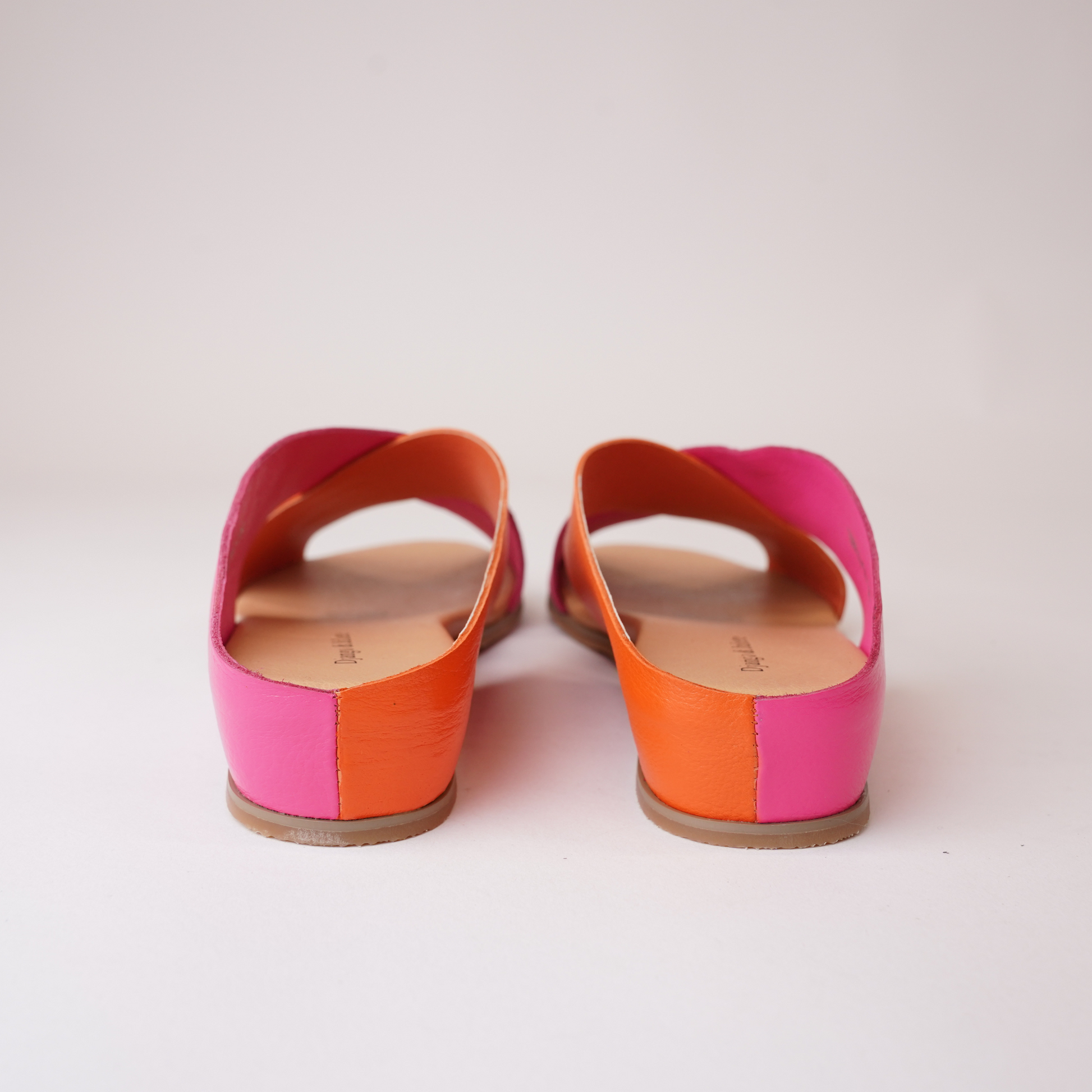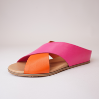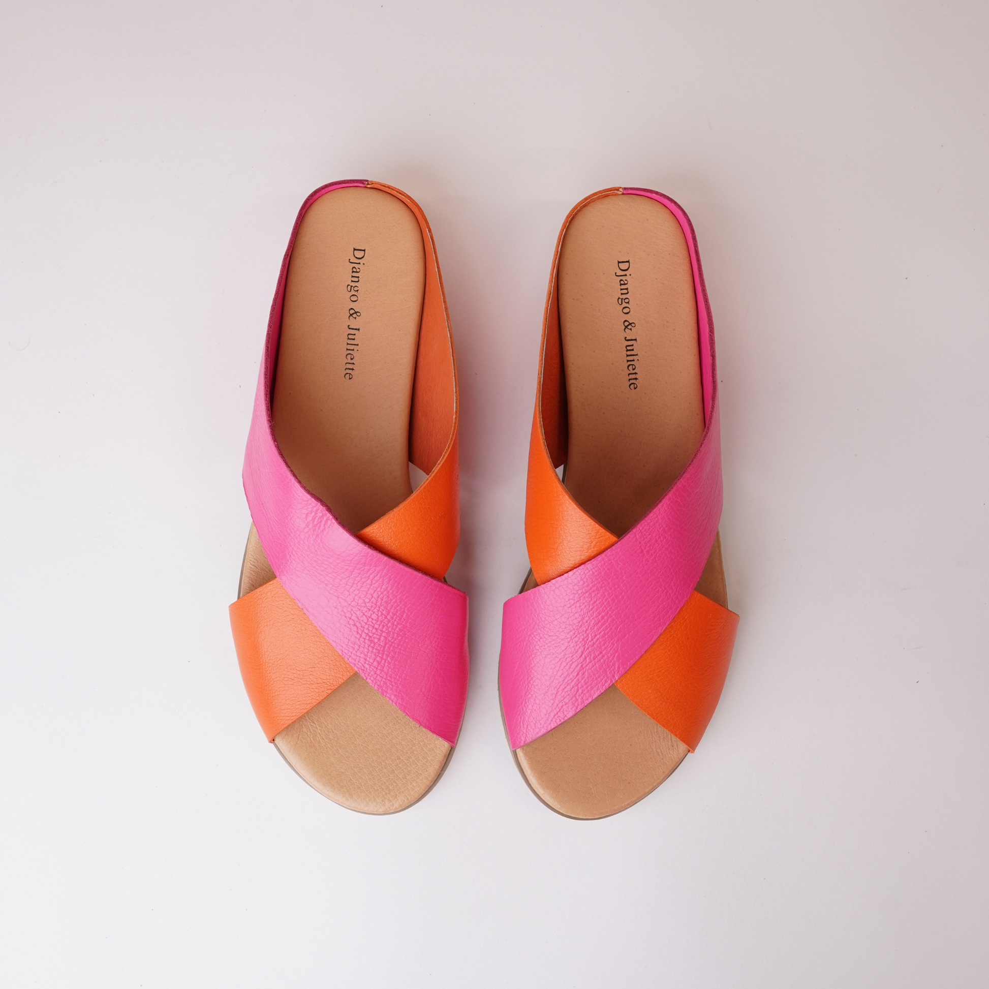Slip into style with Harli New Orange/ Hot Pink Leather Slides by Django & Juliette! These slides combine the comfort of a 3.5cm heel and leather lining with a playful twist- a two colour crossover leather upper. Perfect for any open-toe occasion, you'll stand out with this unique slide.
