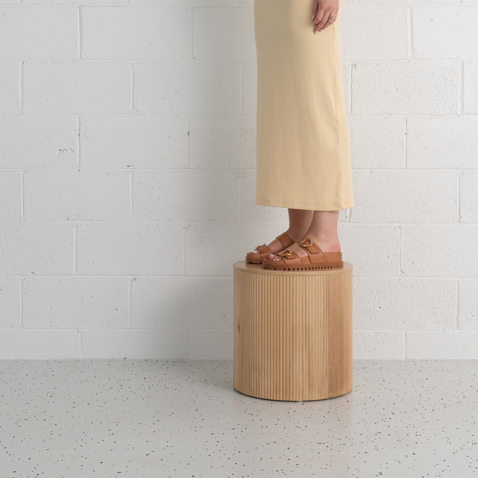 The Ullana Tan Leather Slides by Django & Juliette combine comfort and style with a smooth black leather upper and bold gold-tone buckle. A cushioned footbed ensures all-day comfort, while the chunky ridged sole adds traction and a modern edge. Perfect for laid-back outings, these slides bring effortless sophistication to any casual look.