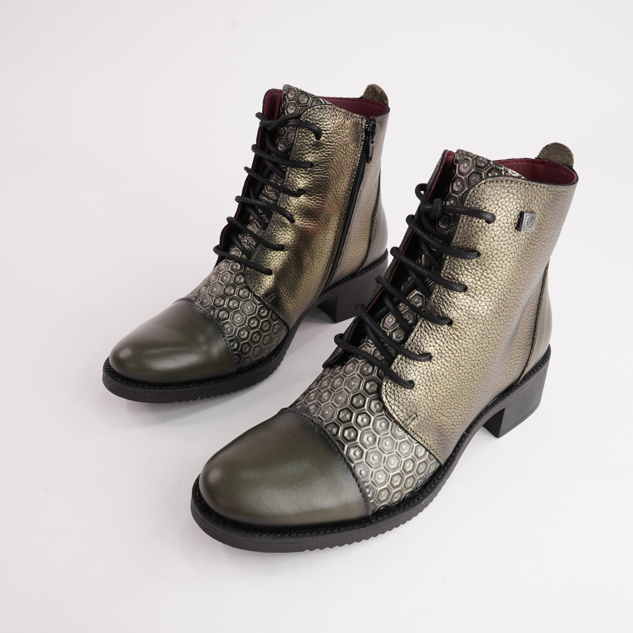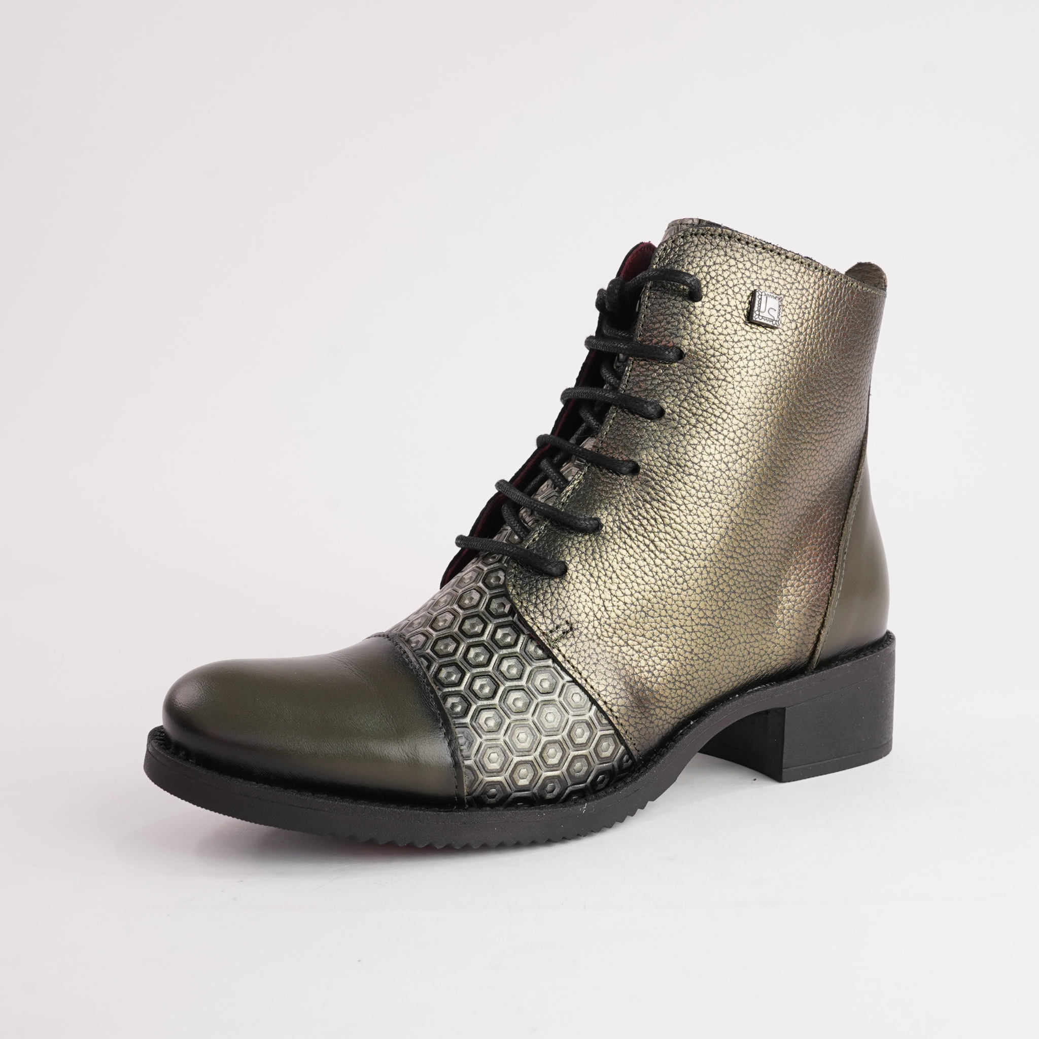 Shine with subtle edge in the JS-2180 Ankle Boots by Jose Saenz. Featuring a rich khaki metallic finish, embossed hexagonal panels, and a softly rounded toe, these boots are a true blend of contemporary texture and all-day comfort. Perfect for those who love to stand out without saying a word.