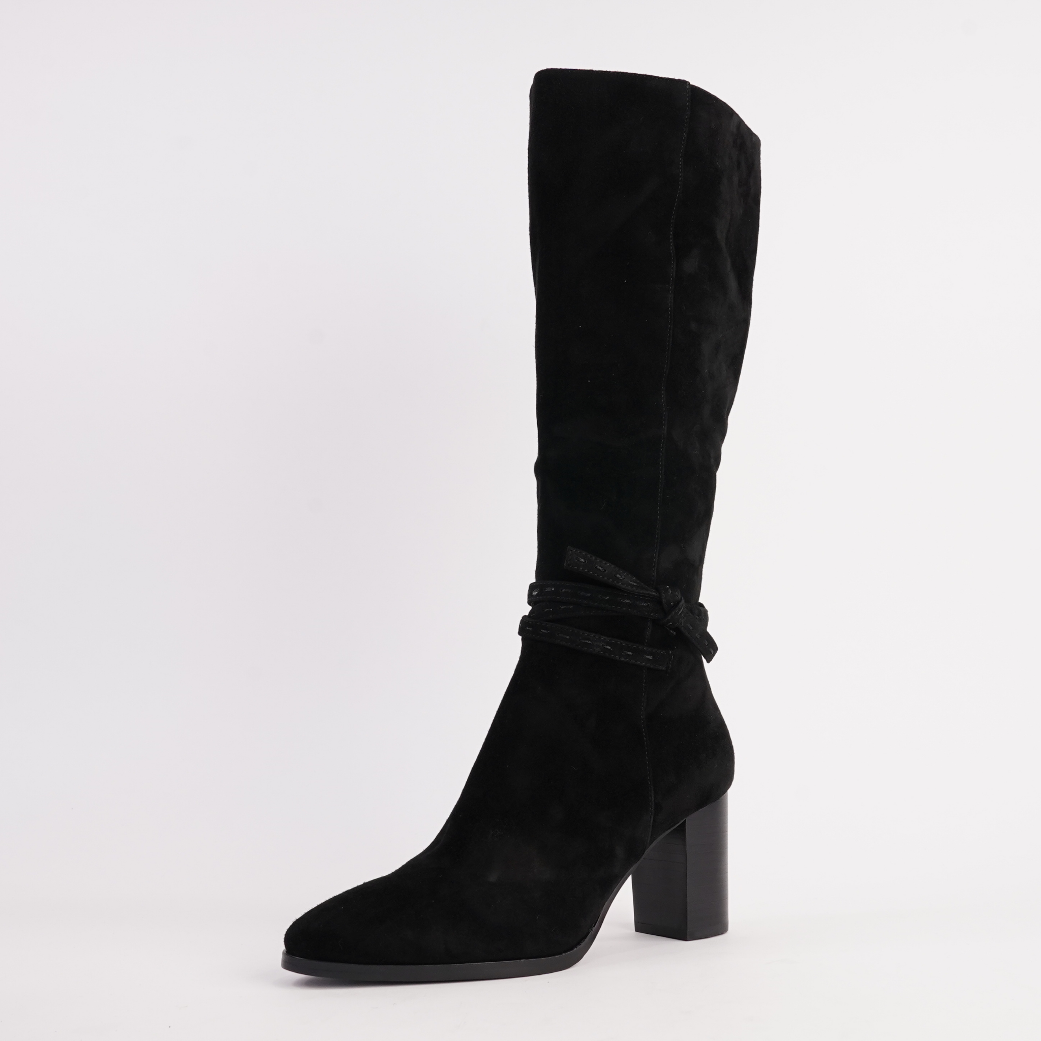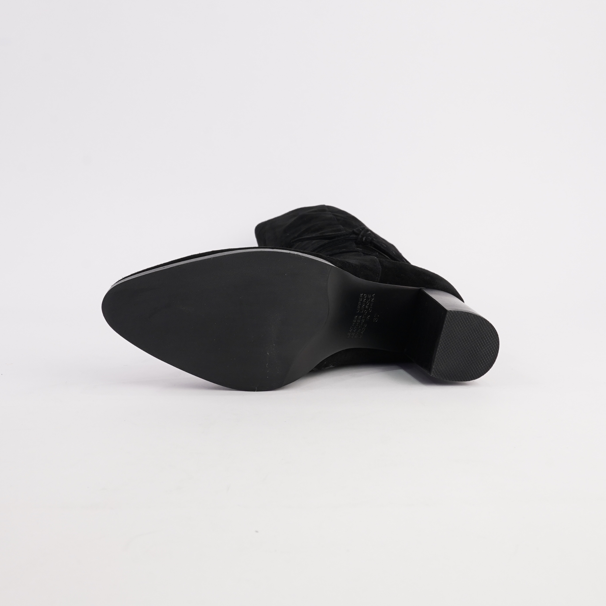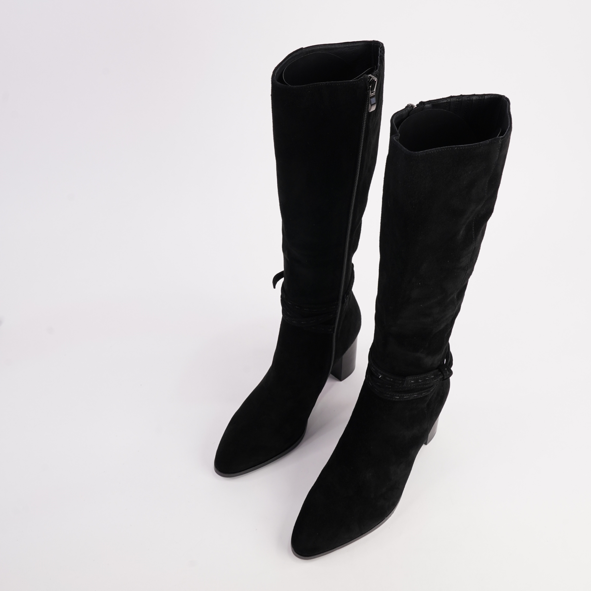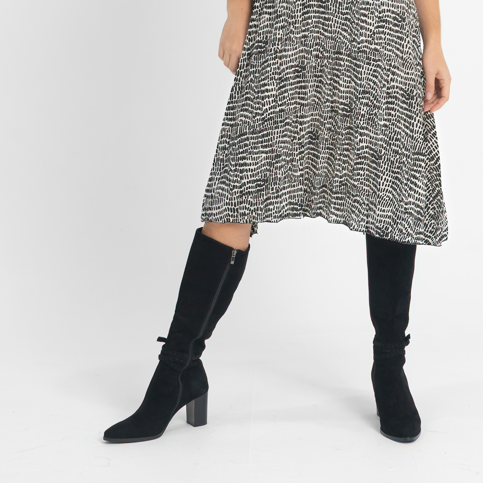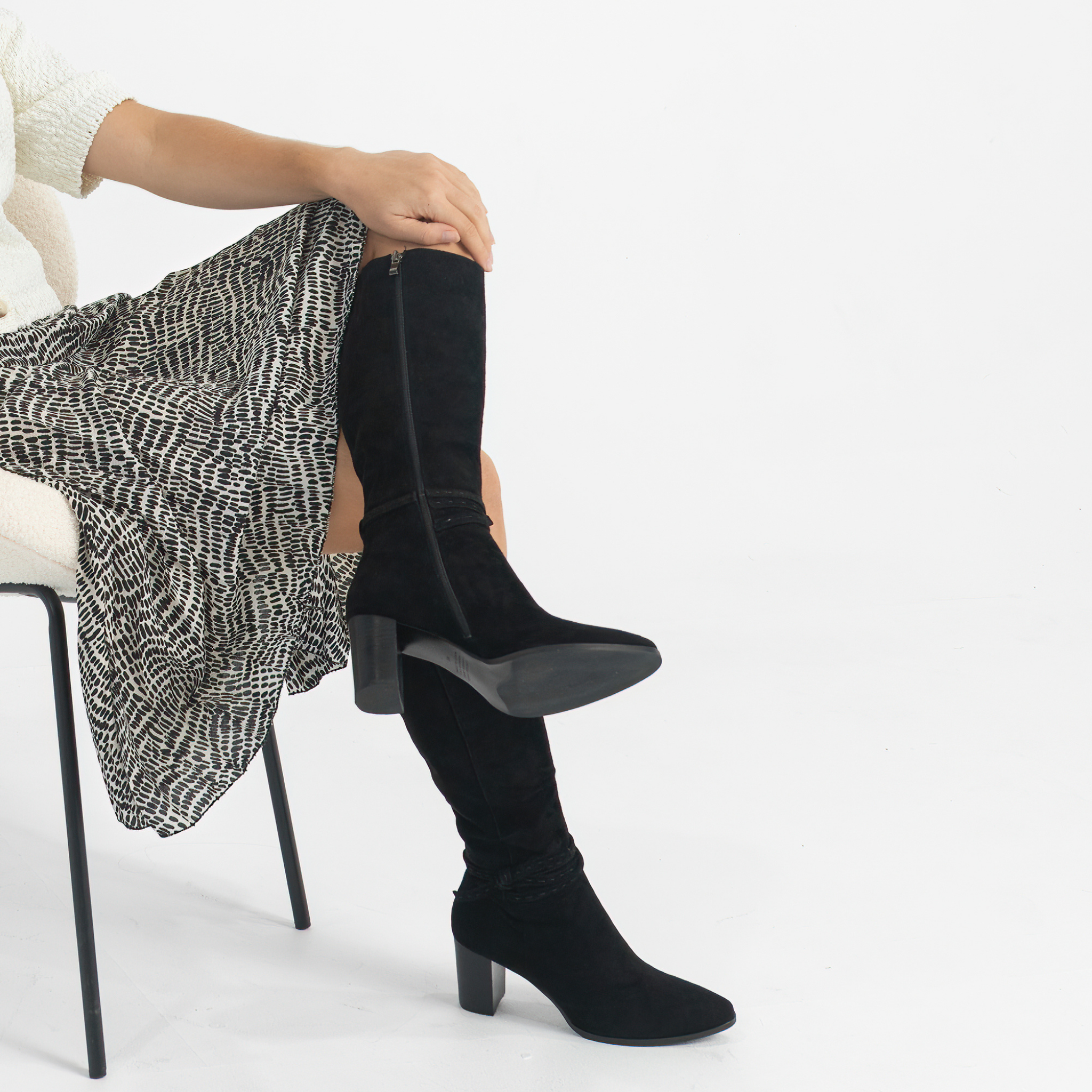 Step into effortless sophistication with the Tirry Knee High Boots by Django & Juliette. Crafted in rich black stretch microsuede, this sleek silhouette features a pointed toe, mid block heel, and embellished strap detailing for a touch of subtle glamour. Perfect for styling with everything from dresses to denim.