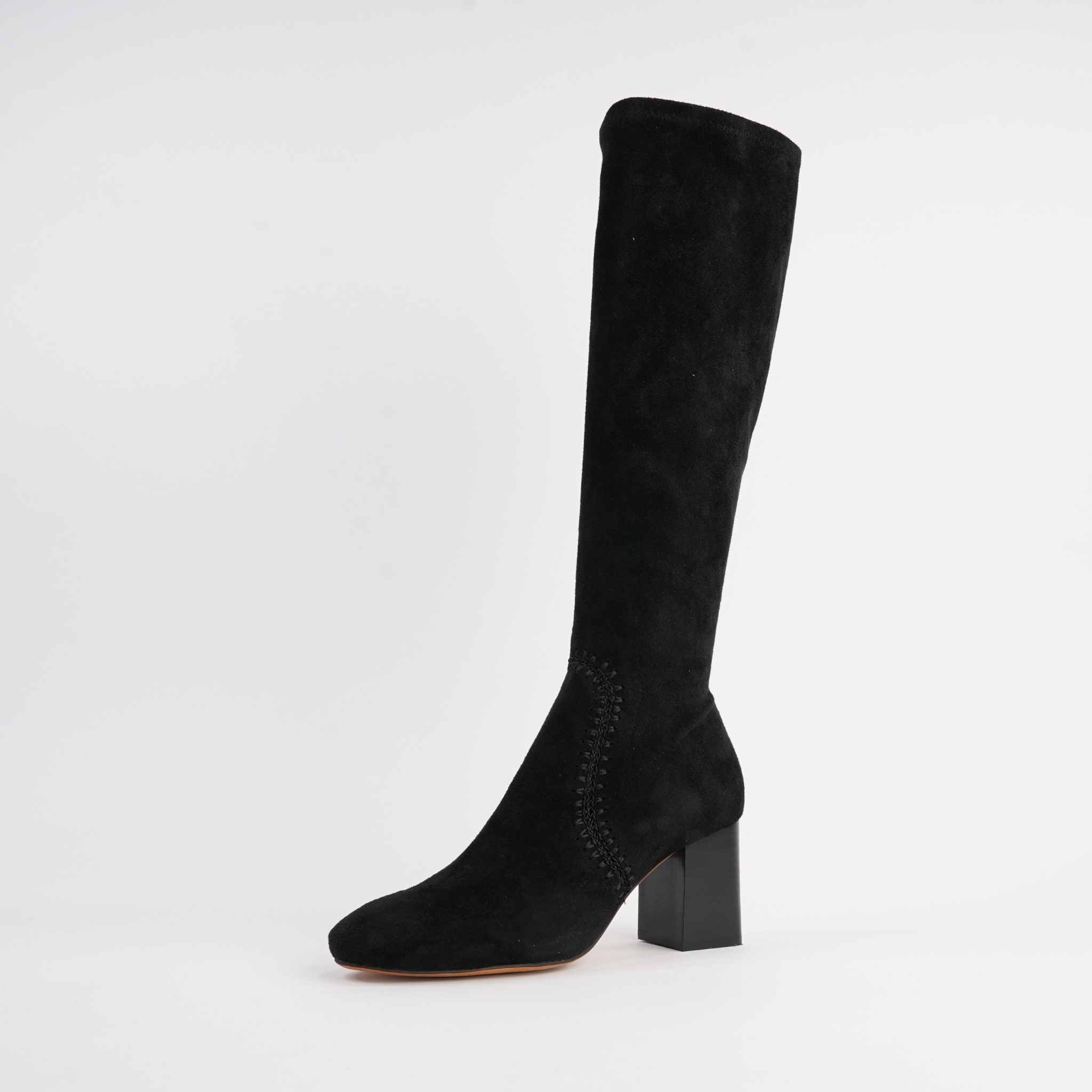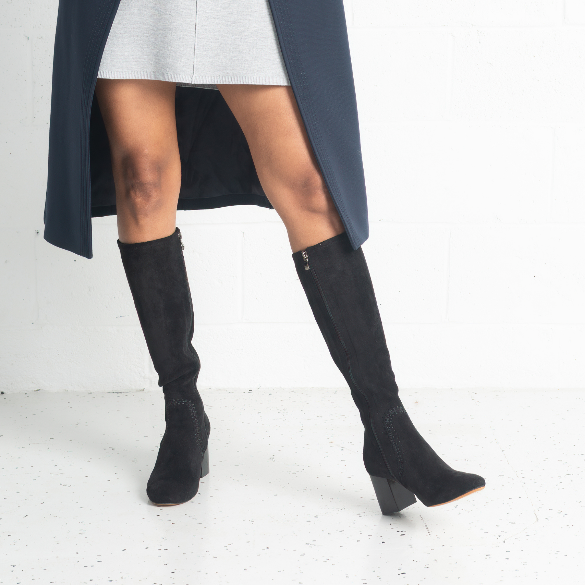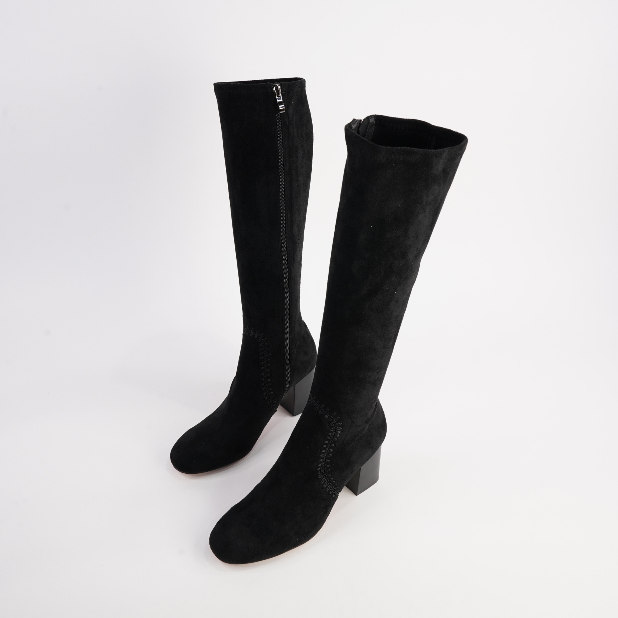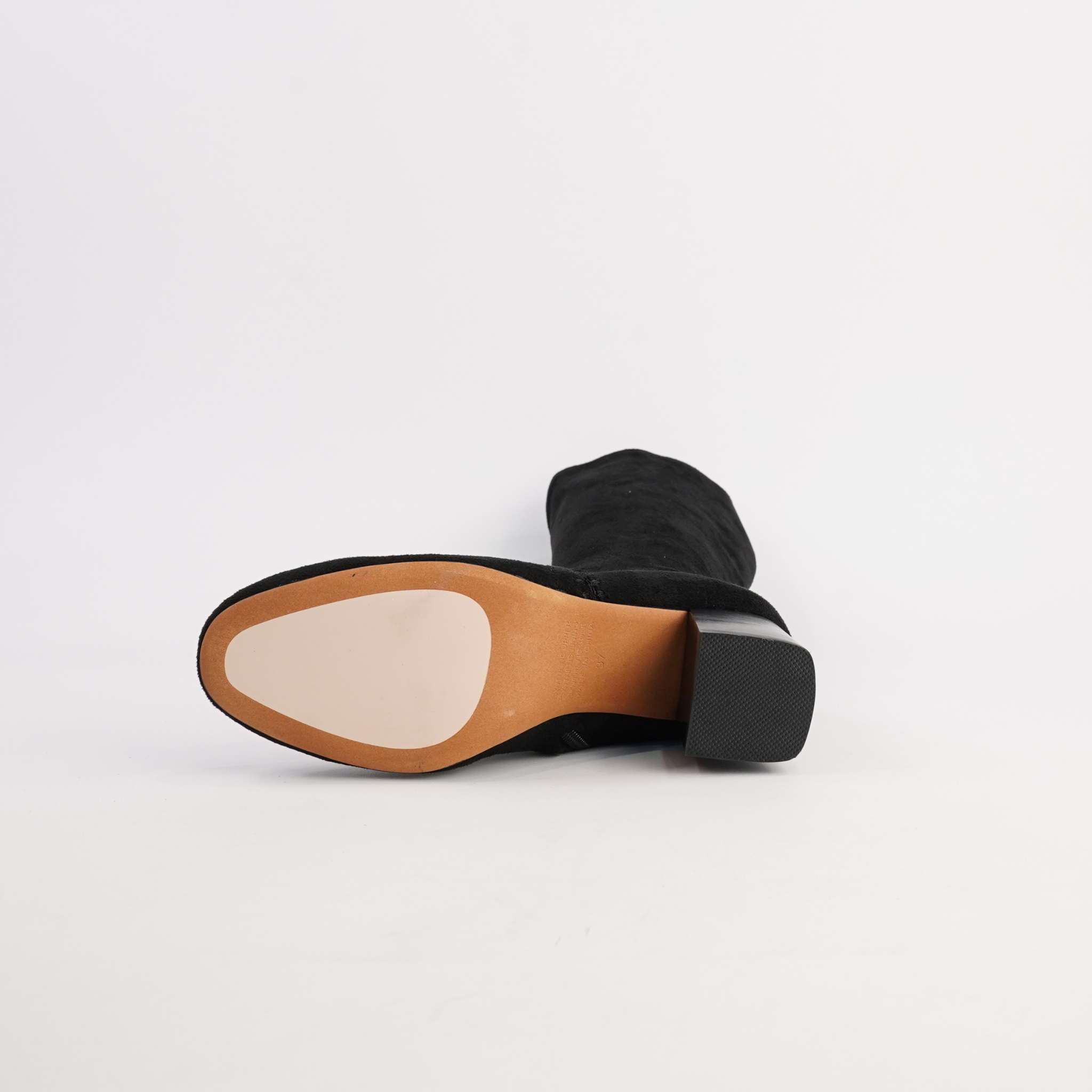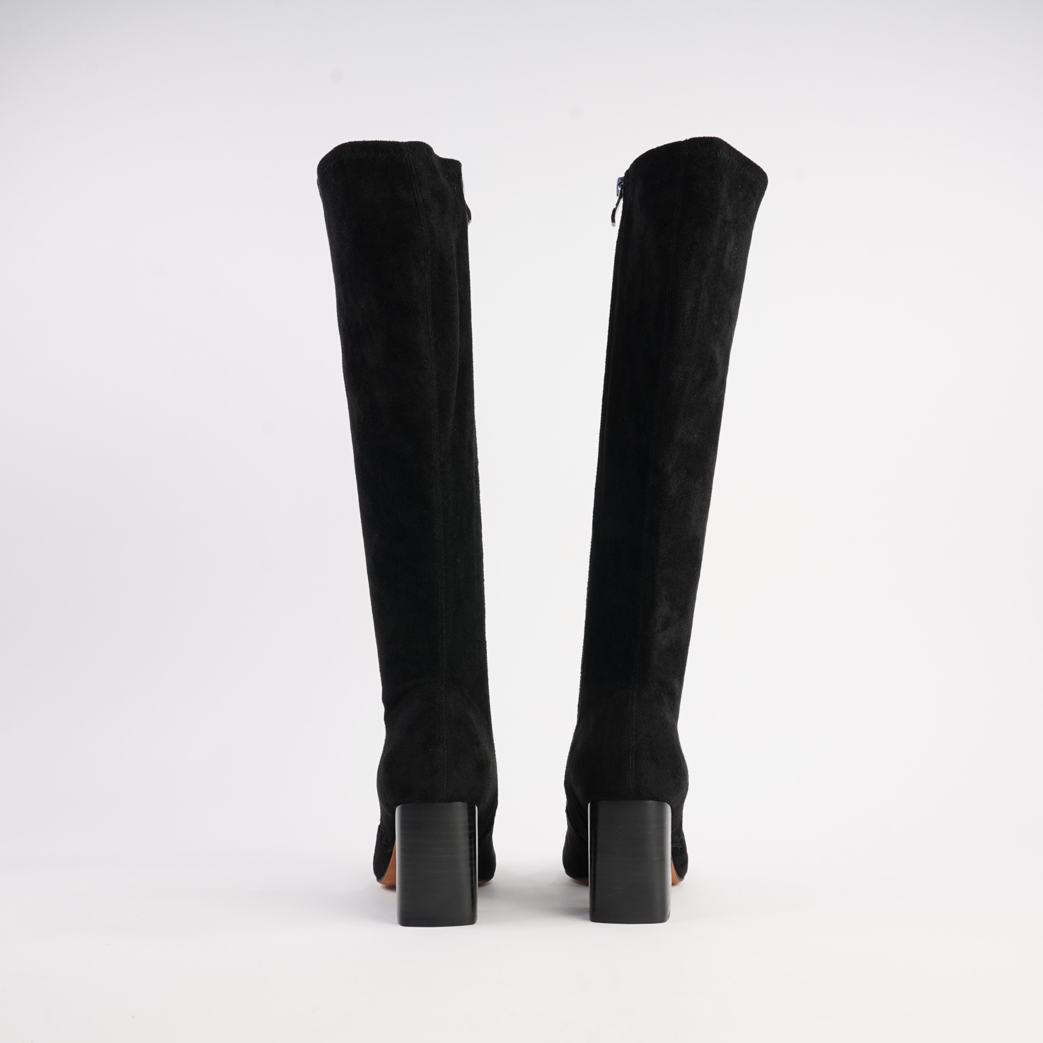 The Sari Boots by Mollini are the epitome of understated elegance. Crafted in stretch black microsuede, this knee-high silhouette hugs the leg beautifully and features subtle stitched detailing for a refined finish. A flared block heel adds height and balance for comfortable all-day wear.