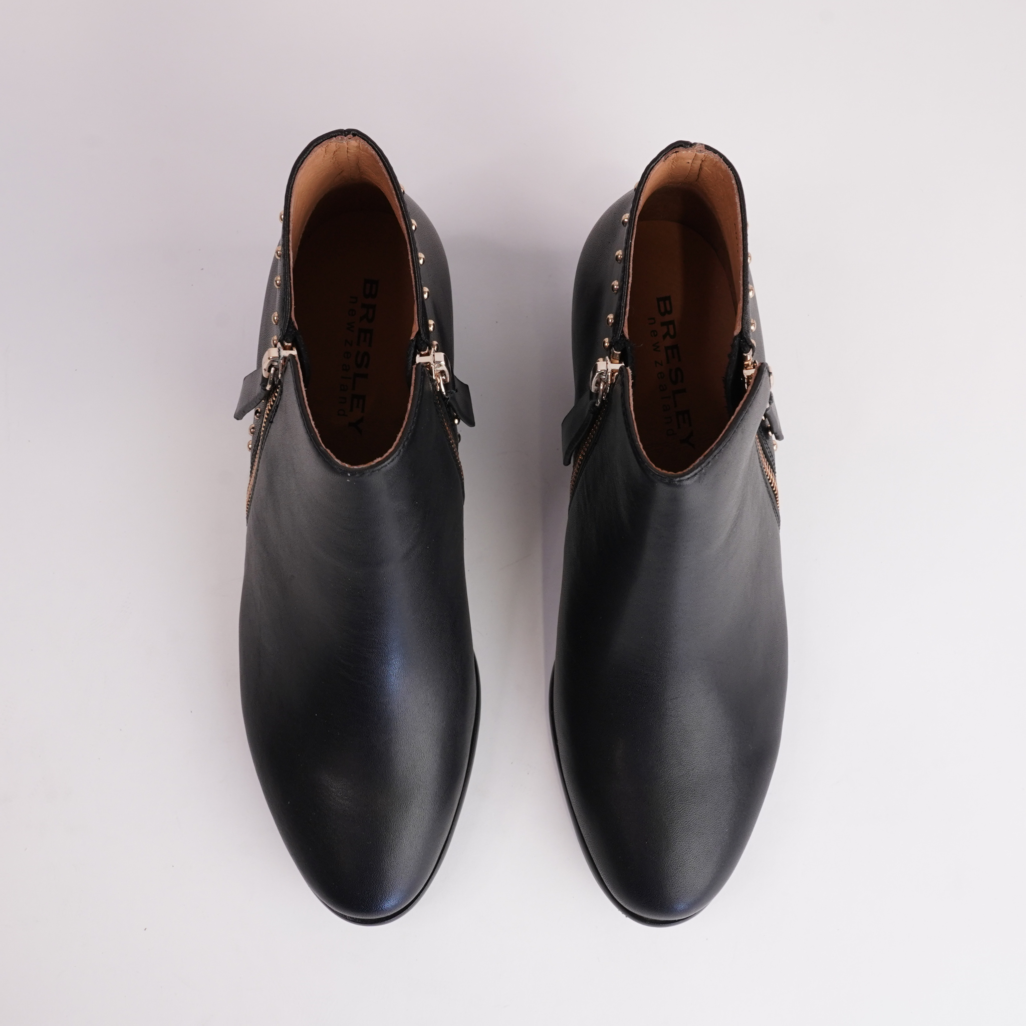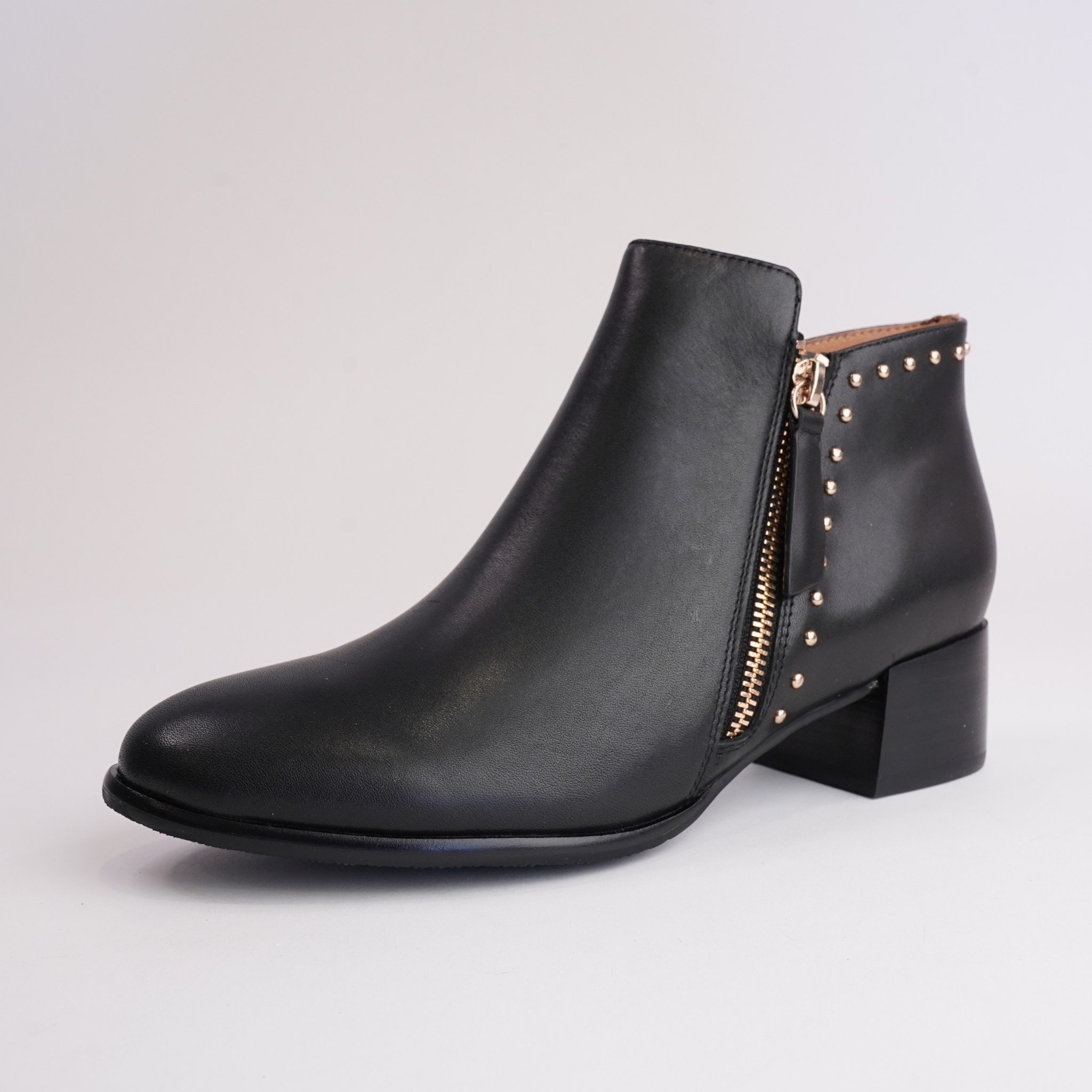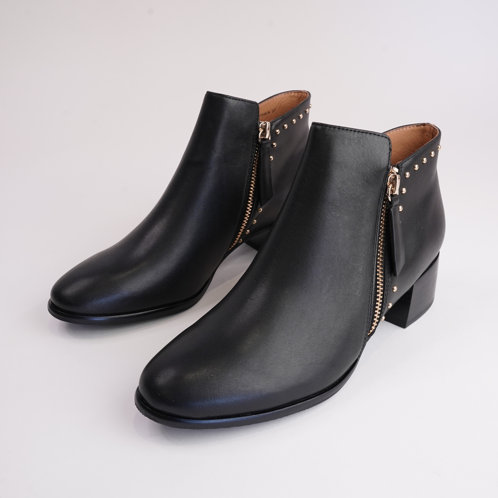 The Anthea ankle boots by Bresley combine classic elegance with modern edge, featuring a smooth black leather upper accented by gold-tone stud detailing at the heel. A functional side zip allows for easy wear, while the stacked block heel and cushioned insole provide lasting comfort. Perfect for dressing up your everyday wardrobe or adding a refined touch to evening looks.