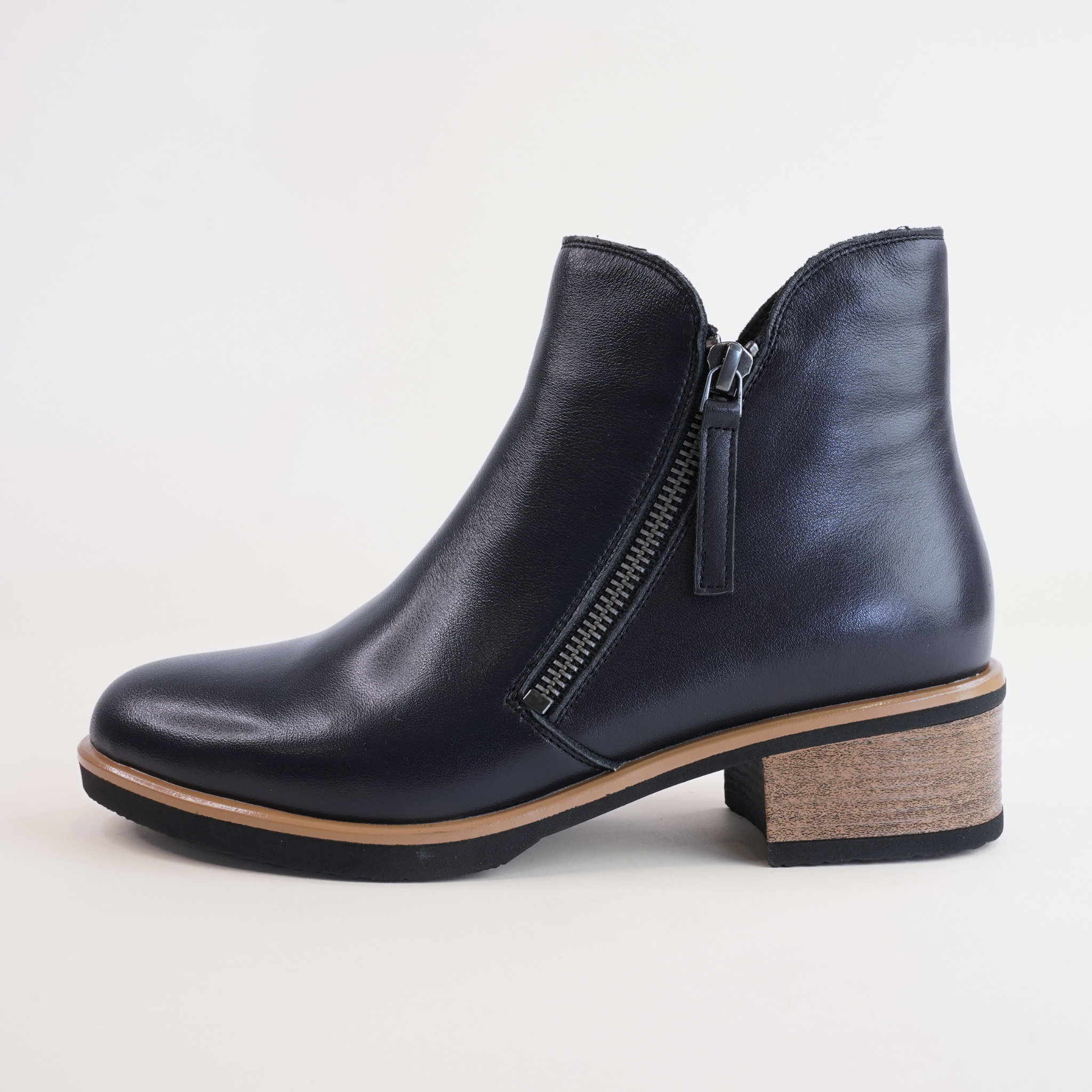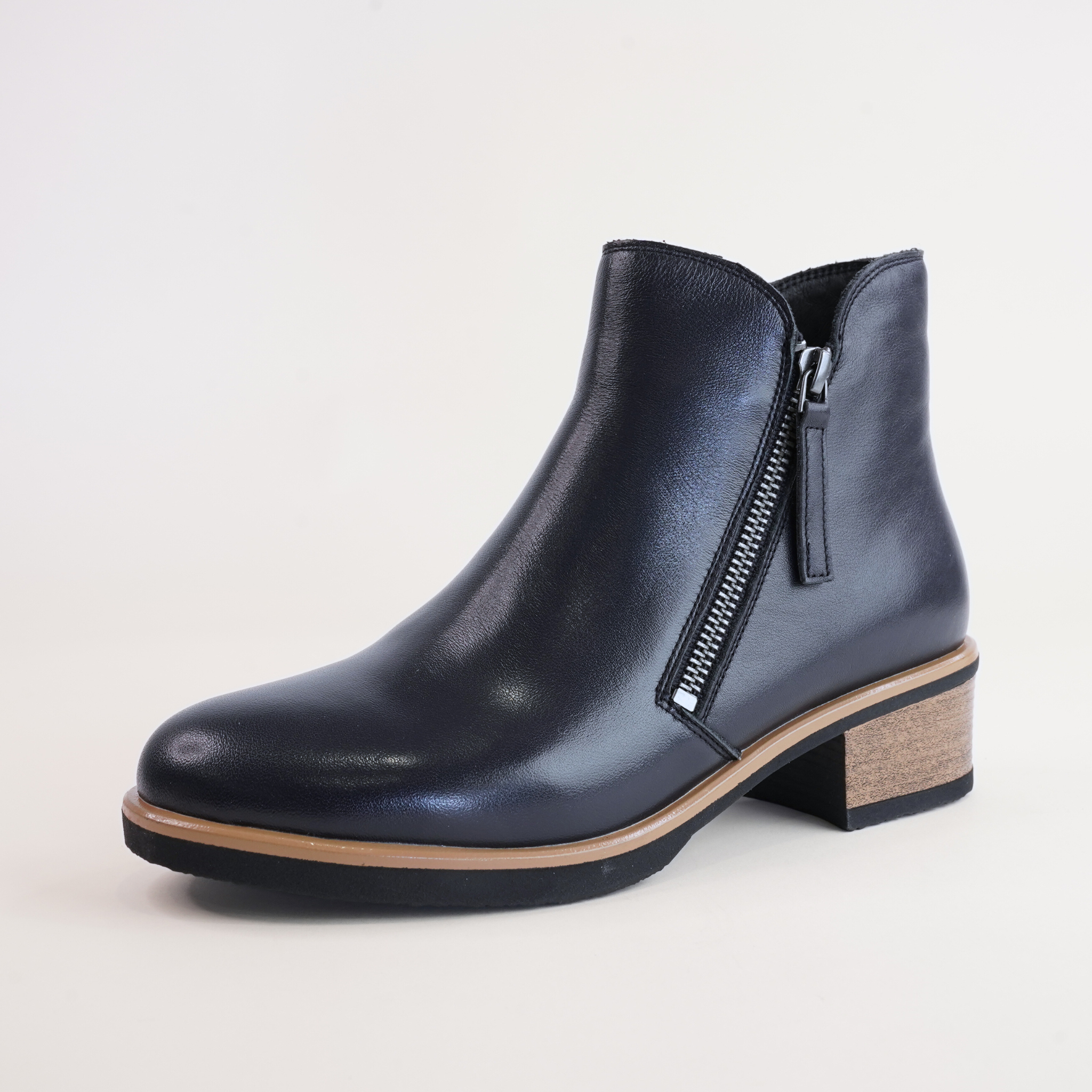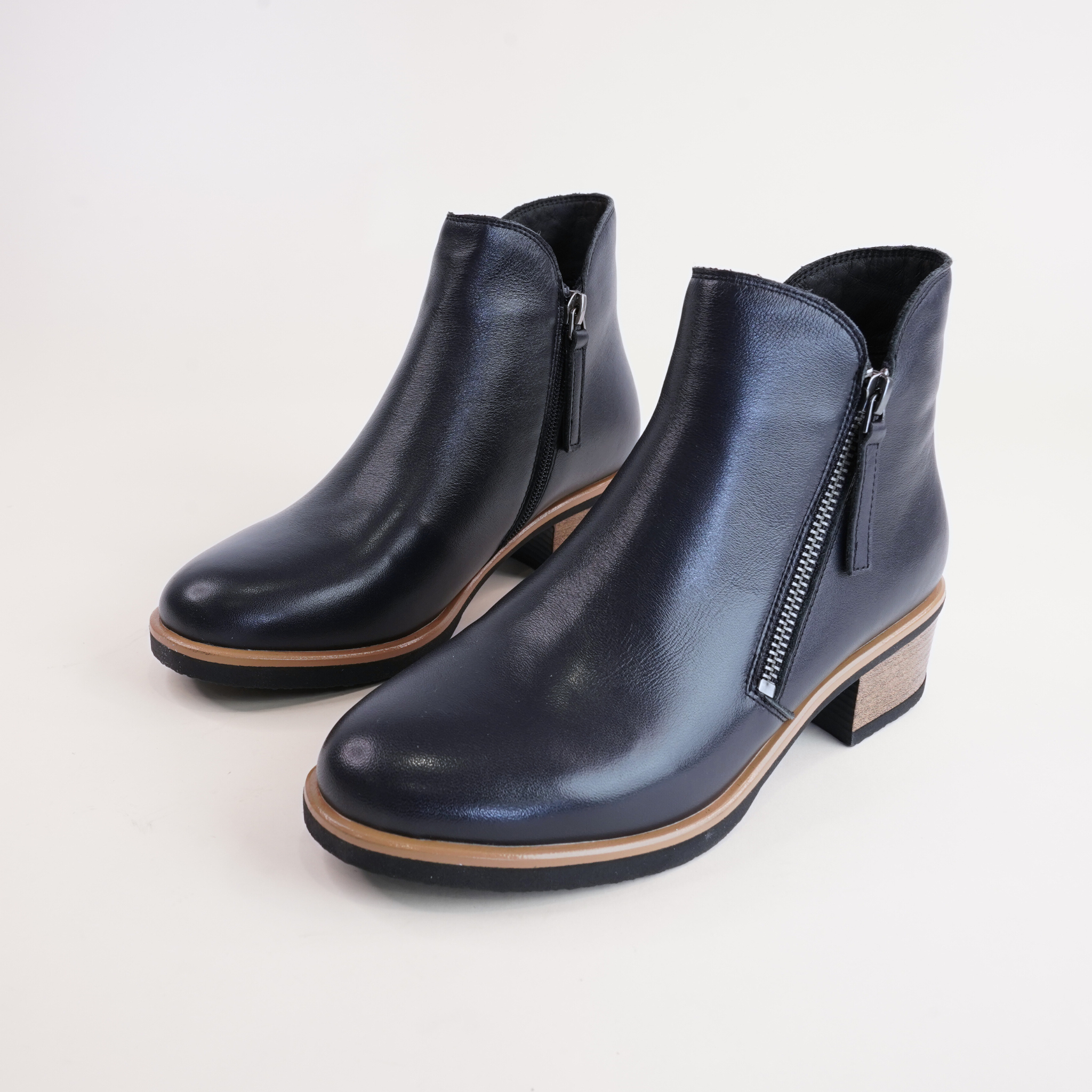 The Dolomite Ankle Boots blend classic style with modern comfort, featuring a smooth navy leather upper, two functional side zippers, and a stable block heel. Orthotic-friendly with a removable insole, they provide the perfect balance of support and style.