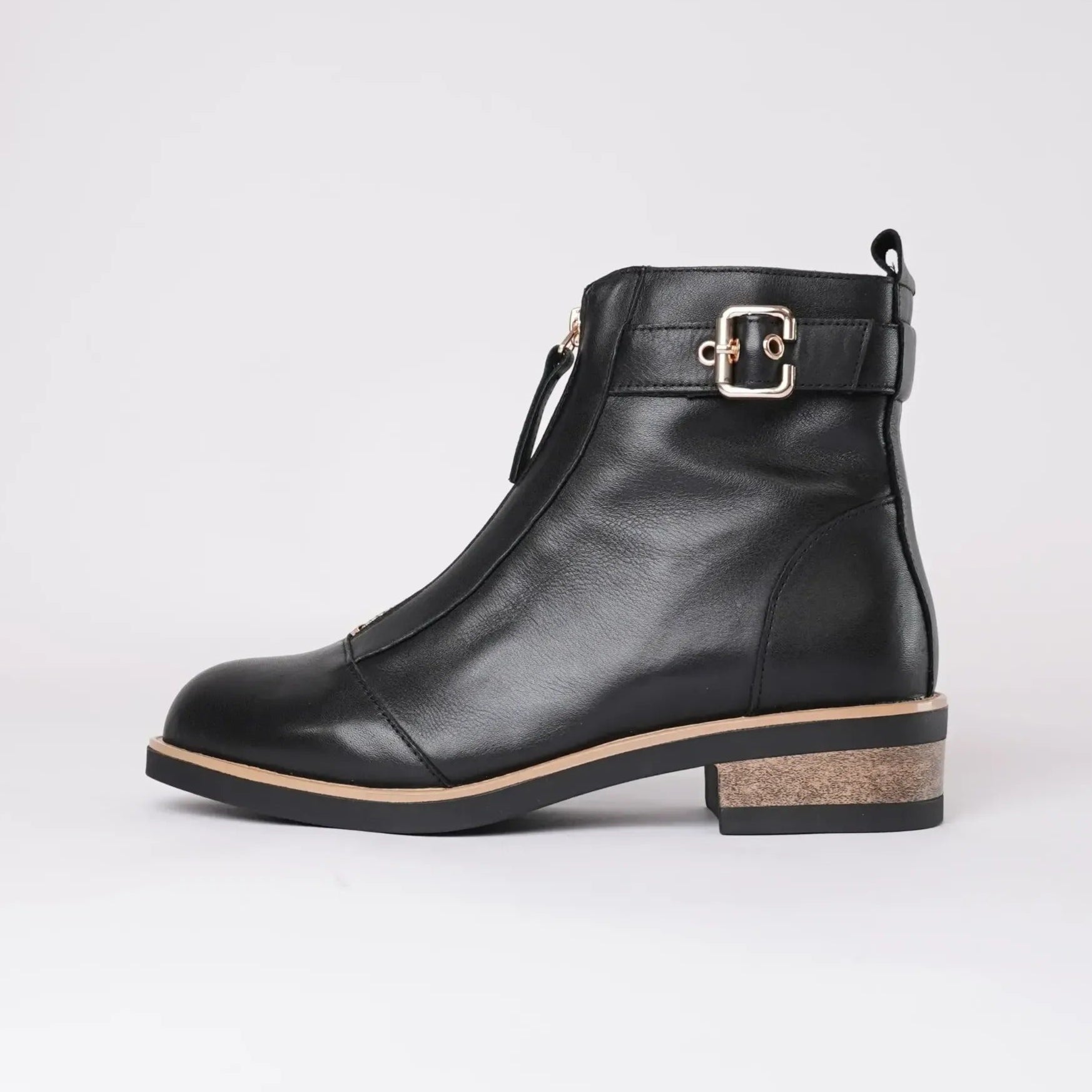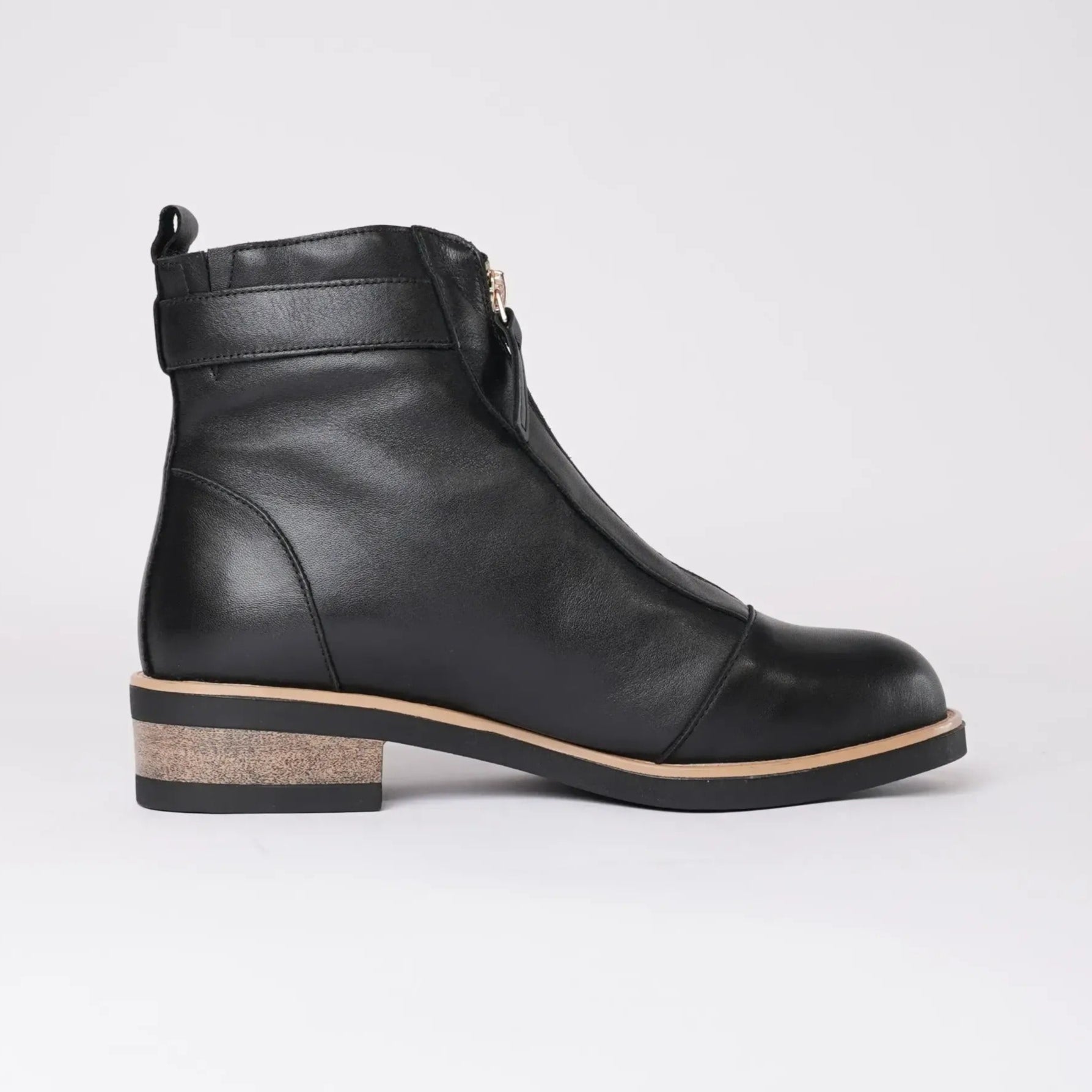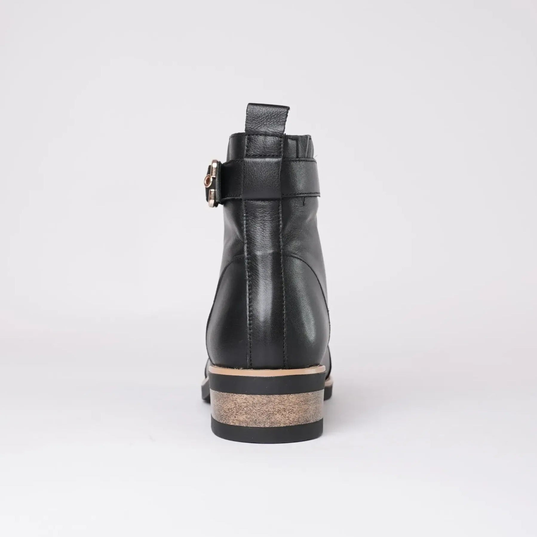 Introducing the Dooley Black Leather Ankle Boots by Bresley where style meets comfort and functionality. Made with a leather upper and lining, they feature a 3cm cork look and rubber heel, a functional metal zip and decorative buckle and strap. Plus, with a back pull tab and elasticated inner top, they are both easy to slip on and remove. Take on the day with these orthotic friendly boots!