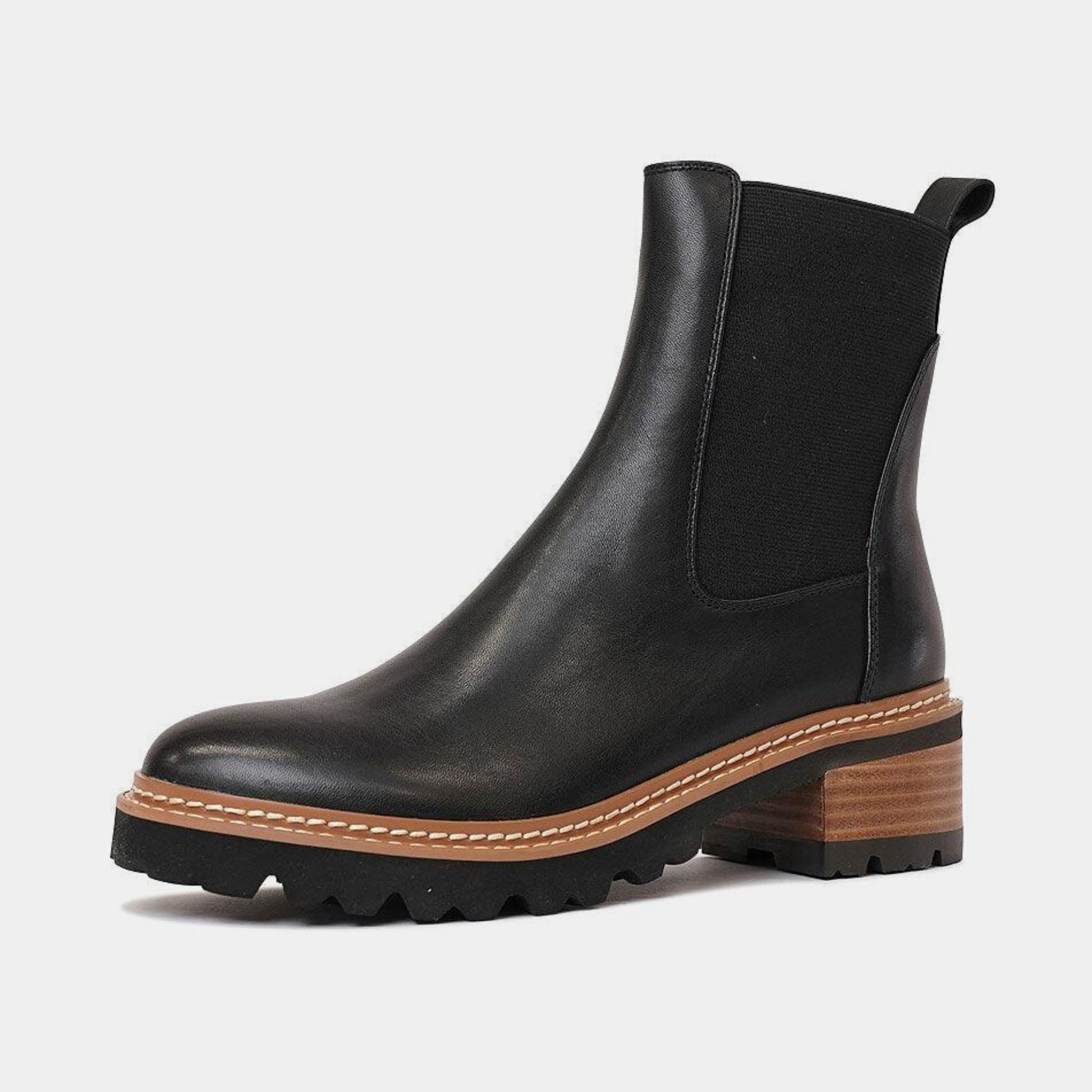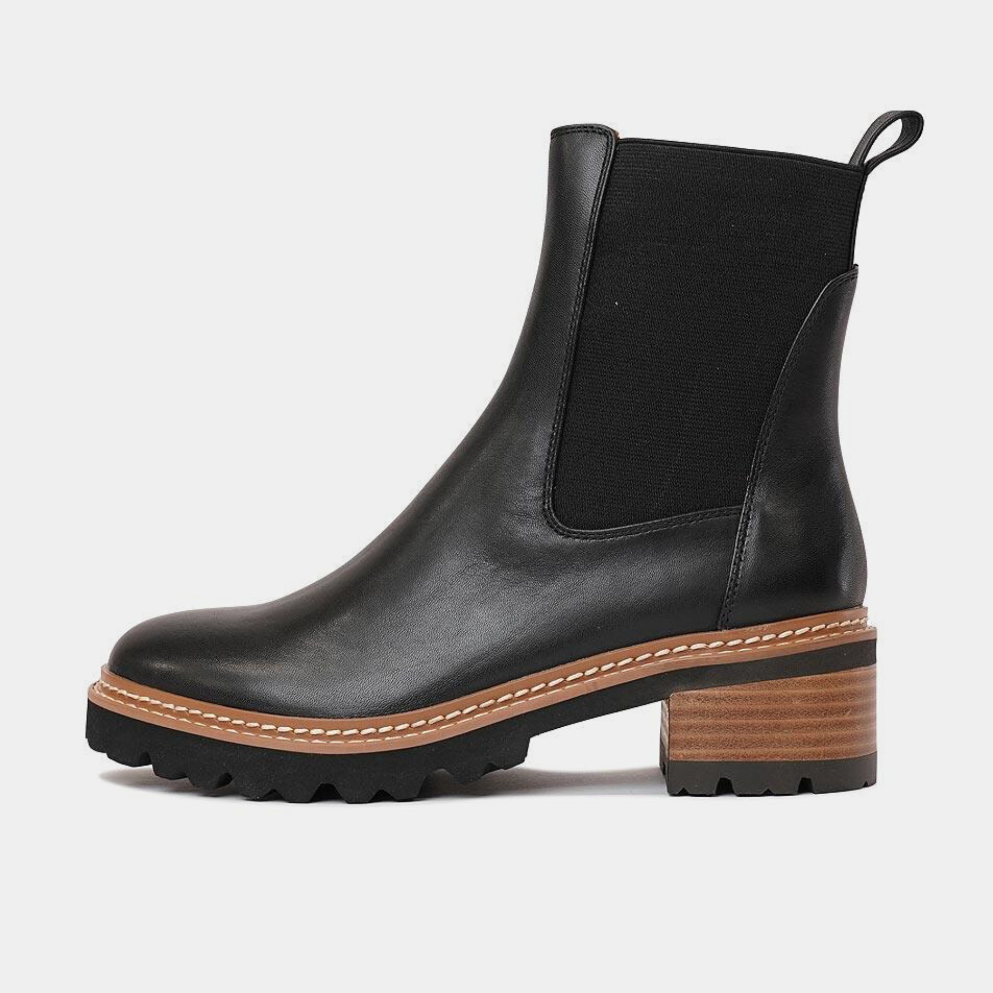Crafted with a sleek leather upper, these Linear Black Leather Ankle Boots by EOS Footwear provide exceptional style and comfort. The 5cm woodlook and black heel offers a sophisticated touch, while the elasticated inner and outer panels ensure a snug fit. Perfect for any occasion, these boots are a must-have for your shoe collection.
