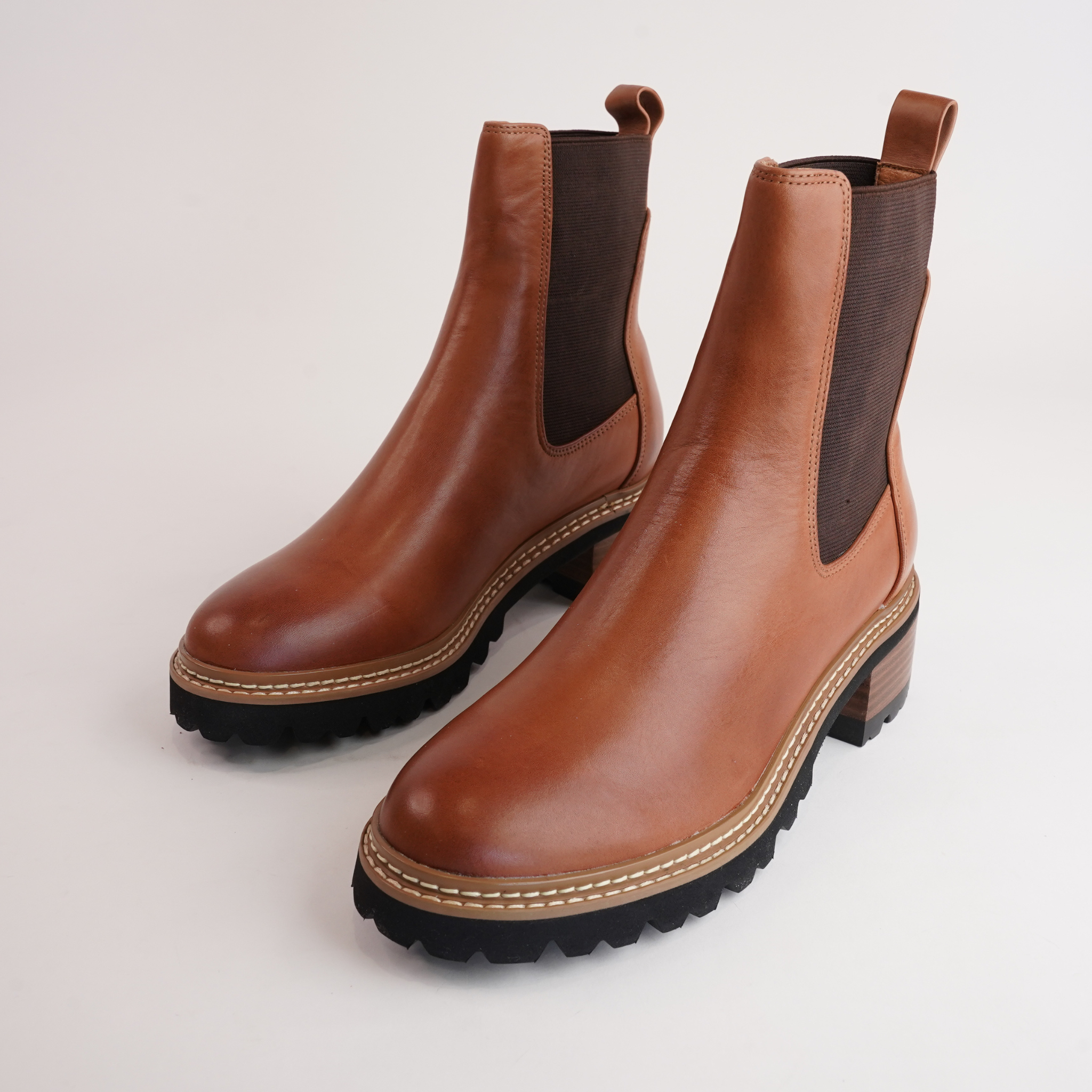 Crafted with a sleek leather upper, these Linear Brandy Leather Ankle Boots by EOS Footwear provide exceptional style and comfort. The 5cm woodlook and black heel offers a sophisticated touch, while the elasticated inner and outer panels ensure a snug fit. Perfect for any occasion, these boots are a must-have for your shoe collection.