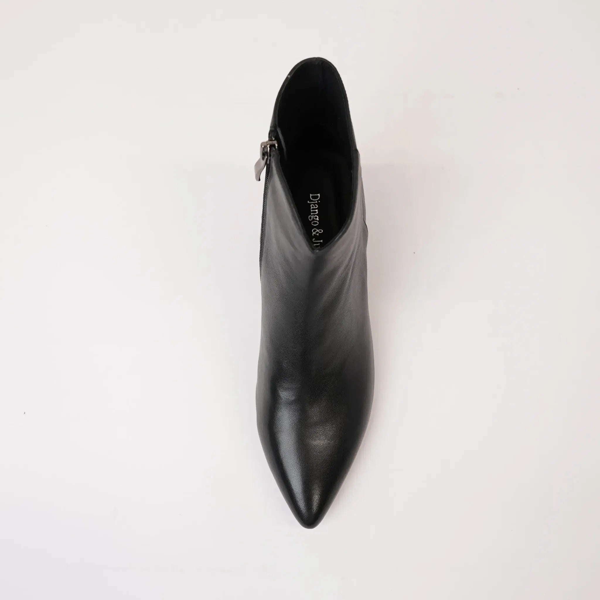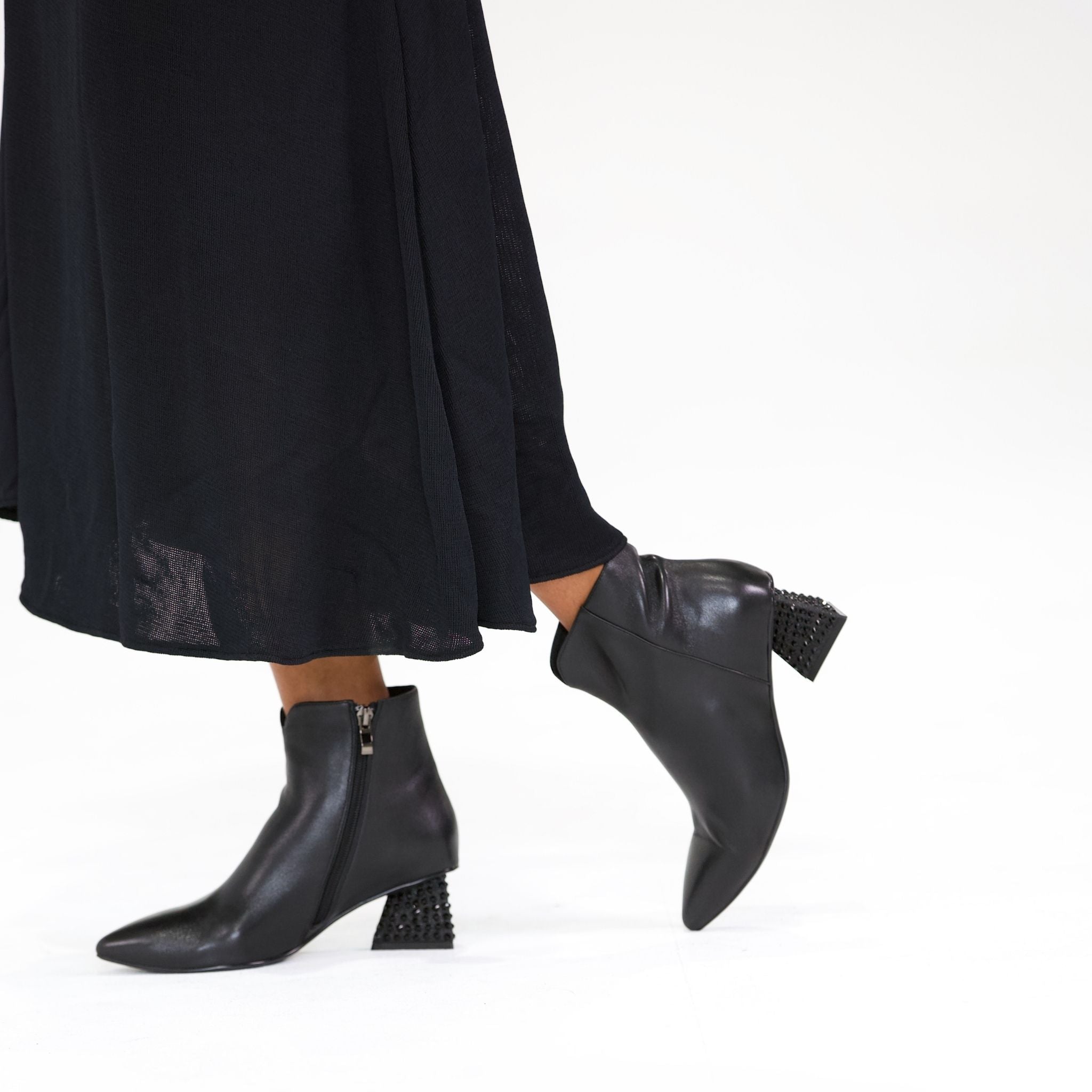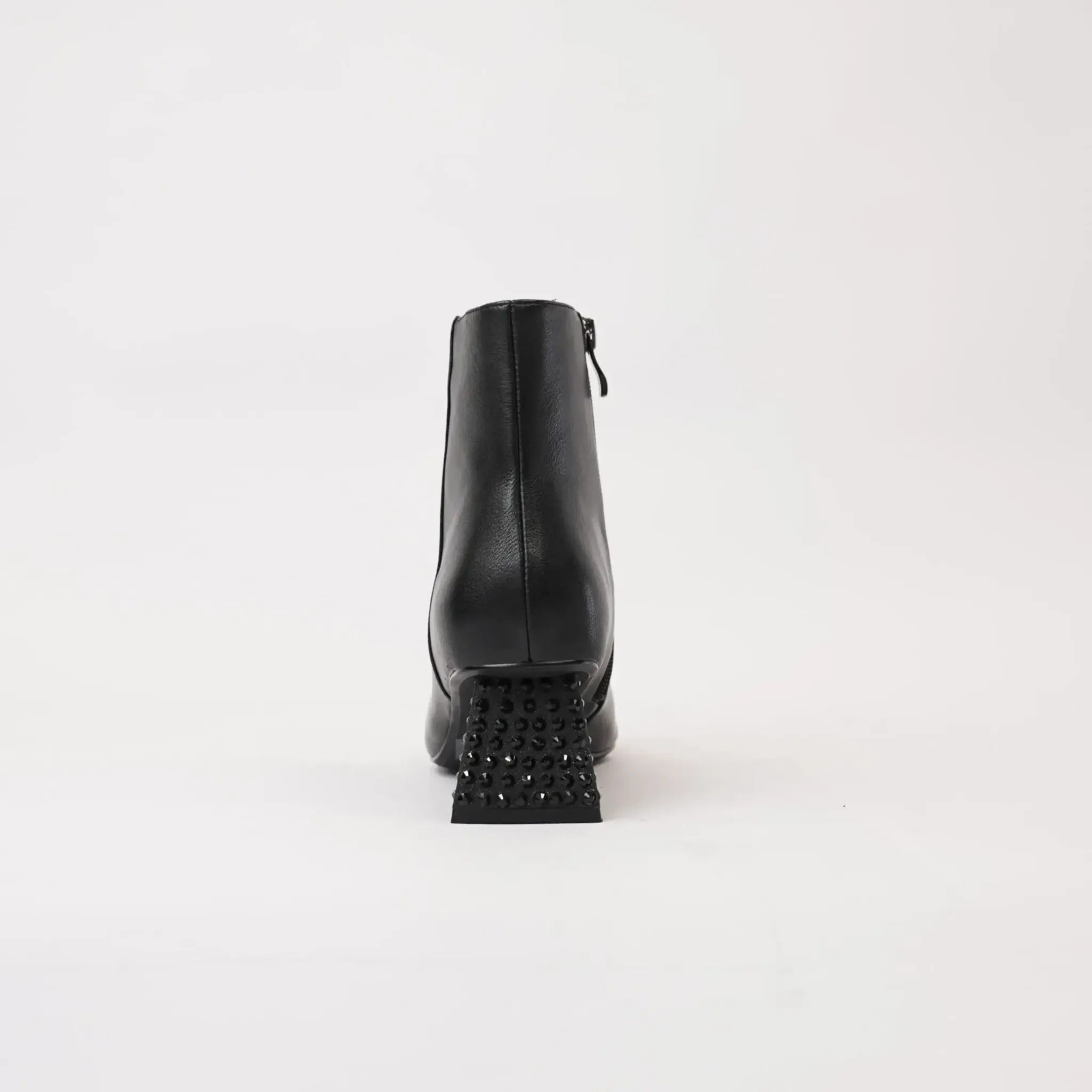 Add some sparkle to your step with Malitta Black Leather Ankle Boots by Django & Juliette. The leather upper and lining provide comfort, while the 5cm geometric heel adds a touch of height. The functional metal zip and padded insole make these boots practical, and the decorative rhinestones on the heel add a playful touch. Let your feet do the talking with these boots!