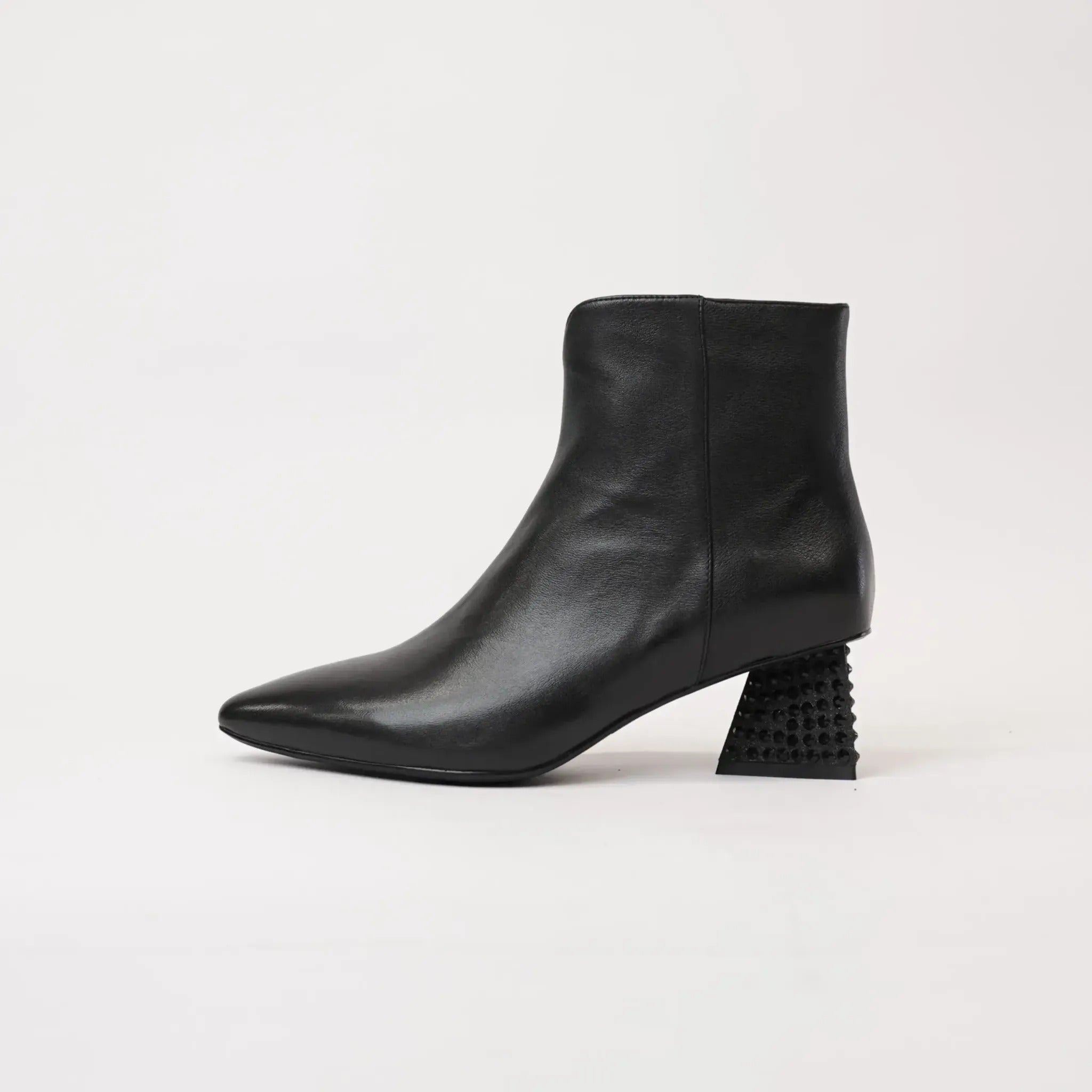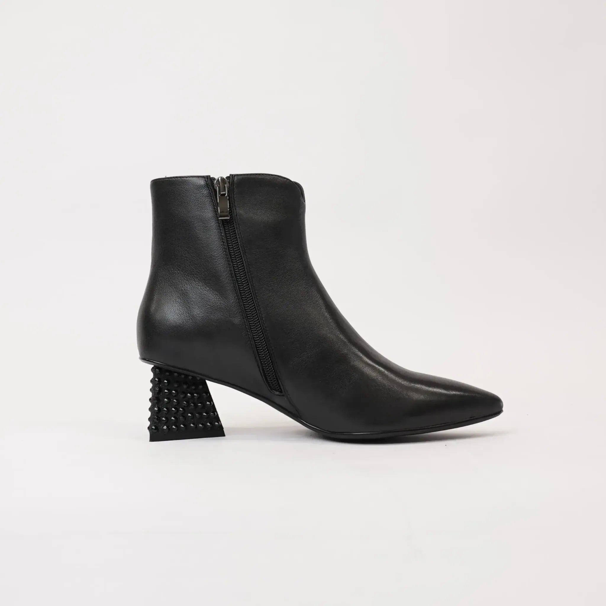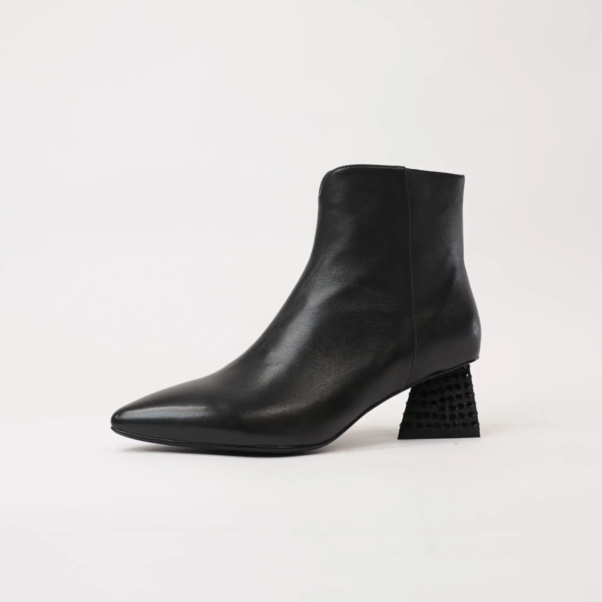 Add some sparkle to your step with Malitta Black Leather Ankle Boots by Django & Juliette. The leather upper and lining provide comfort, while the 5cm geometric heel adds a touch of height. The functional metal zip and padded insole make these boots practical, and the decorative rhinestones on the heel add a playful touch. Let your feet do the talking with these boots!