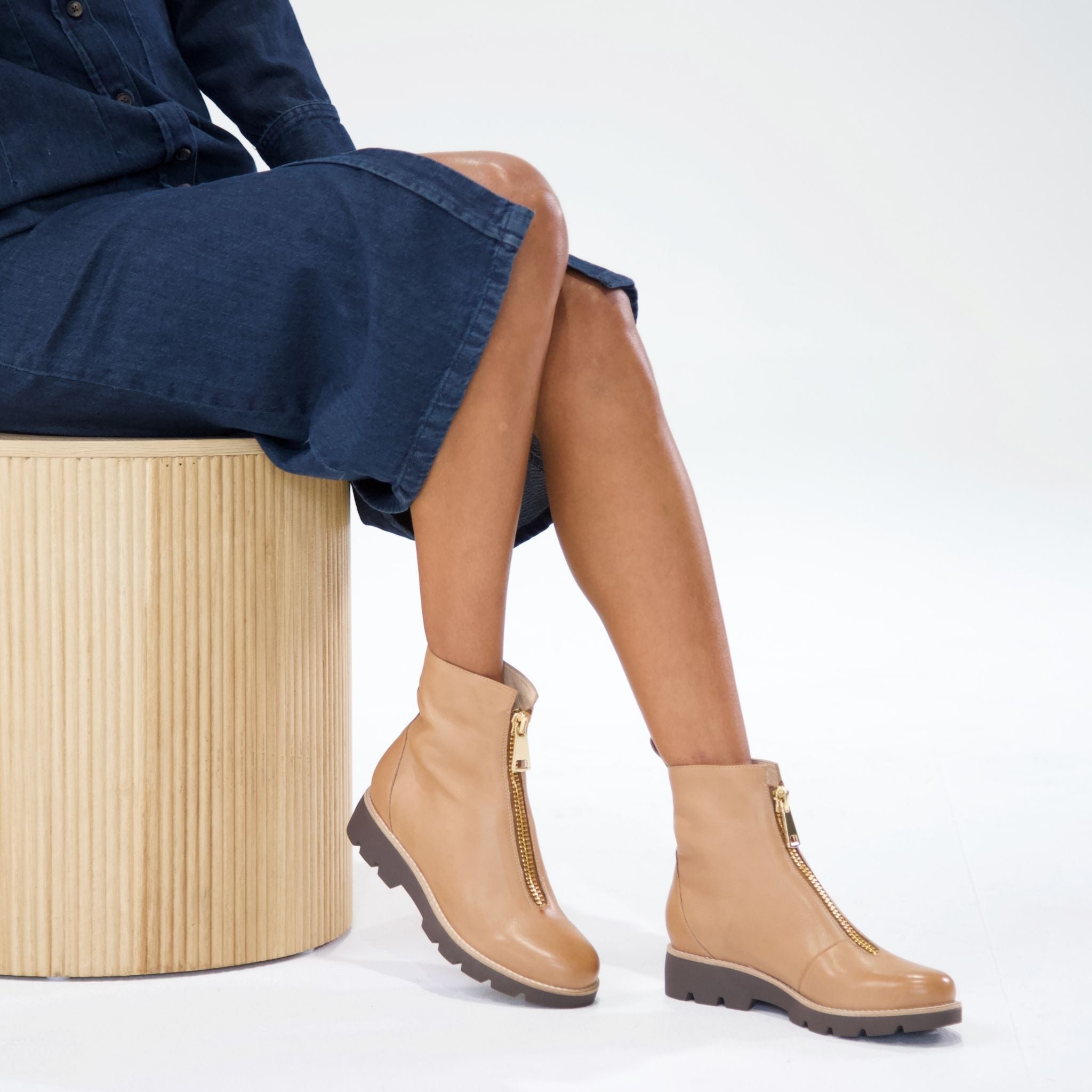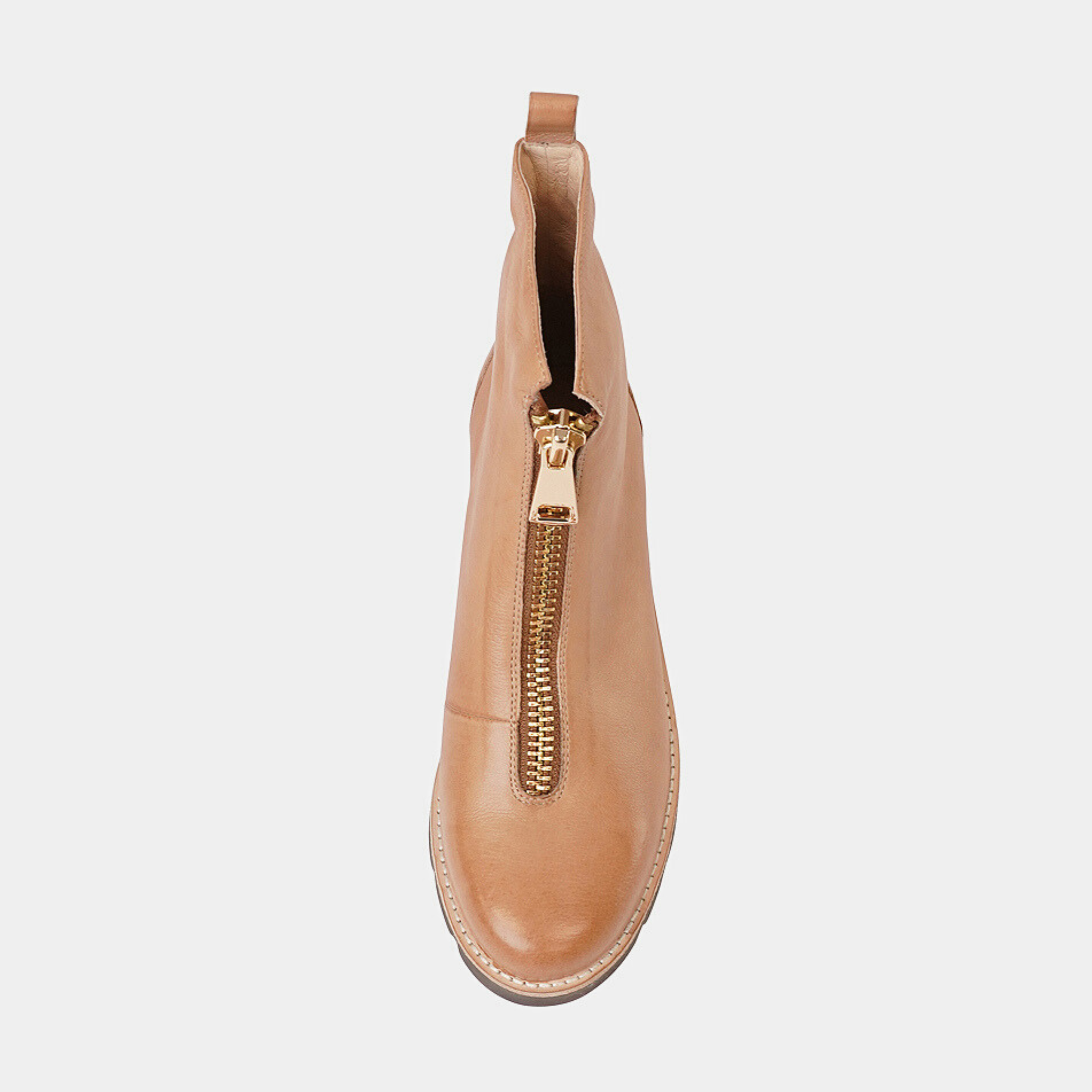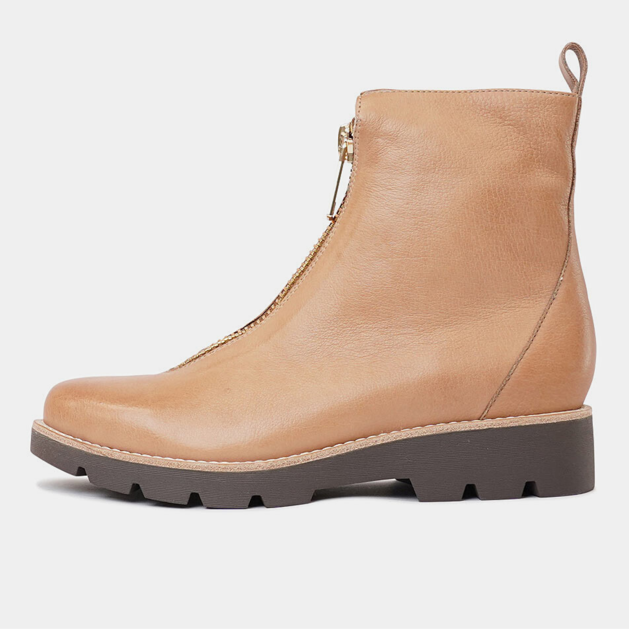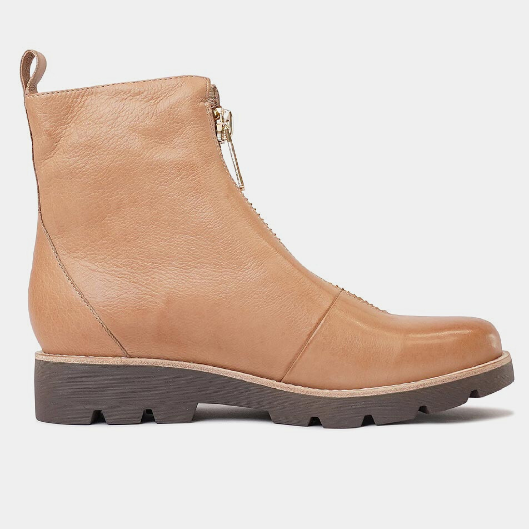 Step into style with the Mieyette Dark Tan Leather Ankle Boots by Top End. Constructed with a leather upper and lining, these boots offer durability and comfort. A chunky rubber sole with 3.5cm grip heel provides a sturdy step, while the functional gold metal zip and pull tab add a touch of elegance. With a cork look strip and padded inner sole, these boots offer both fashion and function.