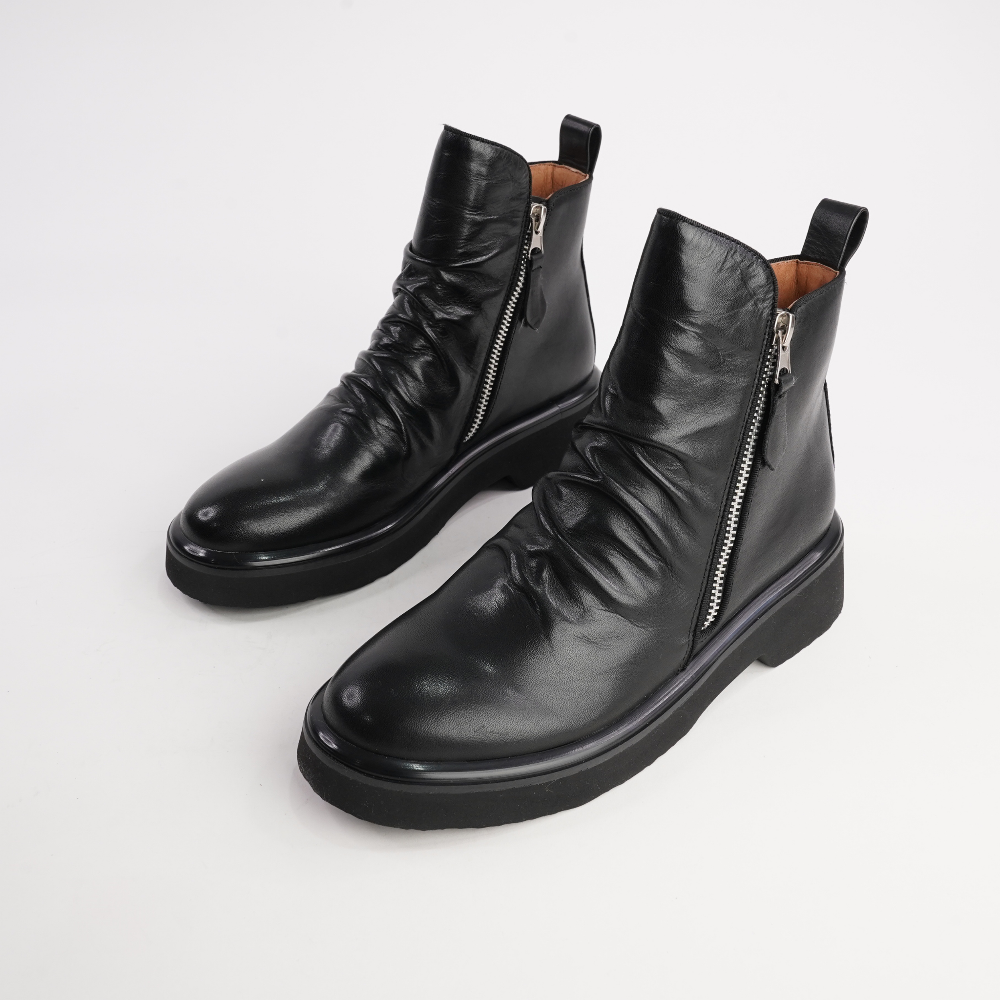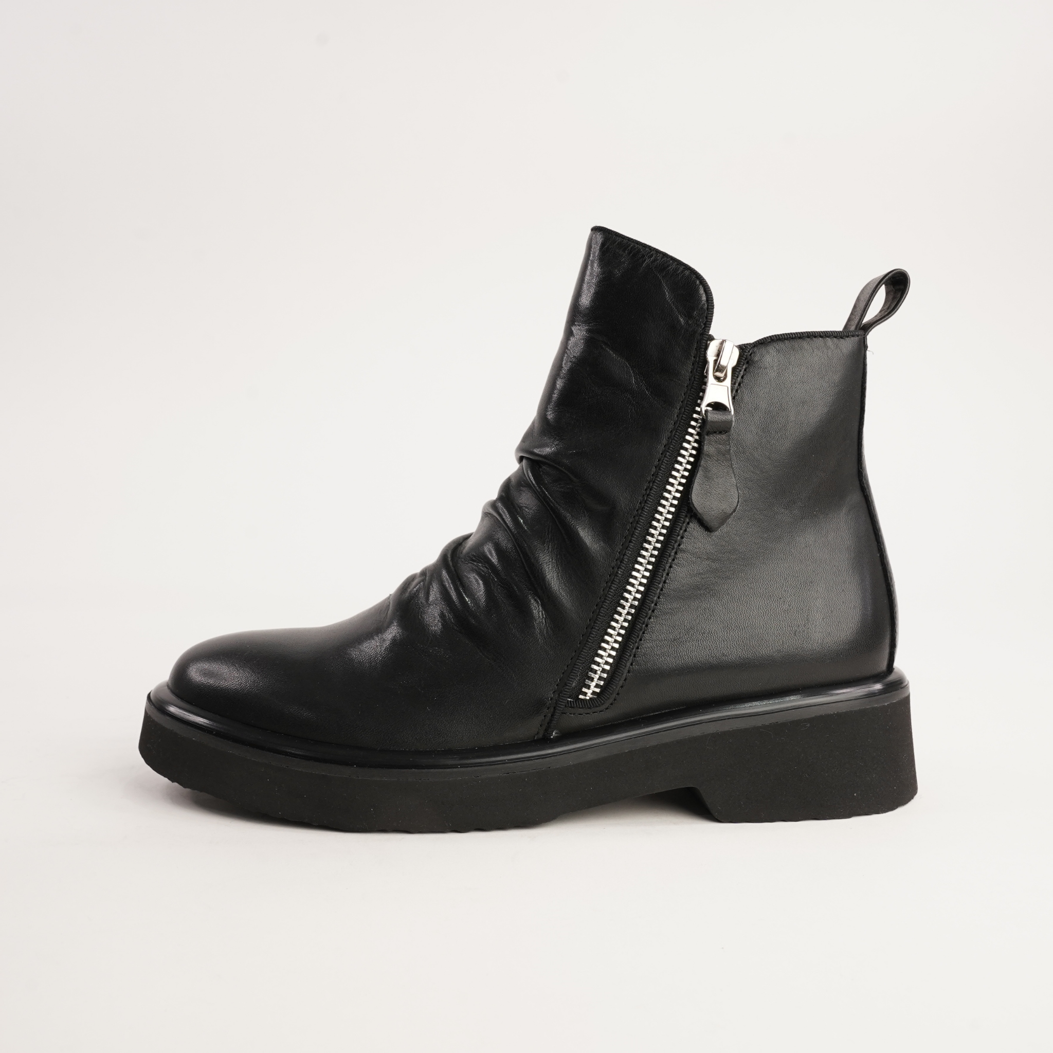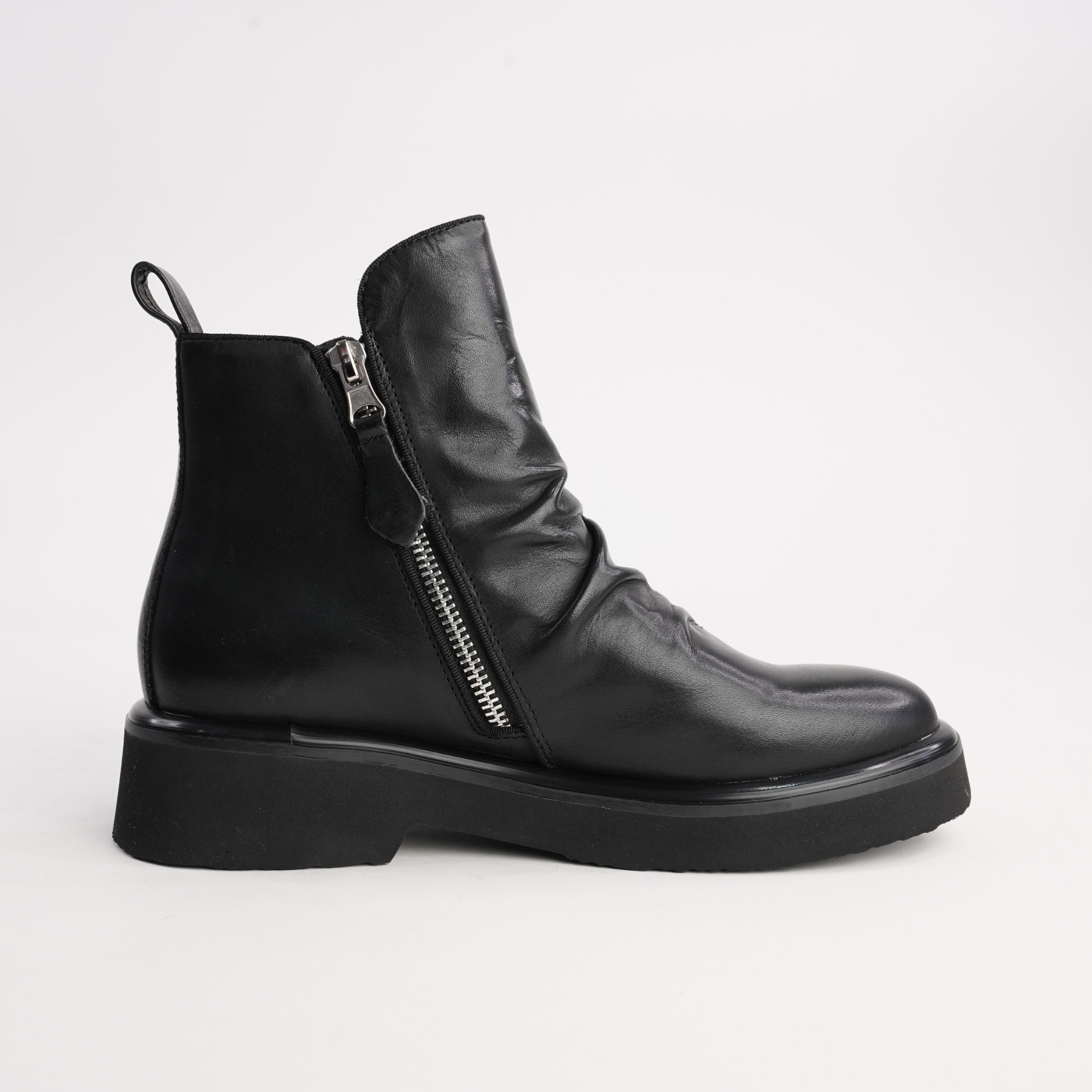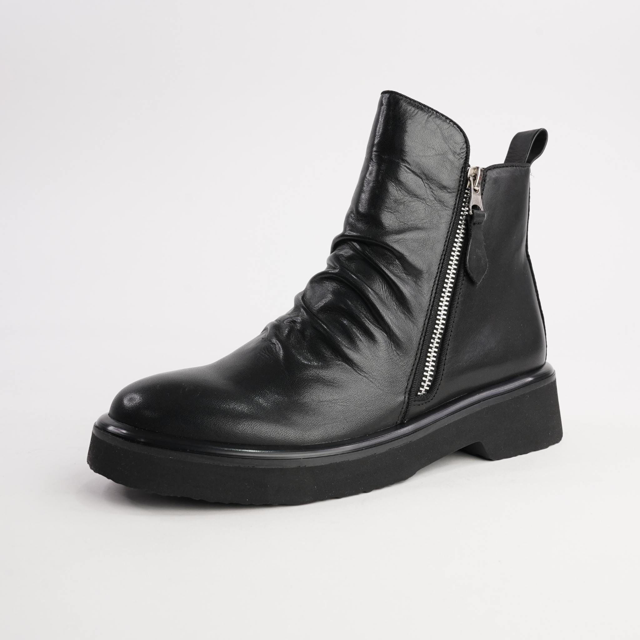 Crafted in rich black leather, the Thea boots combine artisanal texture with everyday ease. A softly ruched front and side zip add style and practicality to this modern mid-ankle boot, perfect for workdays or weekends.