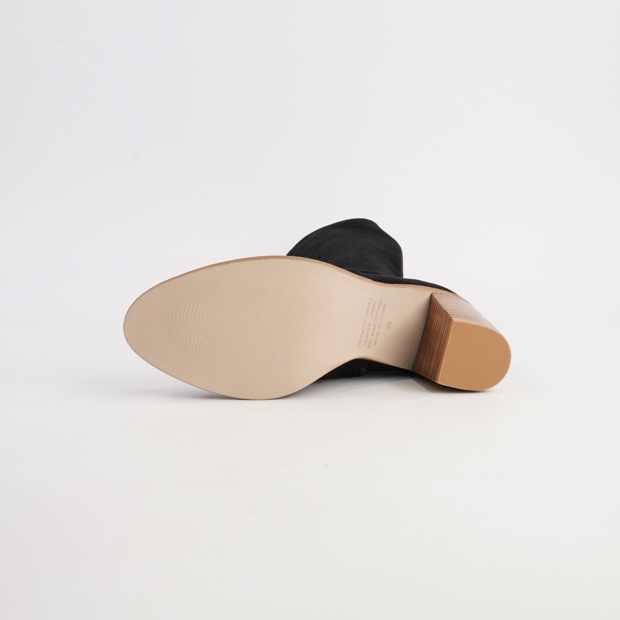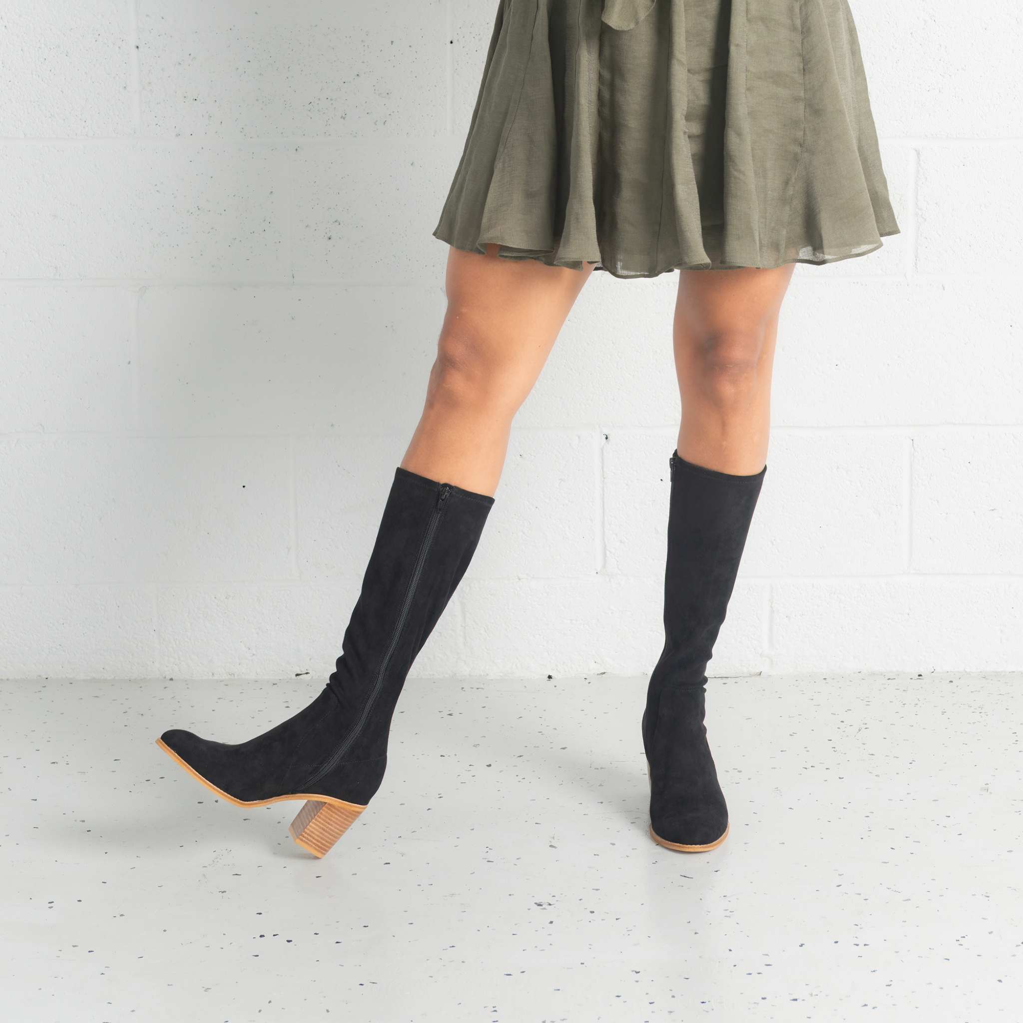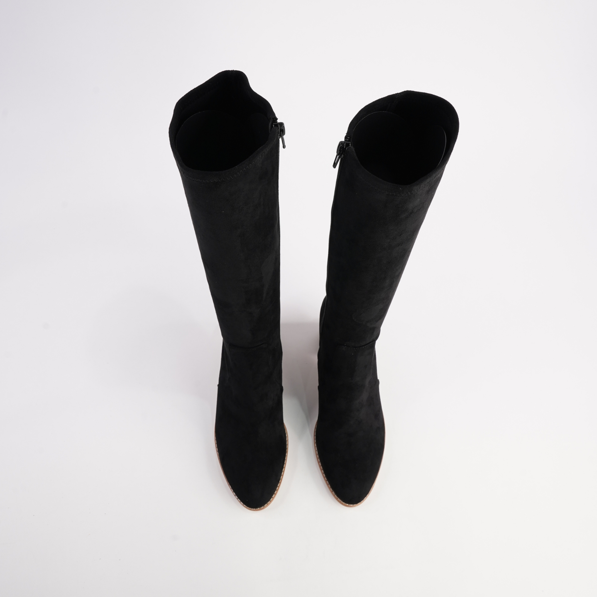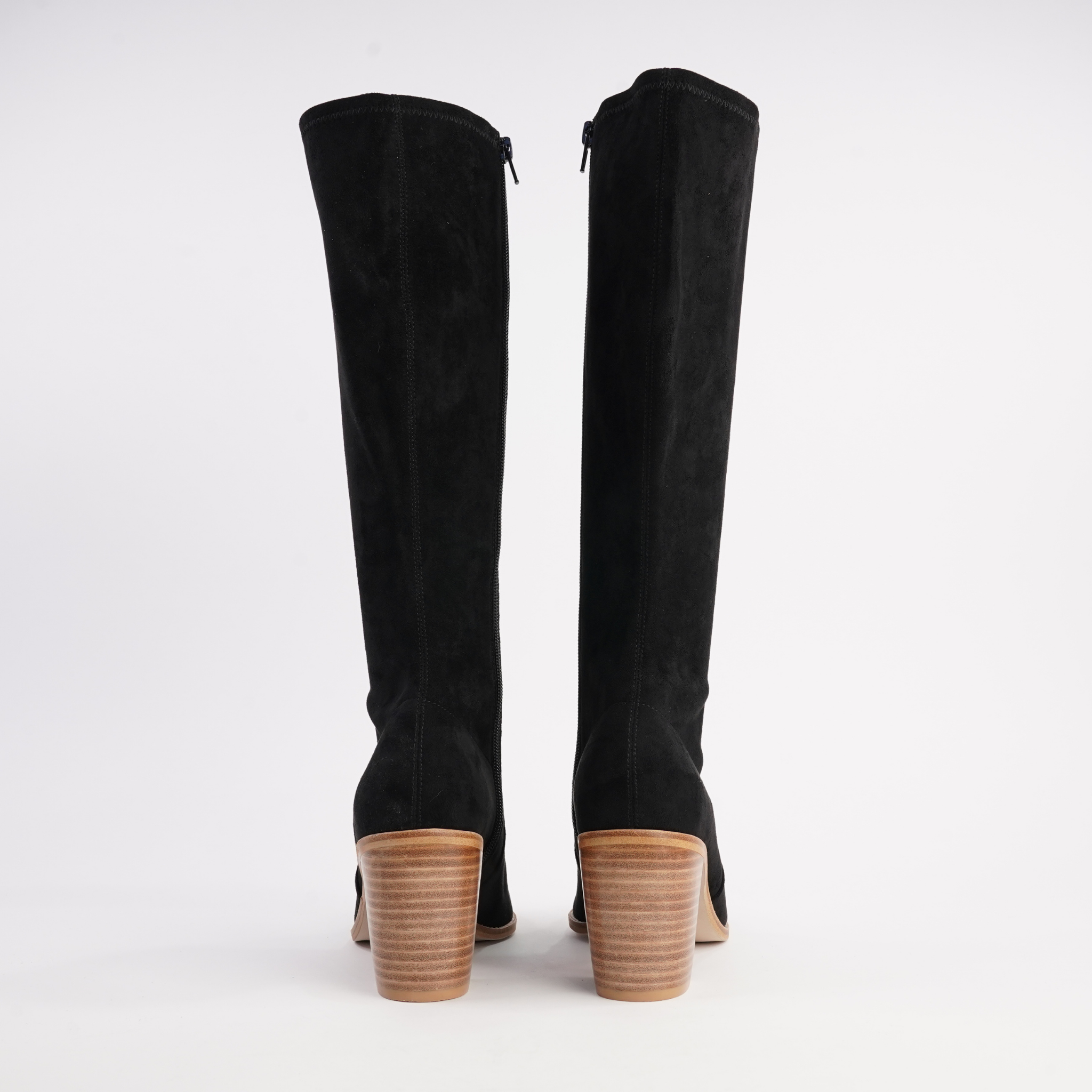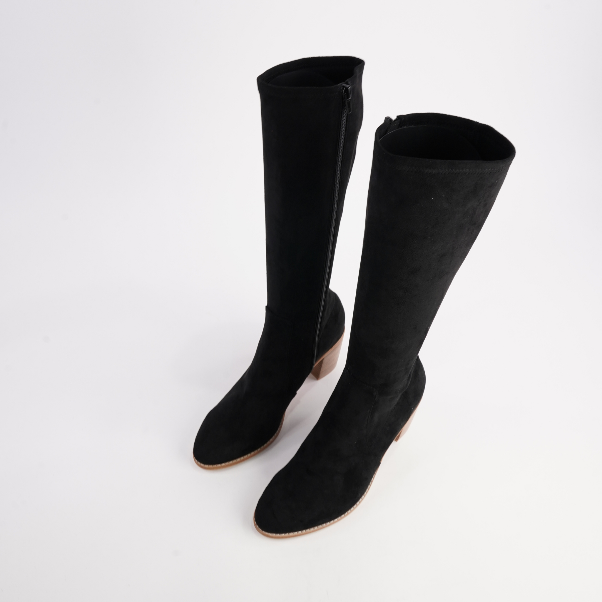 Make a statement with the Tirry Knee High Boots by Top End. The soft black stretch upper hugs the leg like a glove, while the rounded toe and wooden block heel give it a timeless, wearable appeal. From skirts to skinny jeans this boot works with everything.