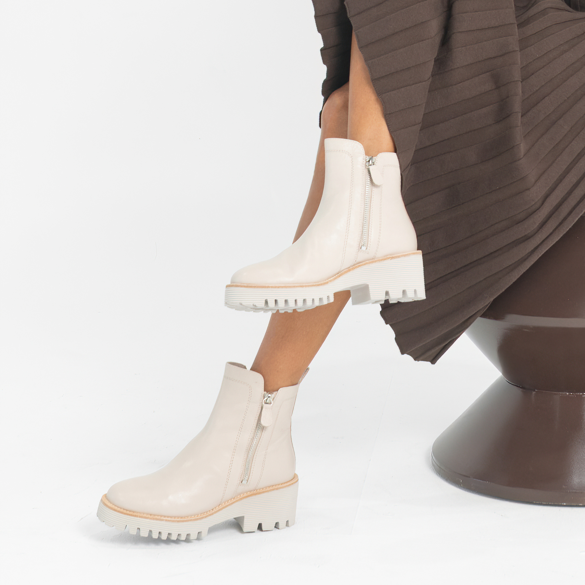 The Waizey Nougat Leather Ankle Boots by Django & Juliette are the perfect fusion of practicality and style. With a sleek leather finish, sturdy block heel, and rugged lug sole, these boots offer a modern twist on a classic silhouette. Double zippers make them easy to slip on and off.