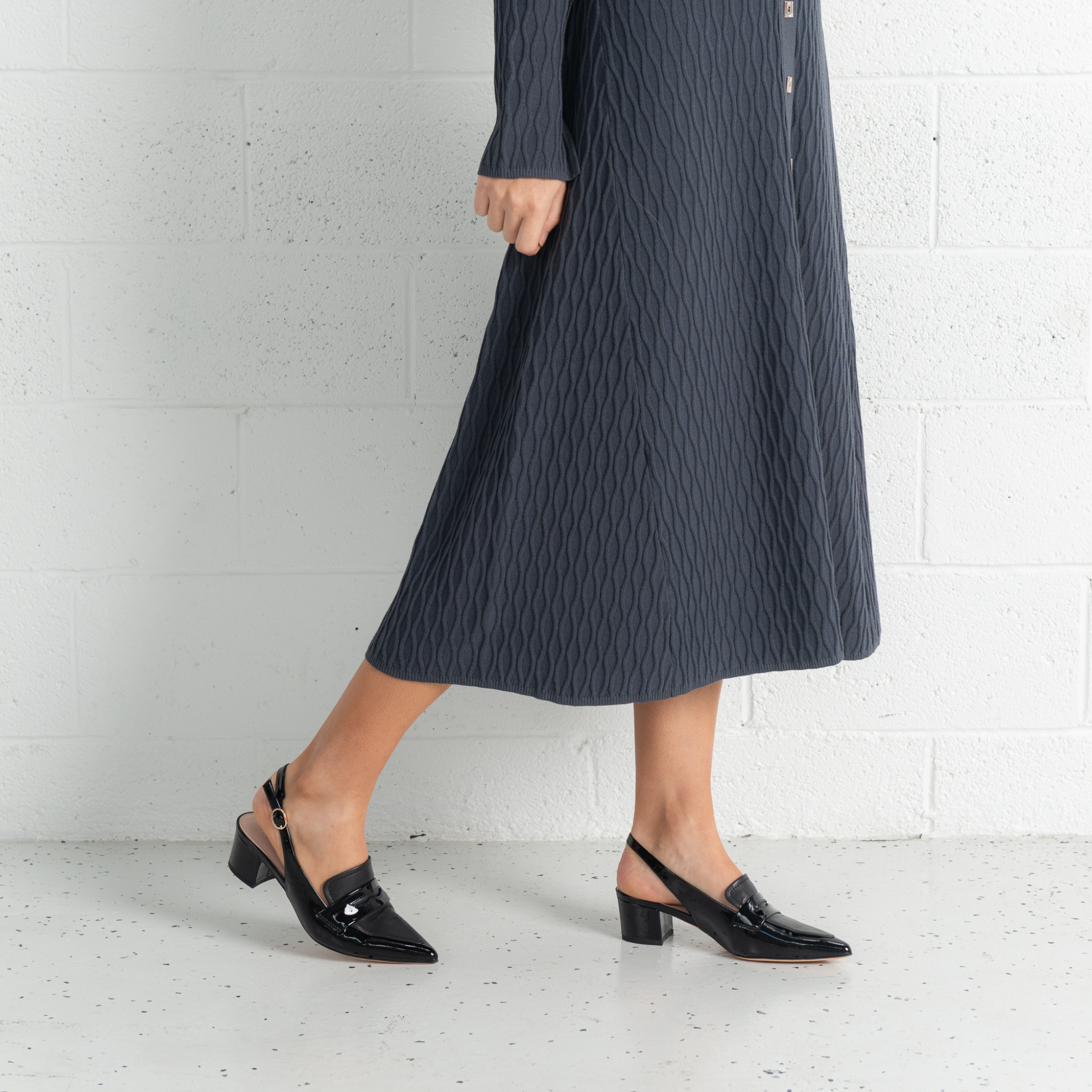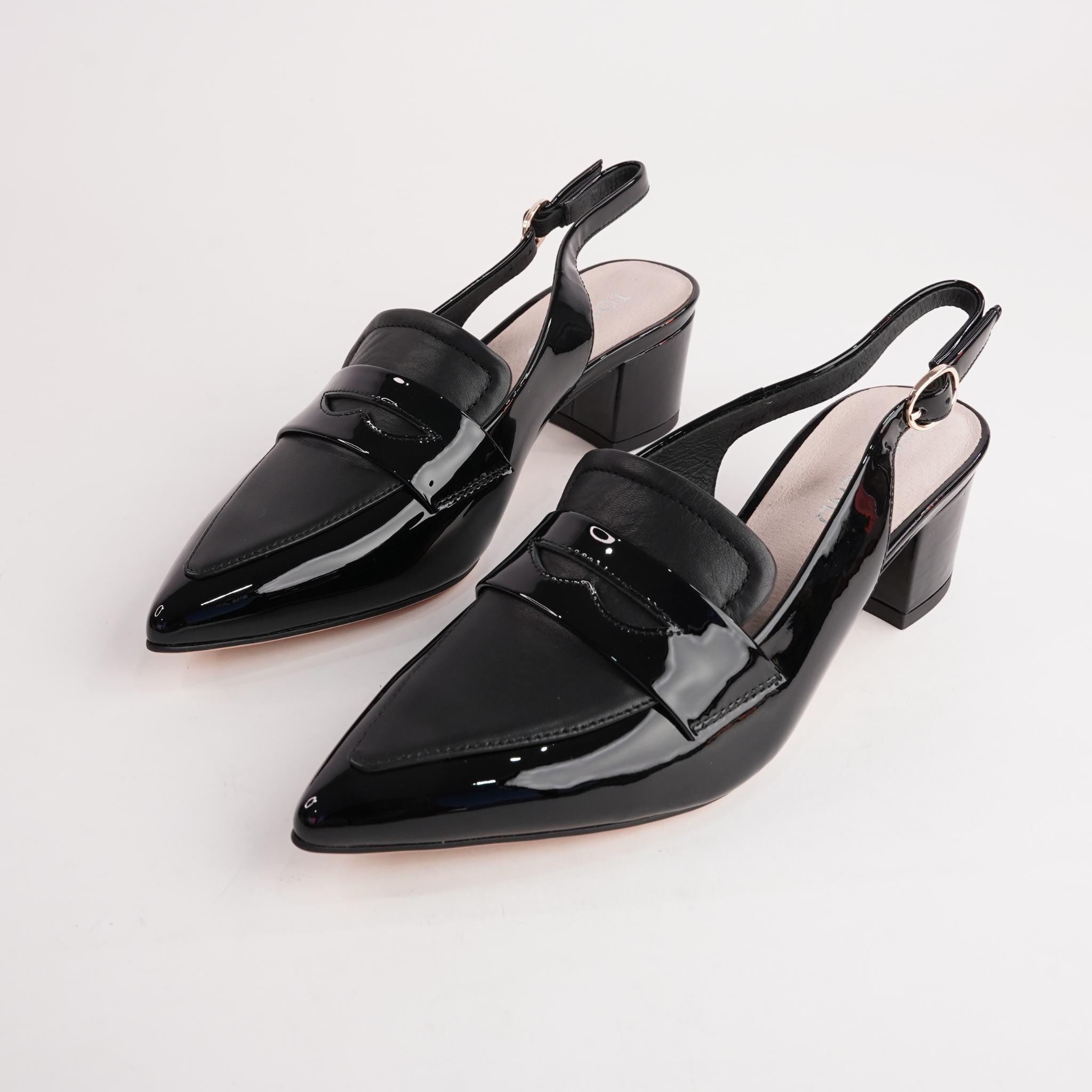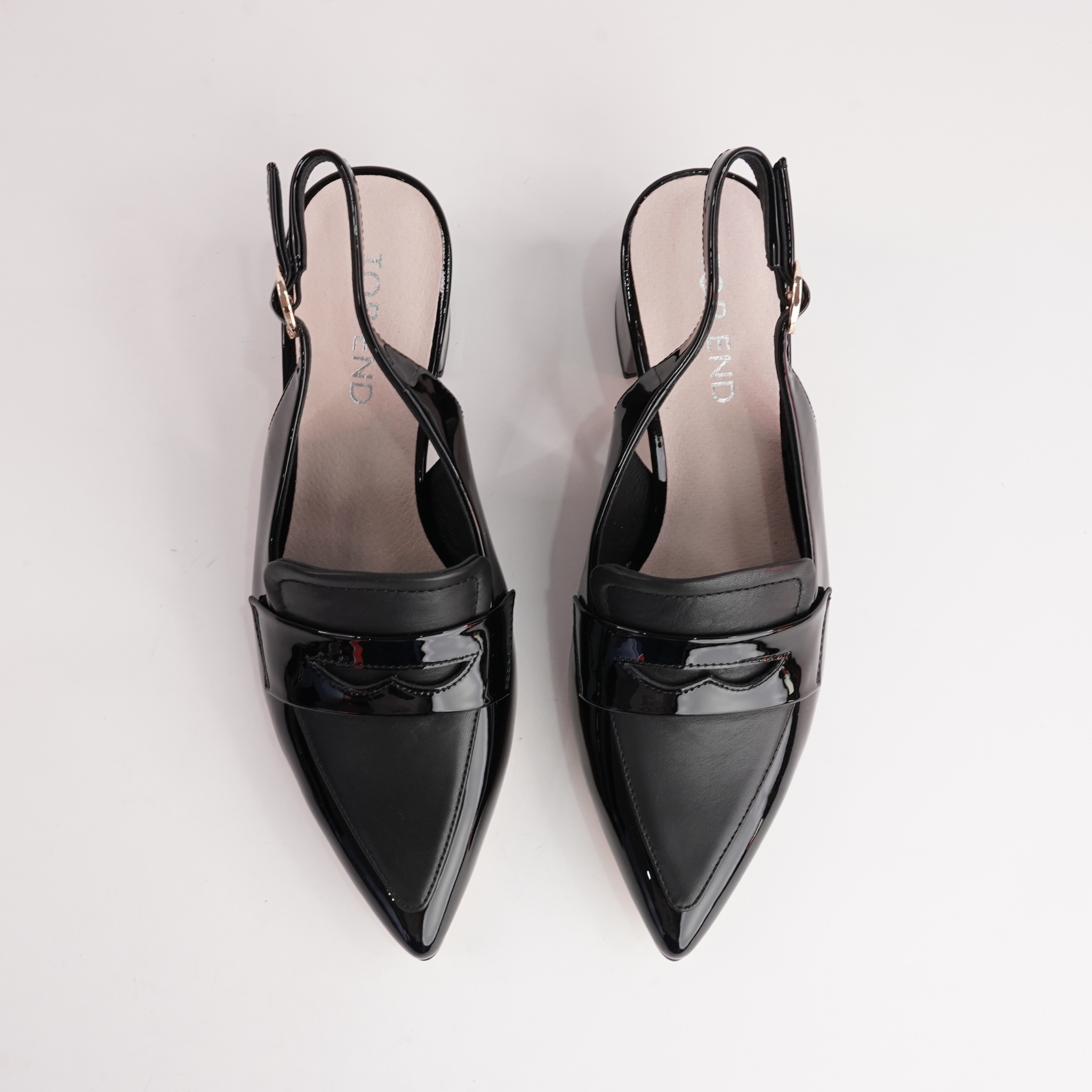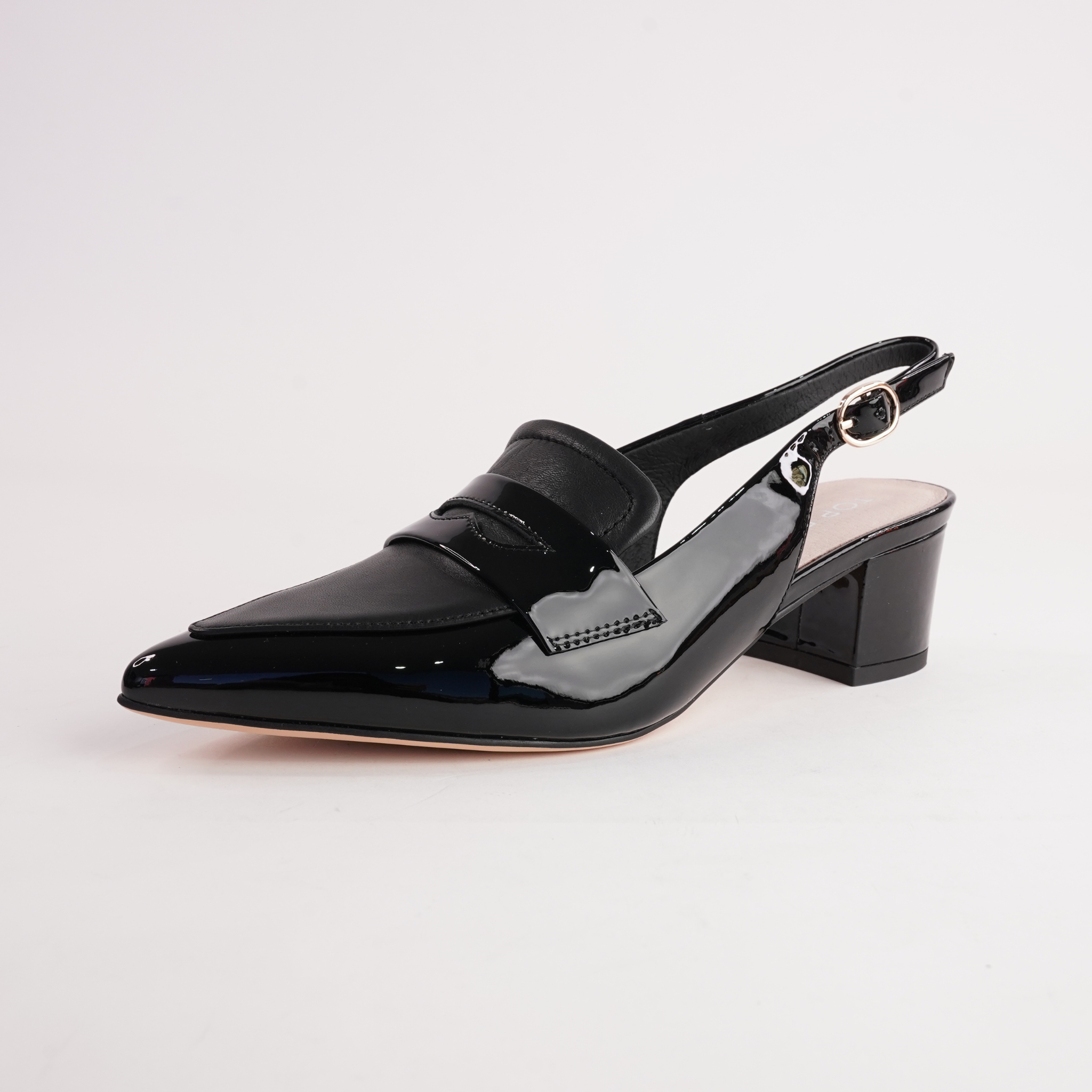 Step up your style game in the Aidayo Slingback Heels by Top End. With a pointed toe, black patent leather, and a secure buckle strap, these modern loafers-meet-heels are ideal for making a polished statement from desk to dinner.