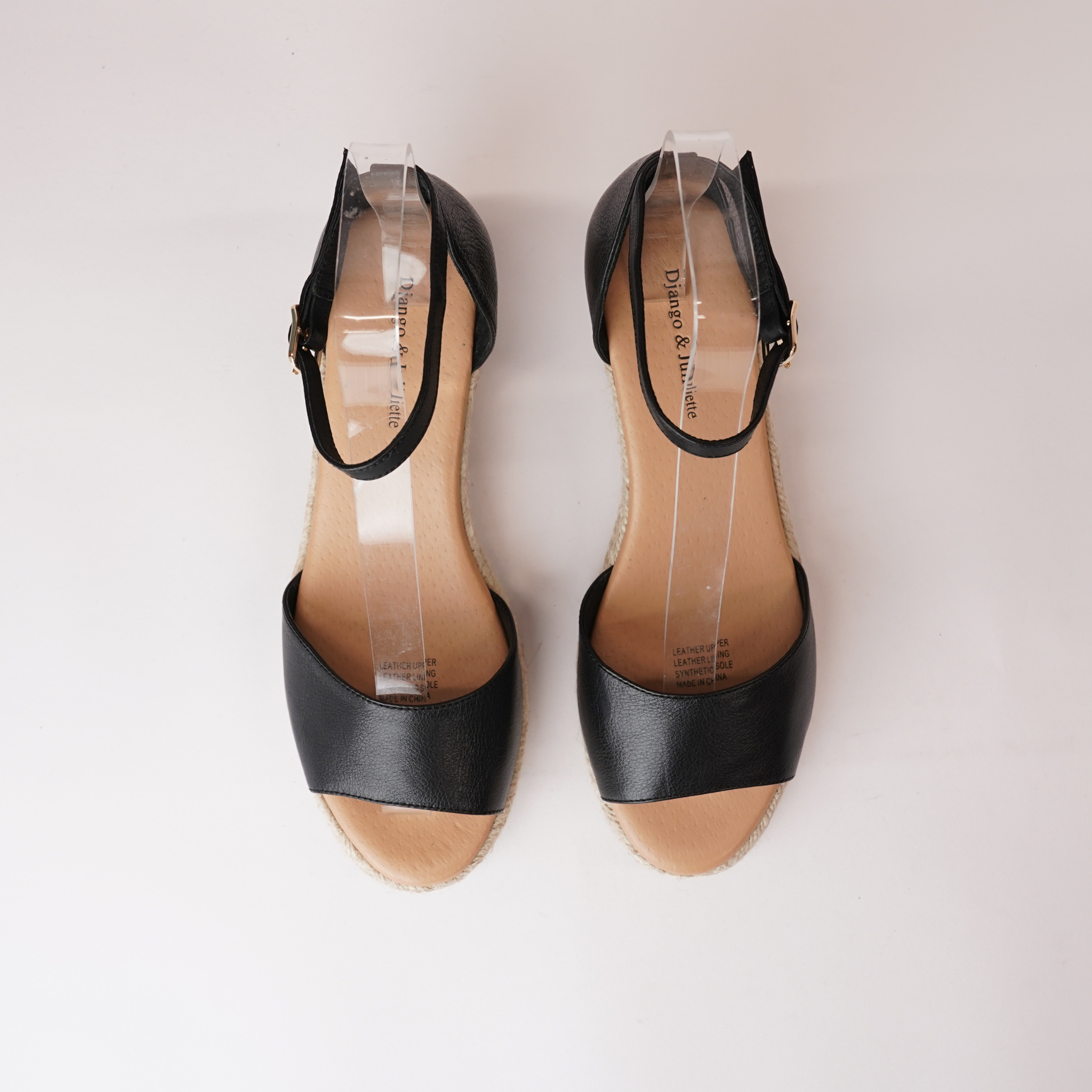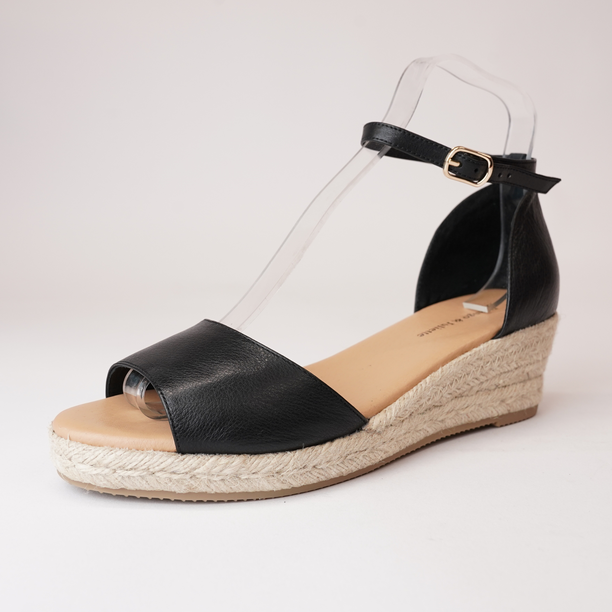 The Skip Black Leather Espadrille Wedges by Django & Juliette feature a sleek black leather upper and classic espadrille sole. With a mid-height wedge and adjustable ankle strap, they provide both style and comfort, perfect for warm-weather occasions.