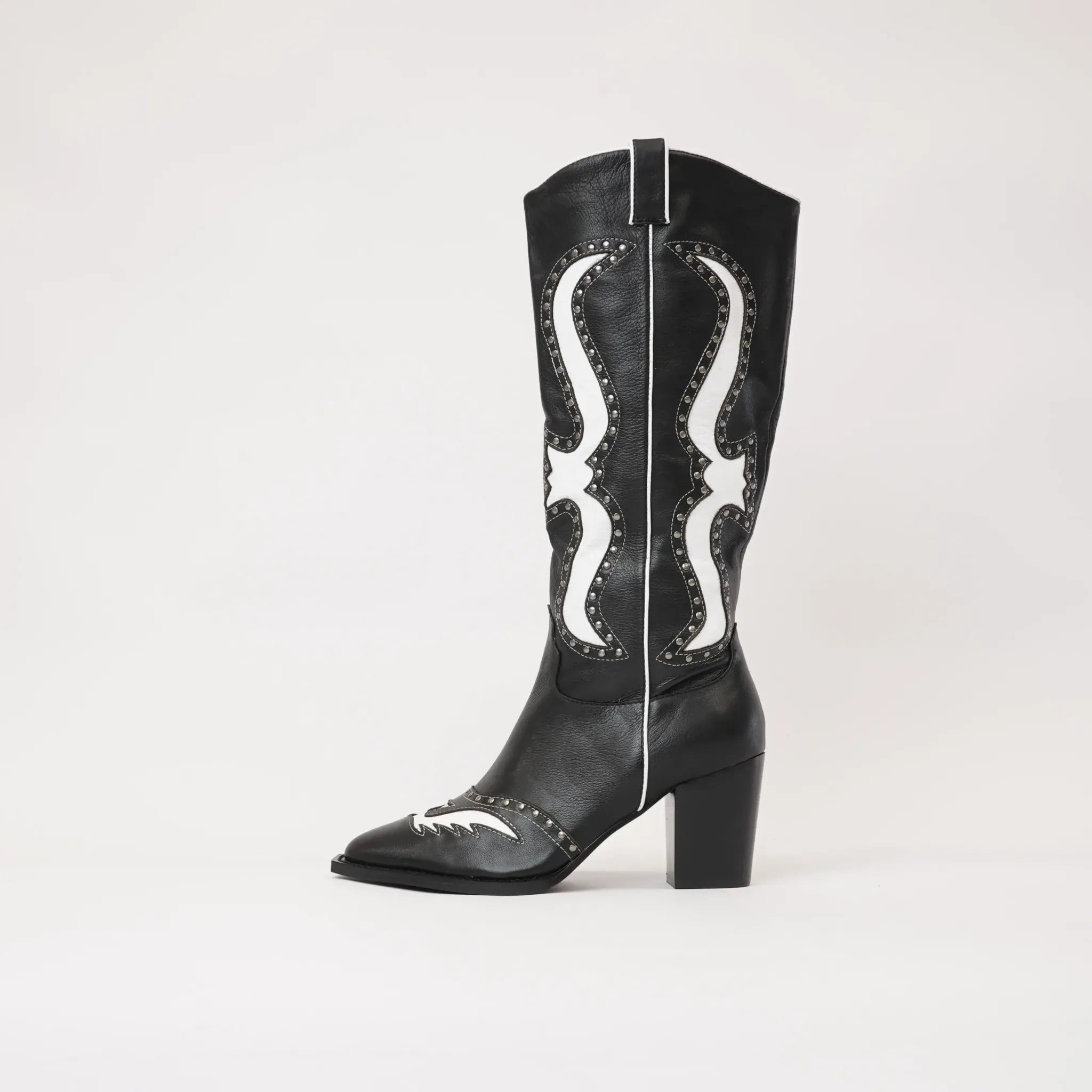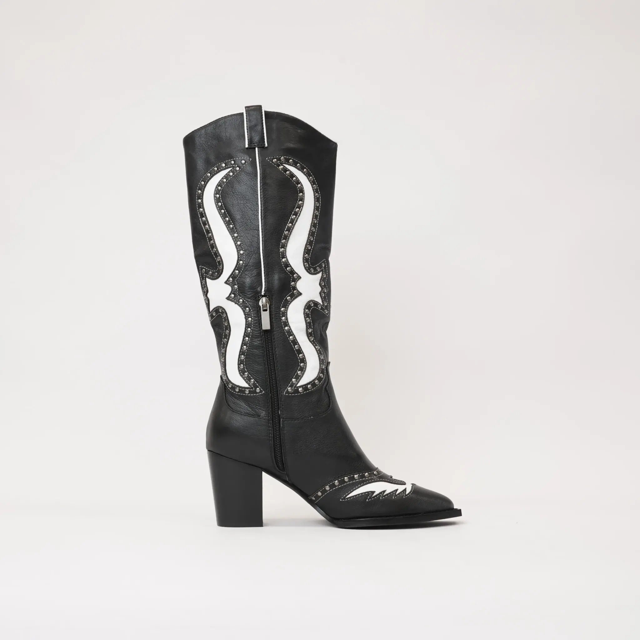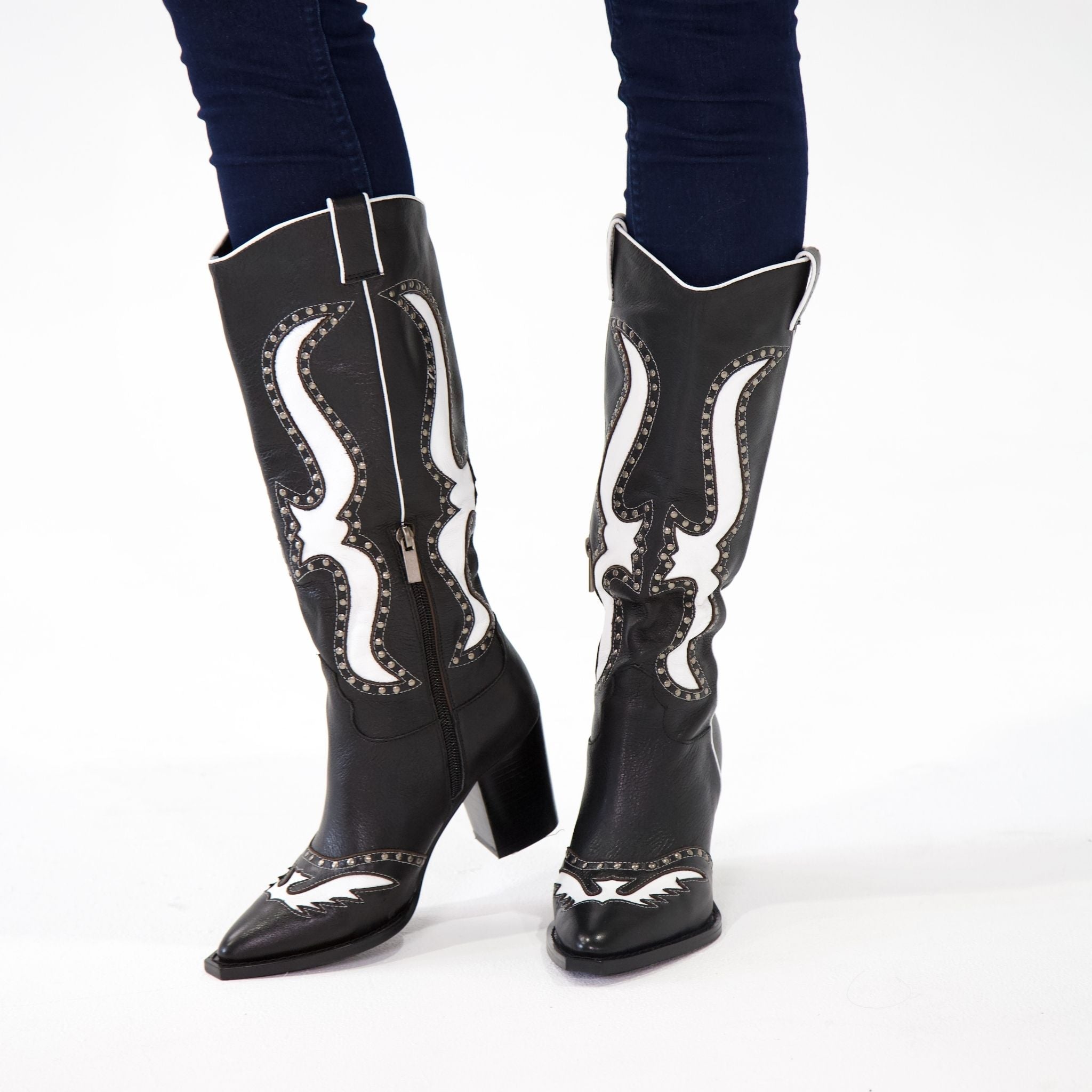 Saddle up with Mollini's Lurva Black/White Leather Knee High Boots, the perfect blend of Western style and sleek sophistication. These knee-highs feature a leather upper, padded insole, and functional metal zip for easy on-and-off. But the real star is the studded and cut leather design, adding a playful touch to any outfit.