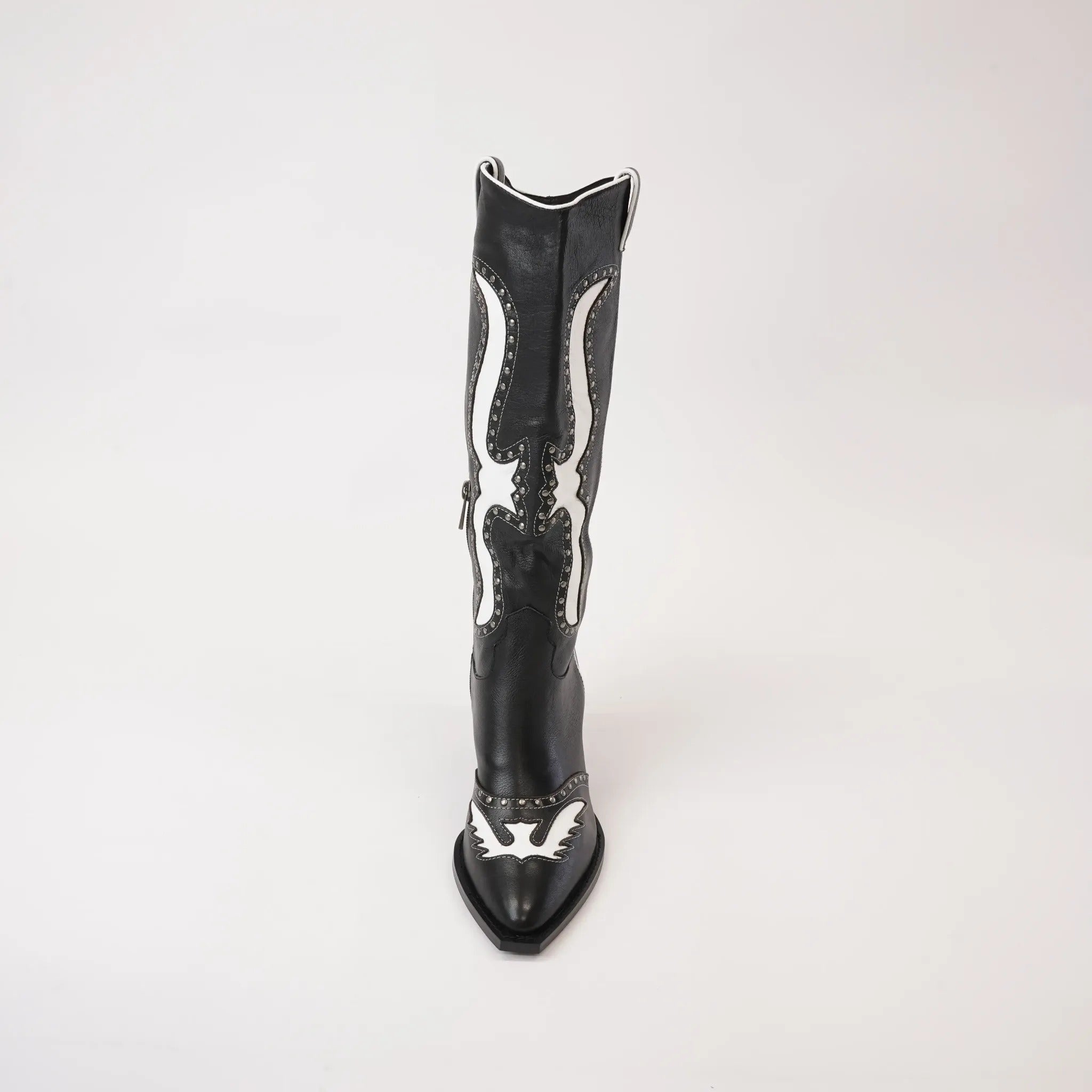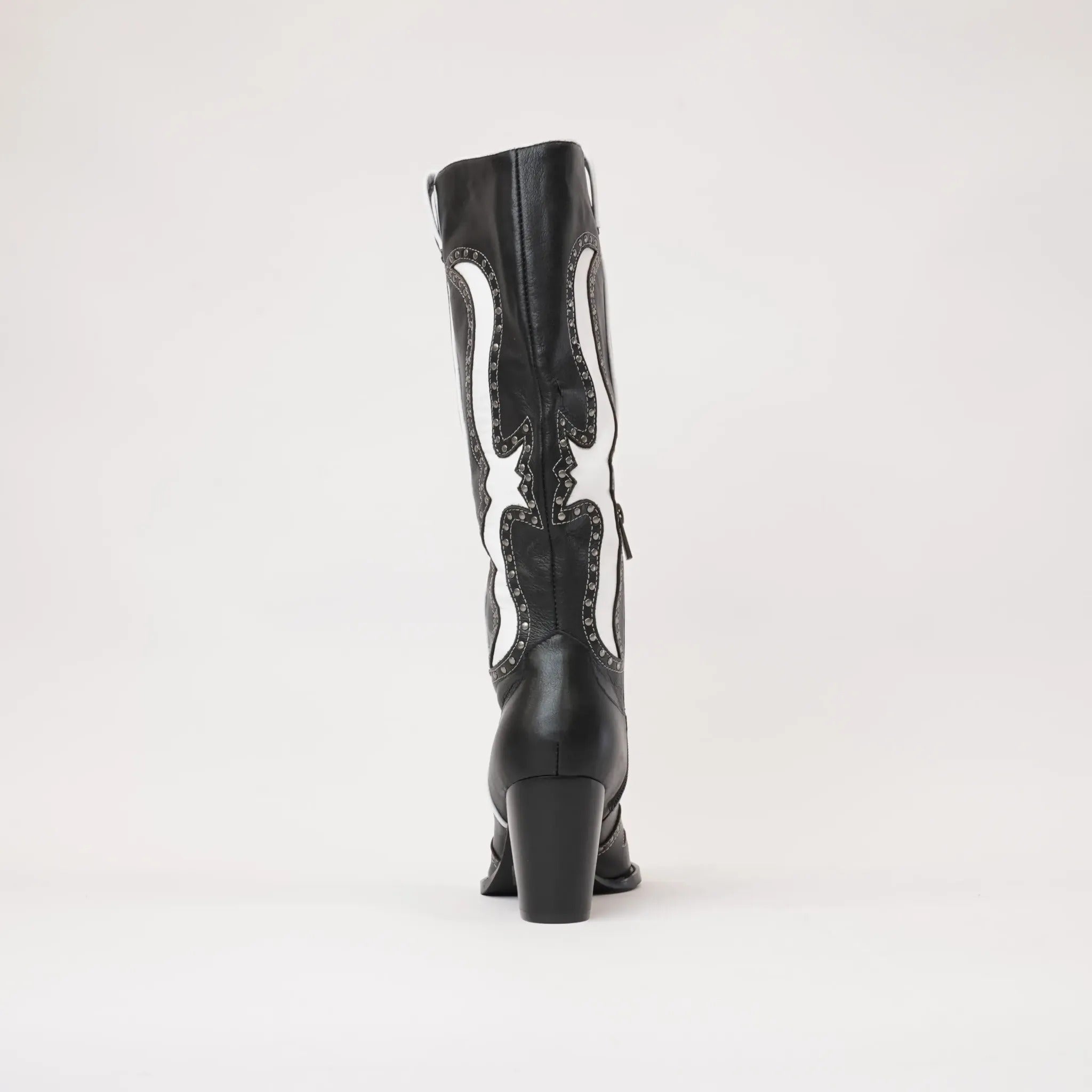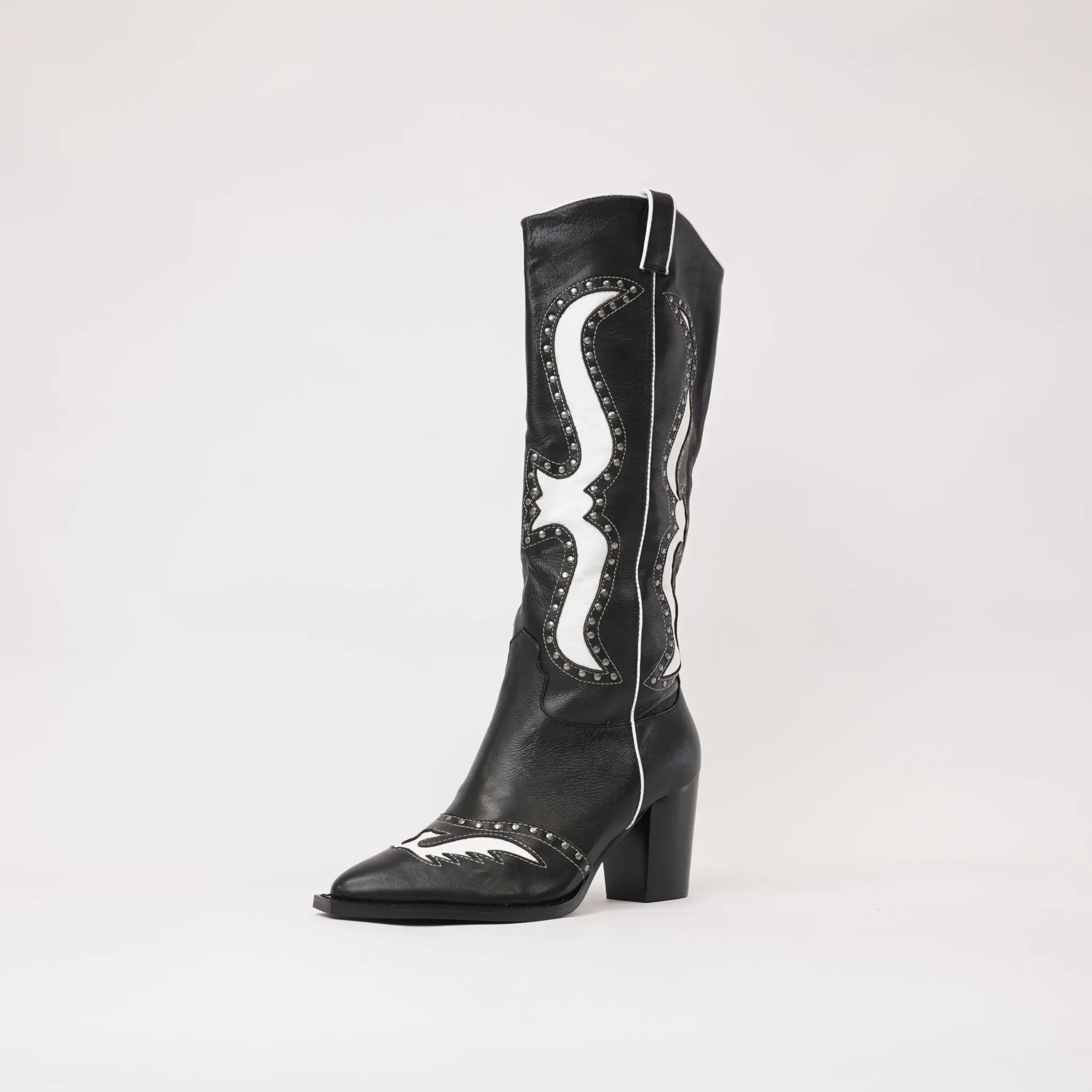 Saddle up with Mollini's Lurva Black/White Leather Knee High Boots, the perfect blend of Western style and sleek sophistication. These knee-highs feature a leather upper, padded insole, and functional metal zip for easy on-and-off. But the real star is the studded and cut leather design, adding a playful touch to any outfit.
